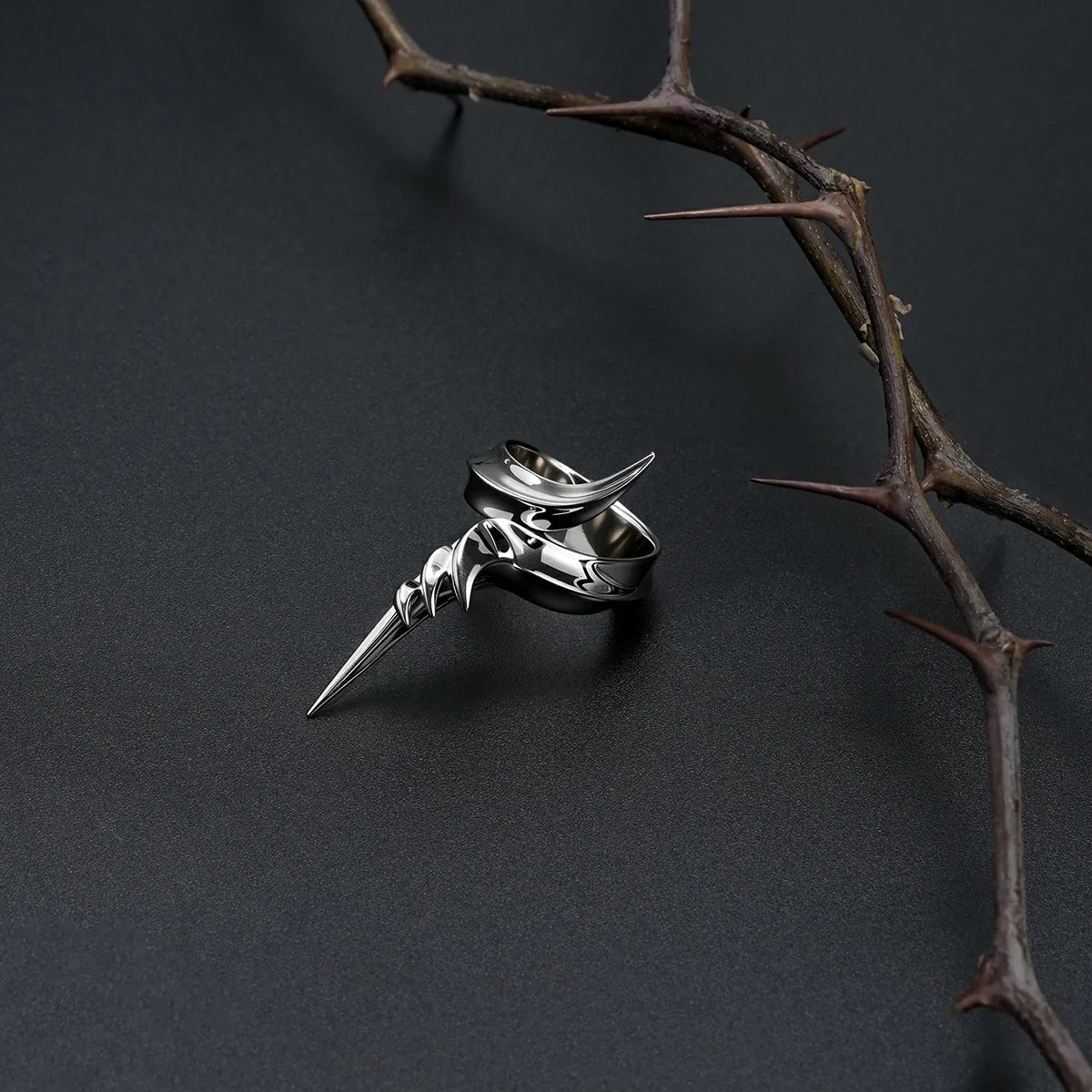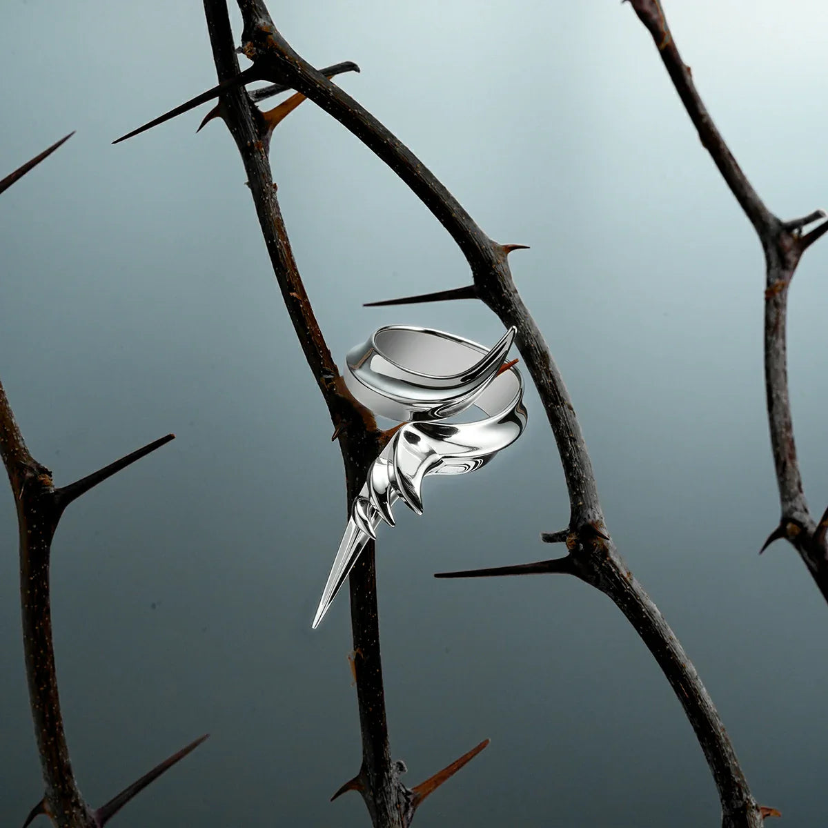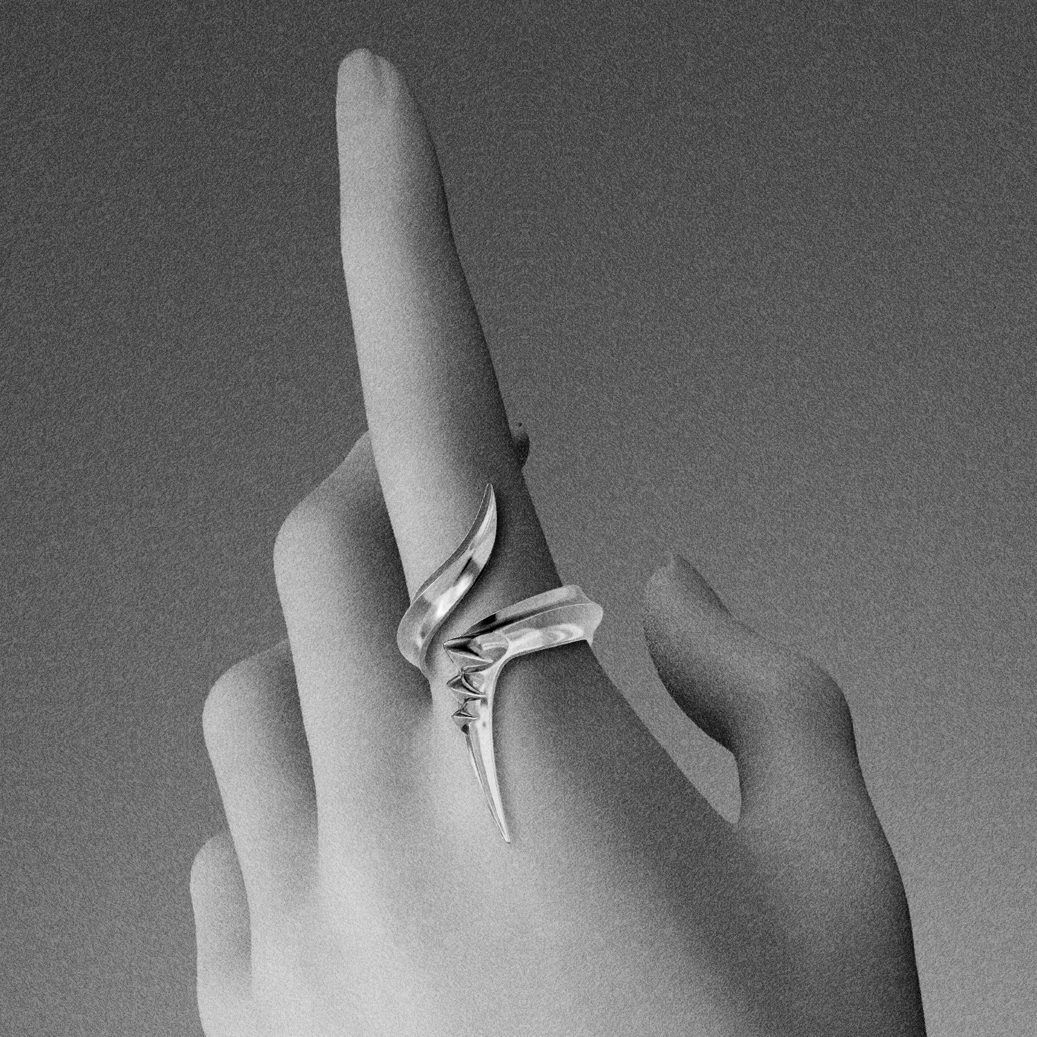 The Blade Crest Spiral Ring coils into a raised ridge and tapered spike. Clean planes, tight lines, presence held close. The inner band stays smooth; the profile reads engineered, not ornate.