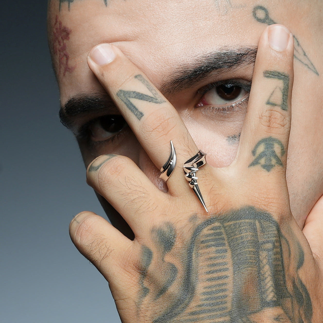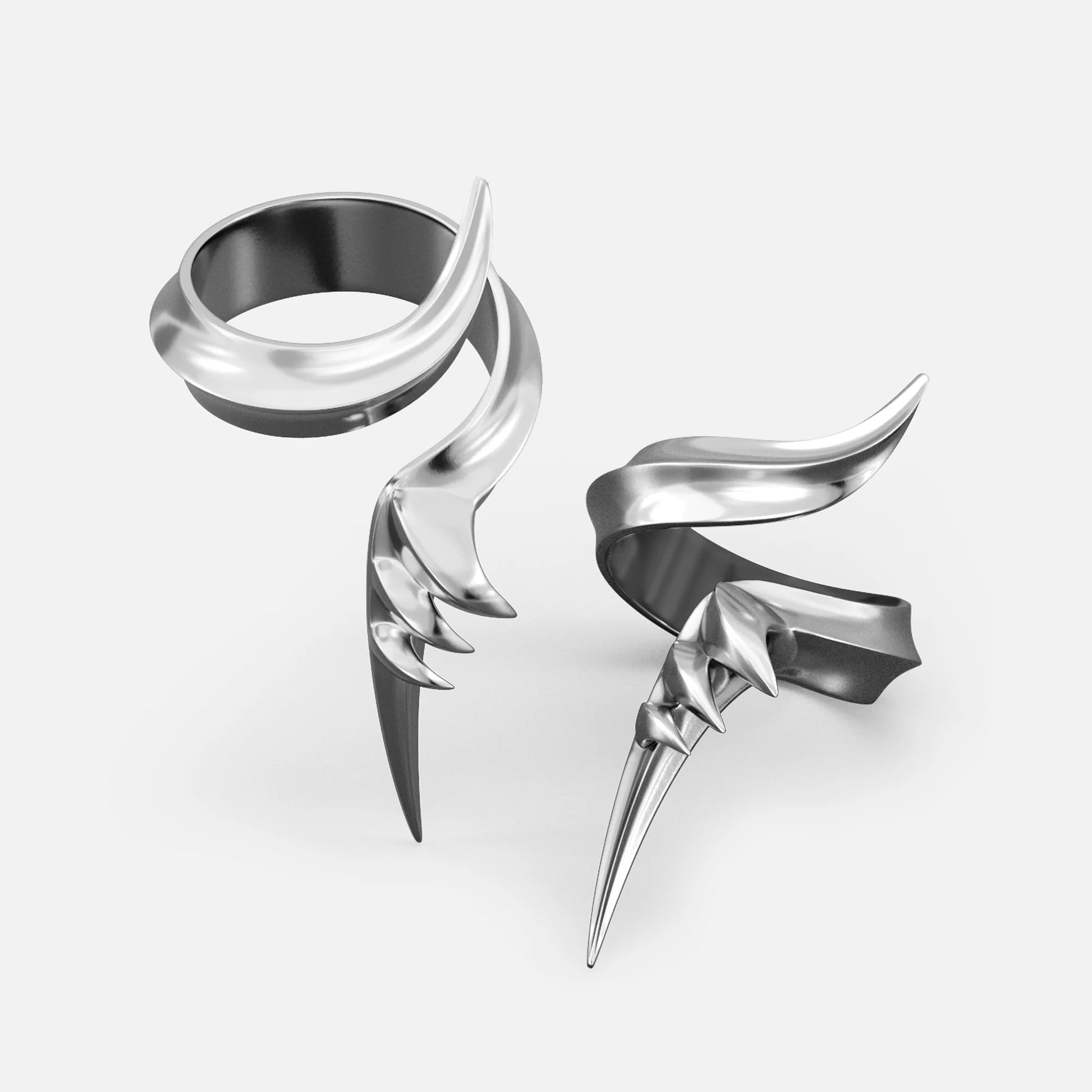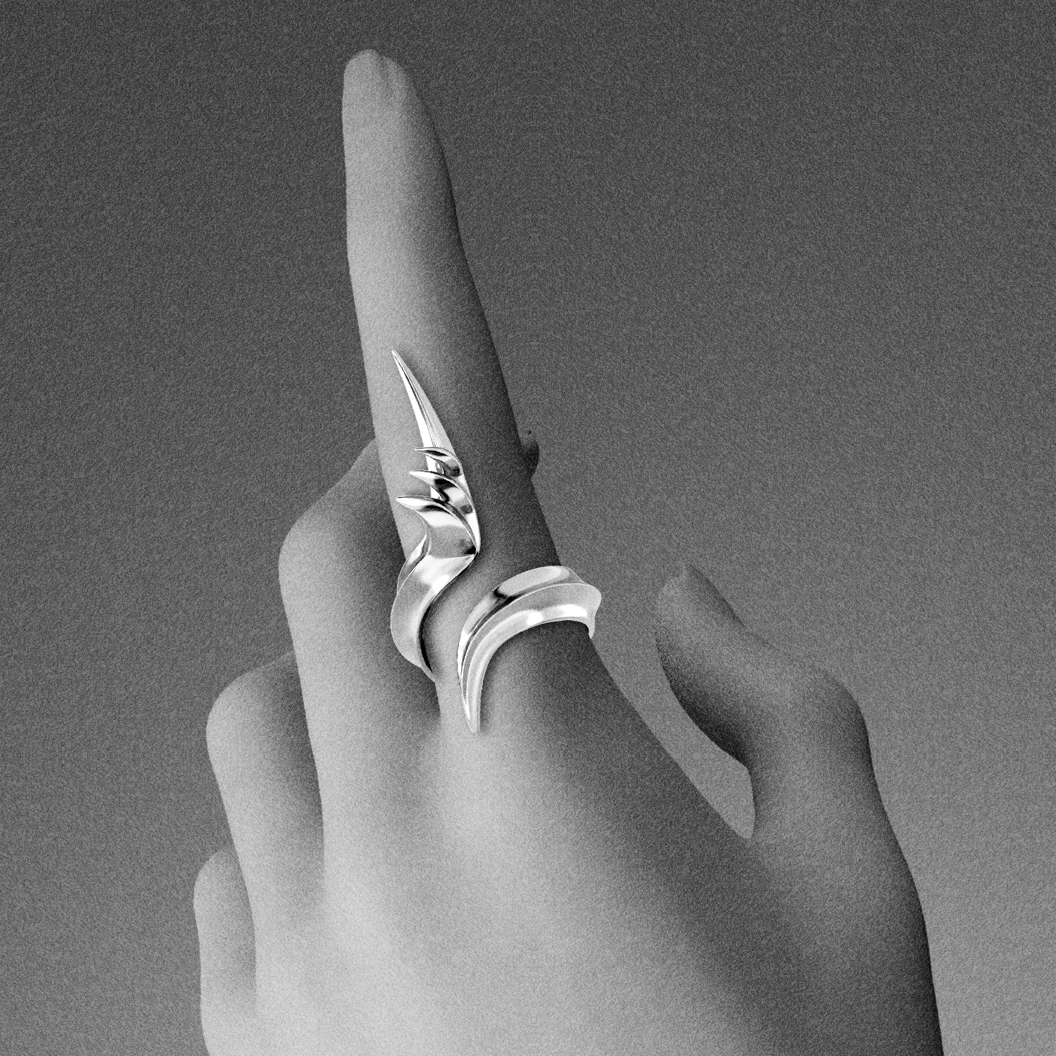 The Blade Crest Spiral Ring coils into a raised ridge and tapered spike. Clean planes, tight lines, presence held close. The inner band stays smooth; the profile reads engineered, not ornate.