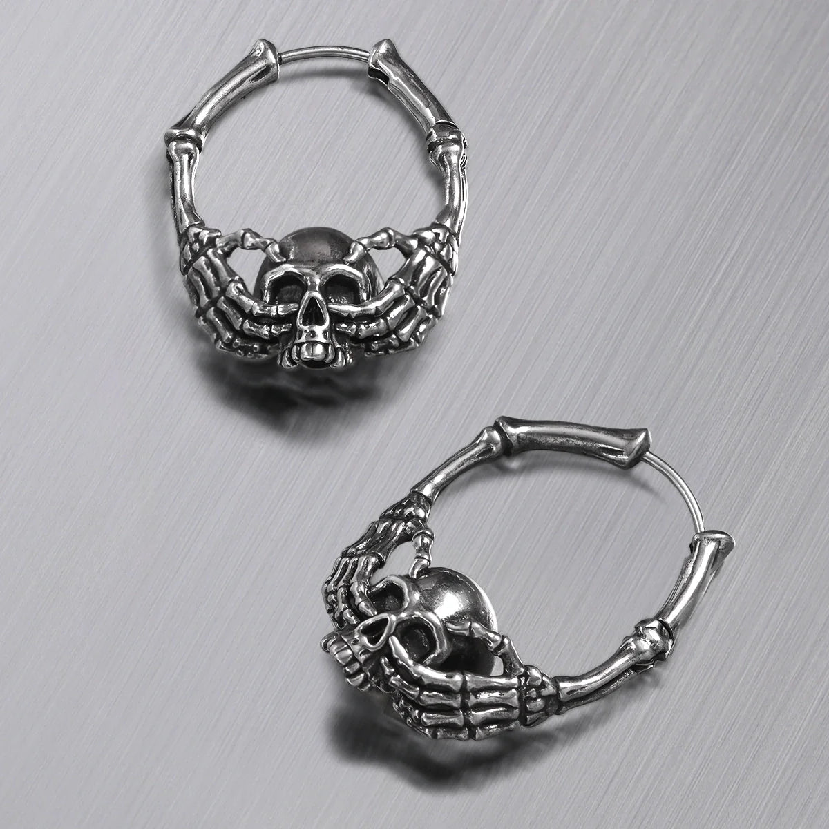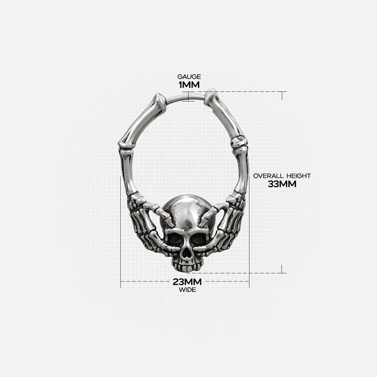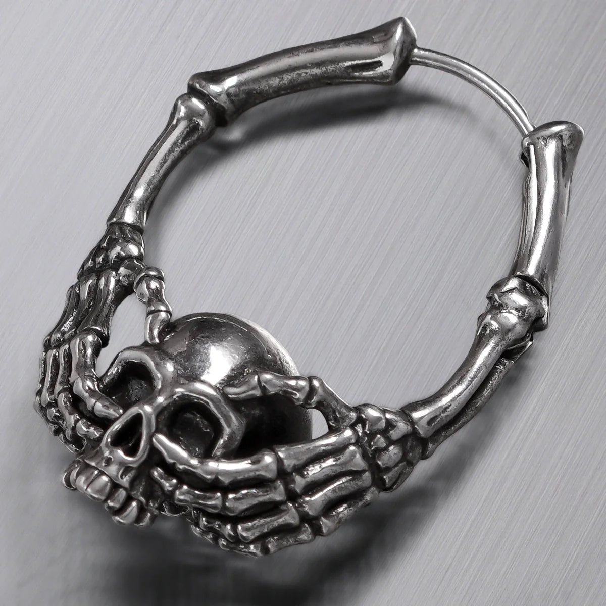 Bonegrip Skull Earrings feature hoop-like skeletal arms gripping a detailed skull, cast in antique silver with shadowed depth. This item is sold as a pair.