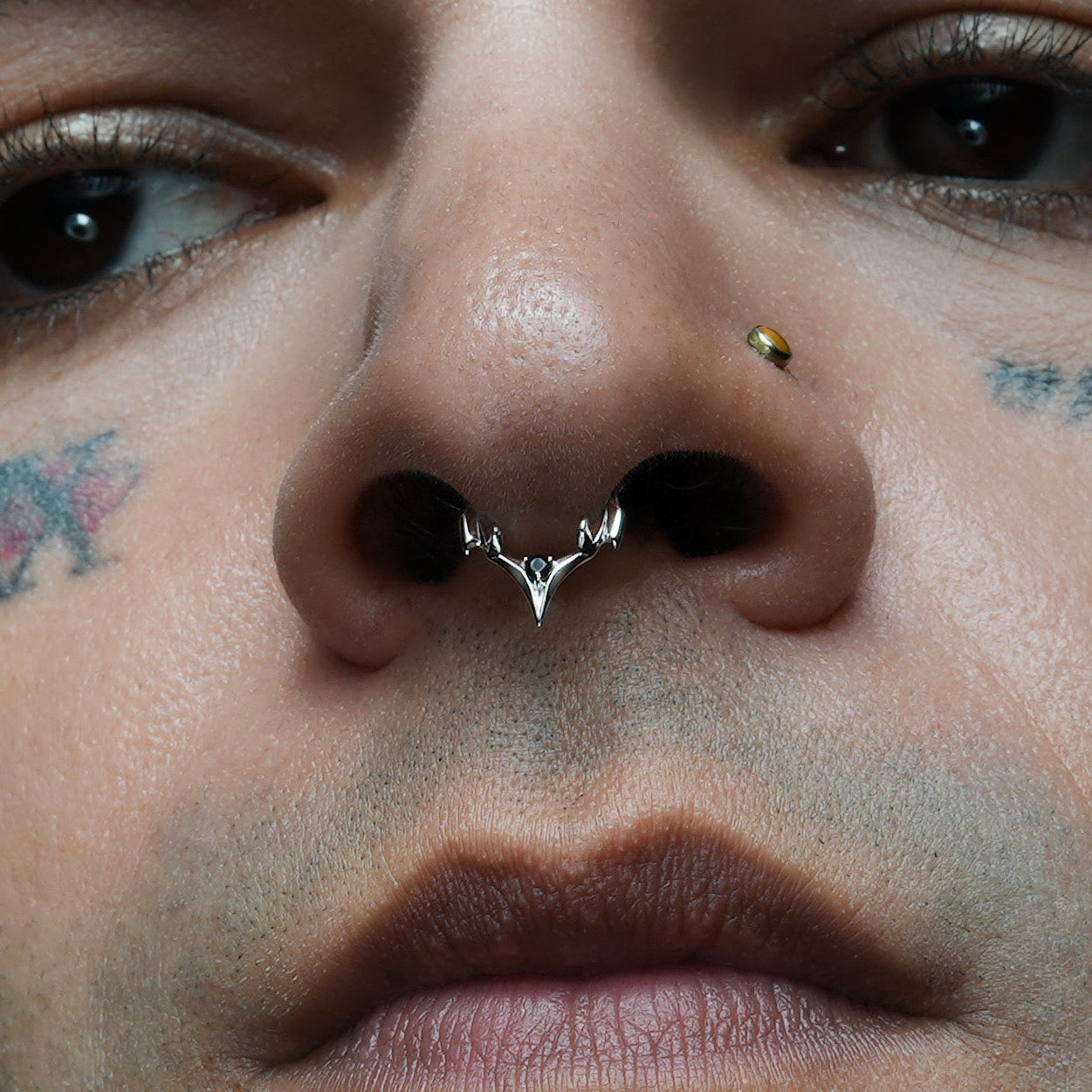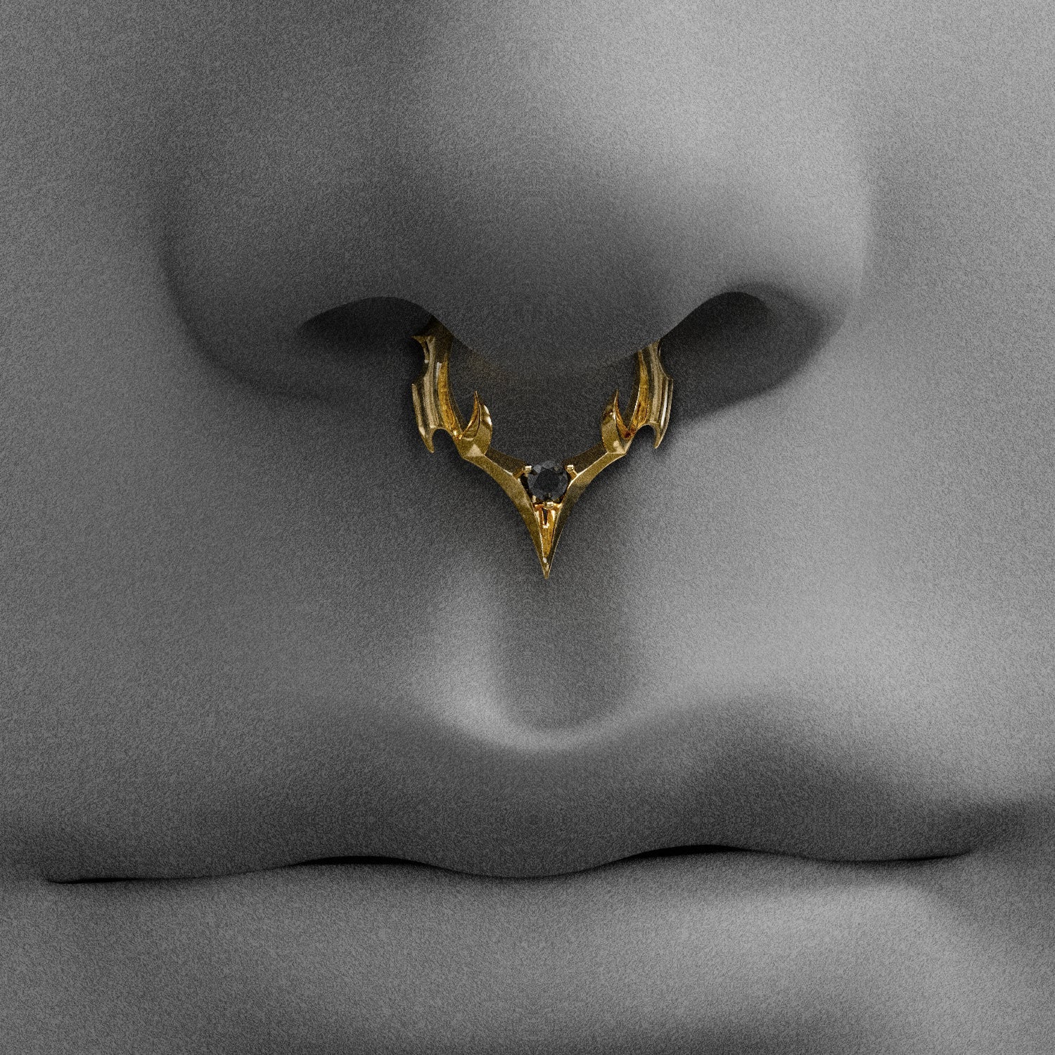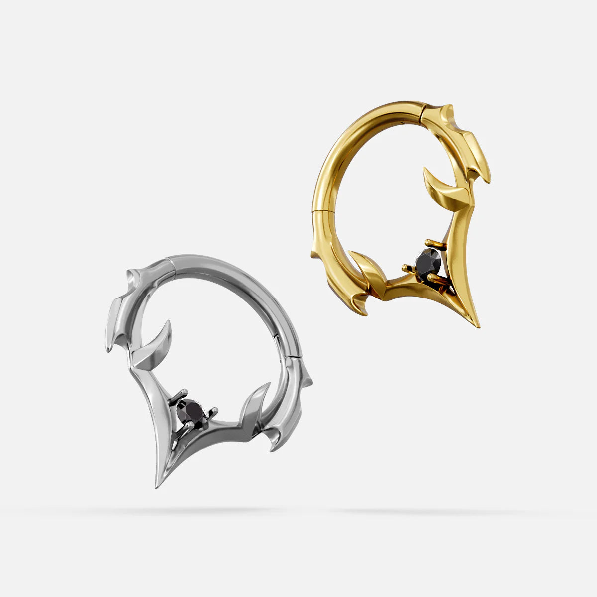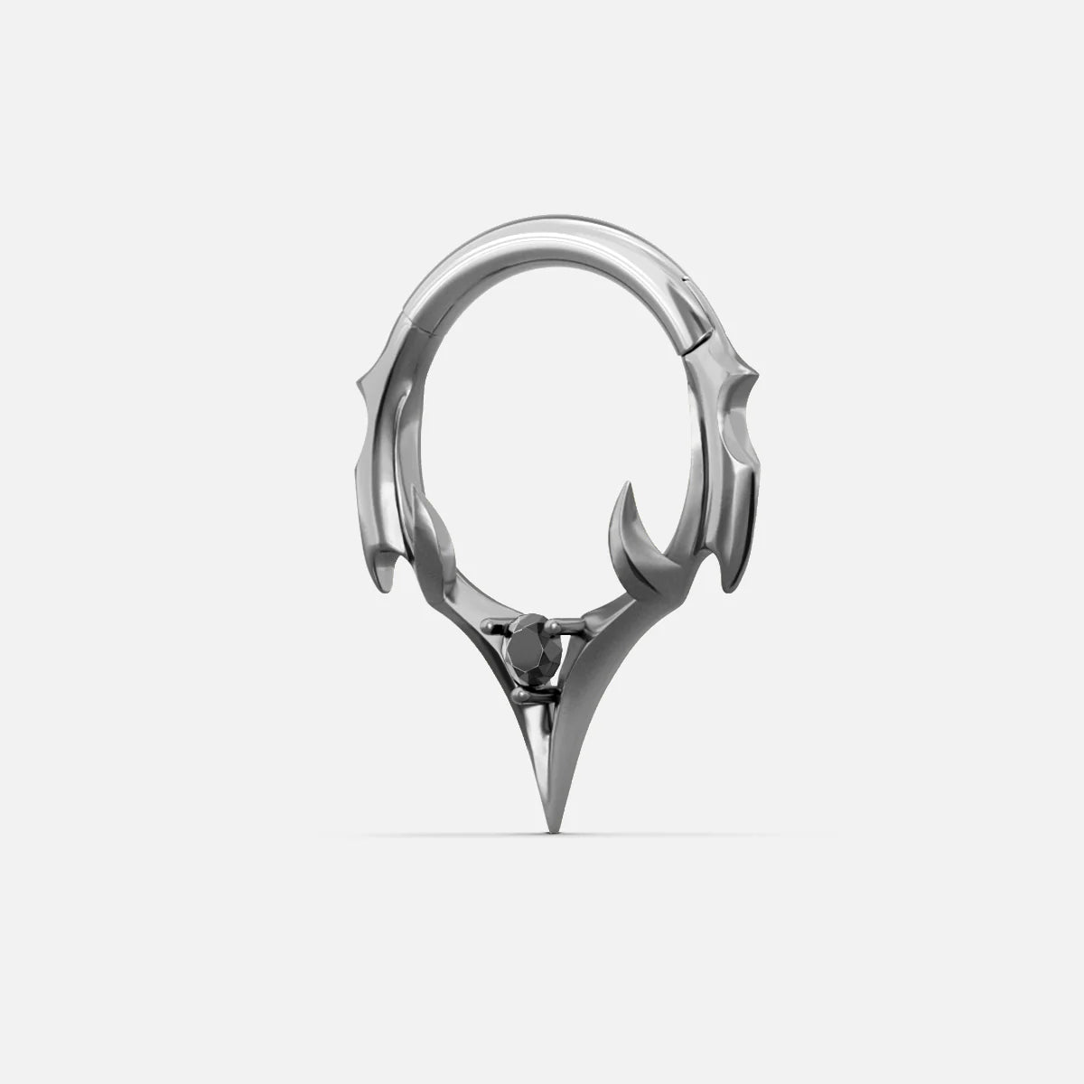 The Crest Point Septum Clicker frames the septum with lifted ridge tips that converge into a single downward point. A round black stone anchors the base; openwork keeps weight low. Spinal Bone logic—mass where pressure sits, edges tapered for clearance.