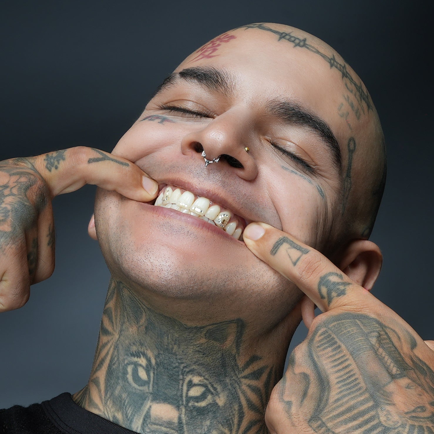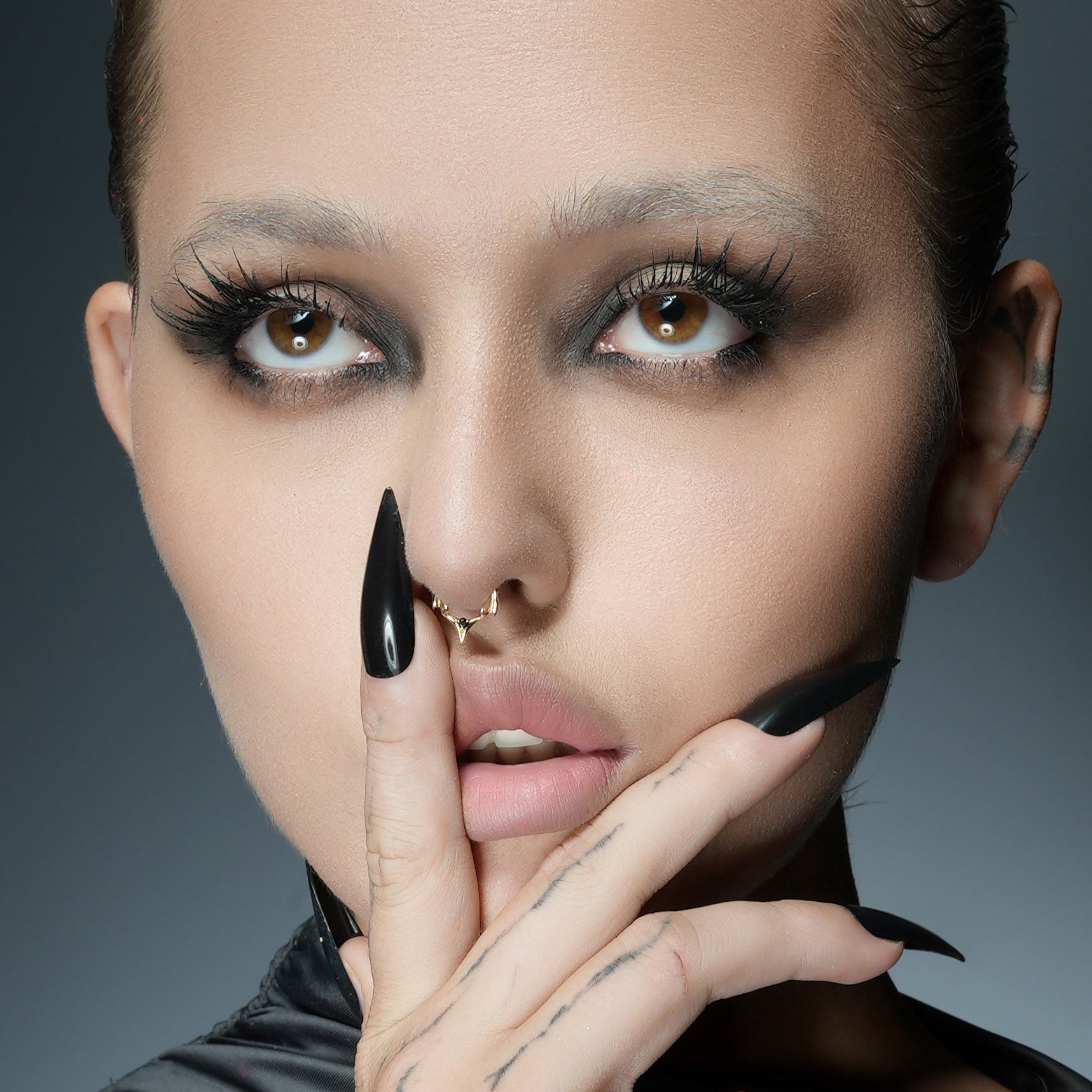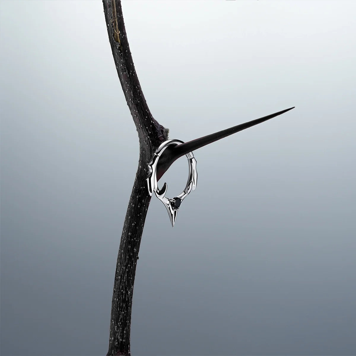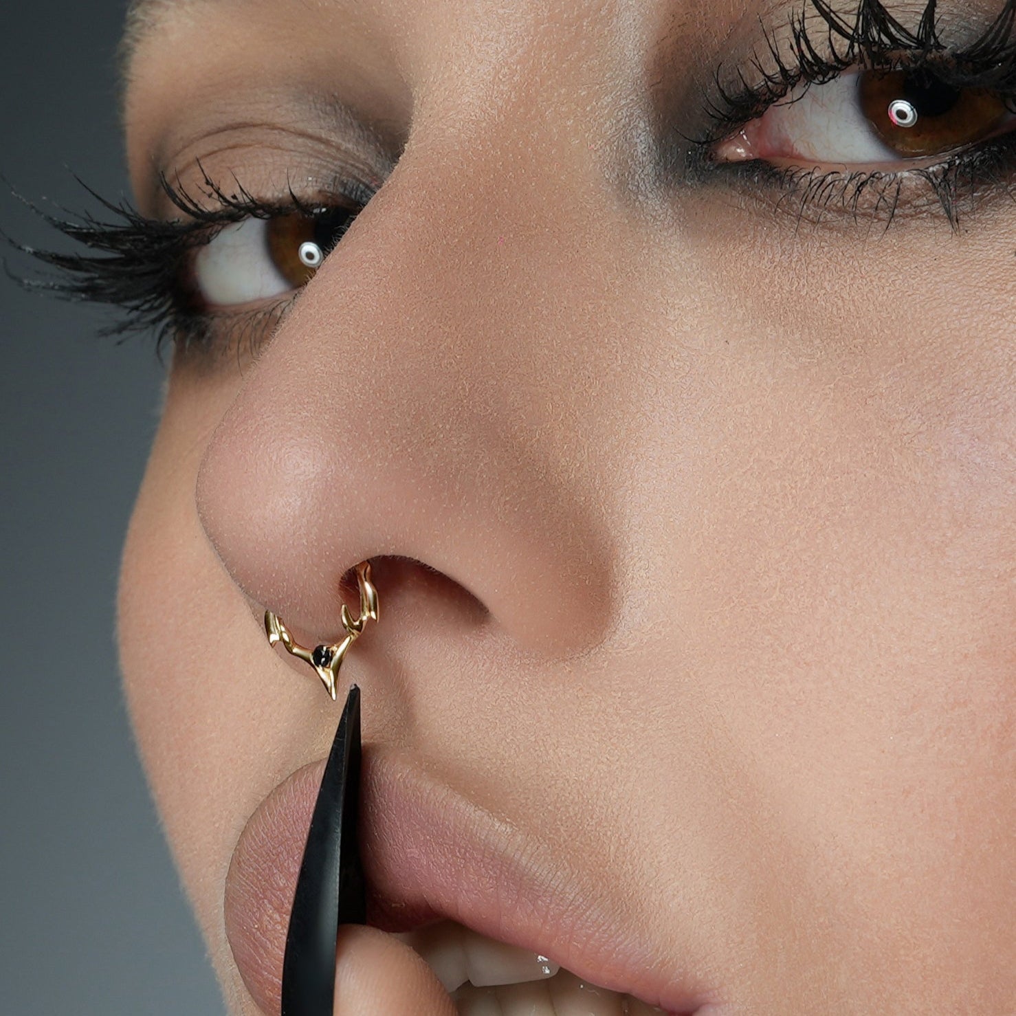 The Crest Point Septum Clicker frames the septum with lifted ridge tips that converge into a single downward point. A round black stone anchors the base; openwork keeps weight low. Spinal Bone logic—mass where pressure sits, edges tapered for clearance.