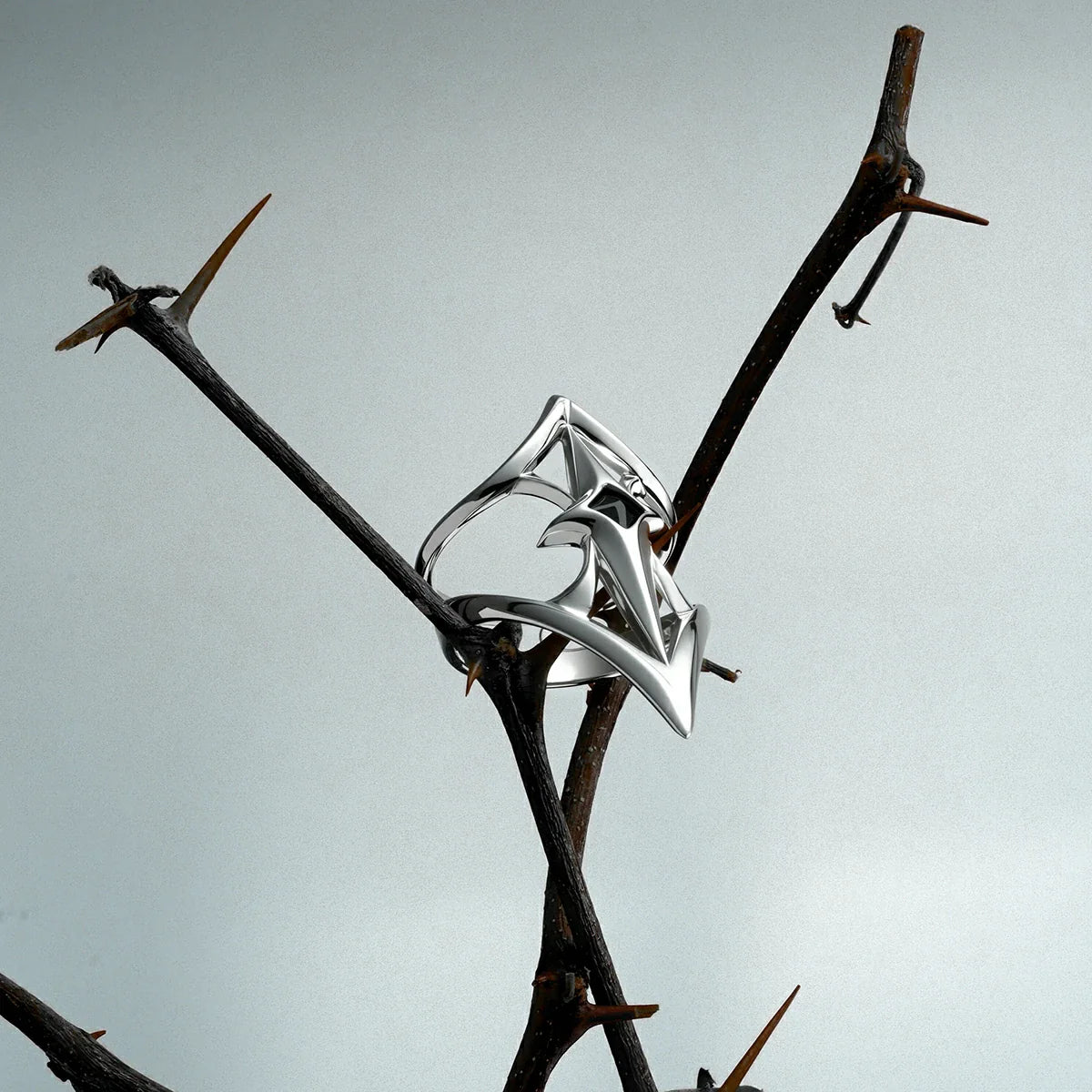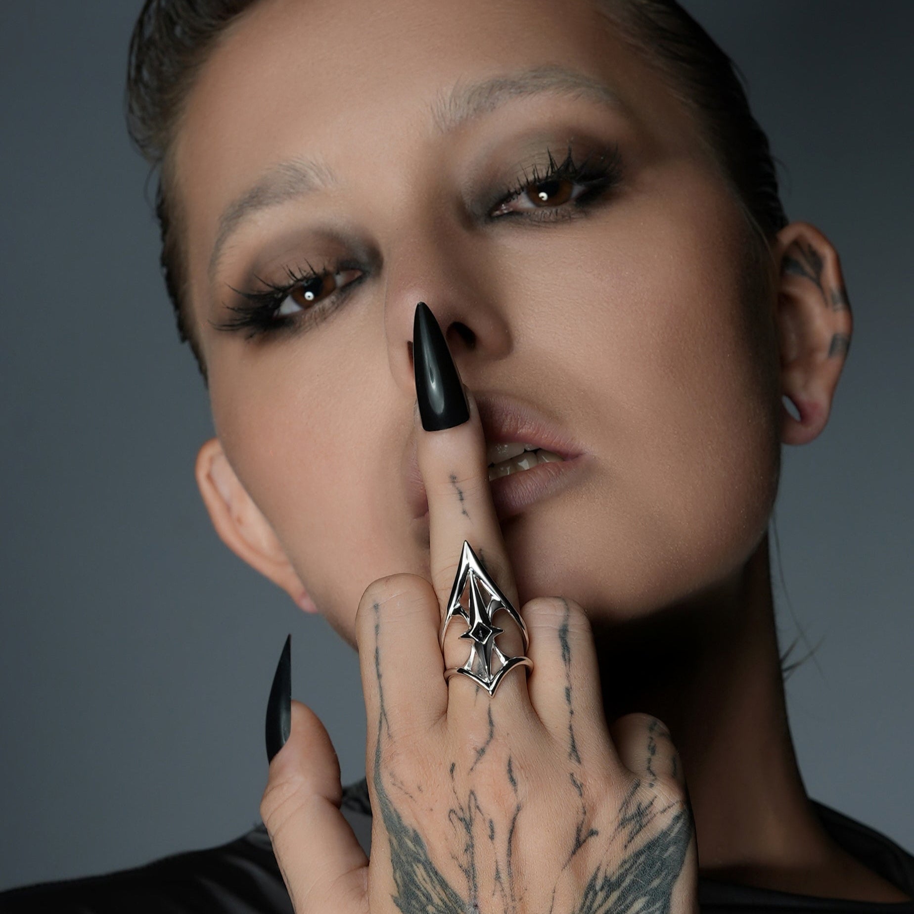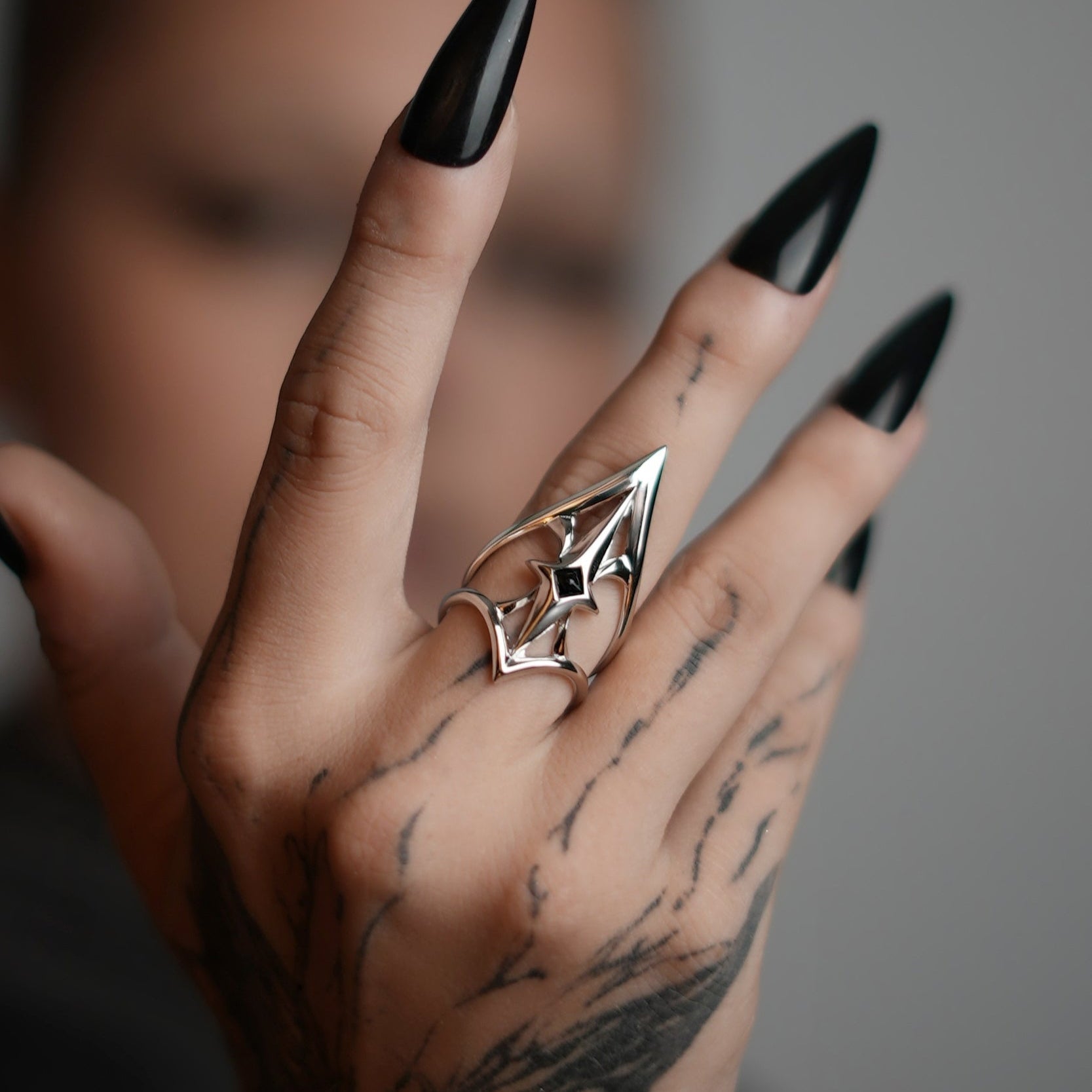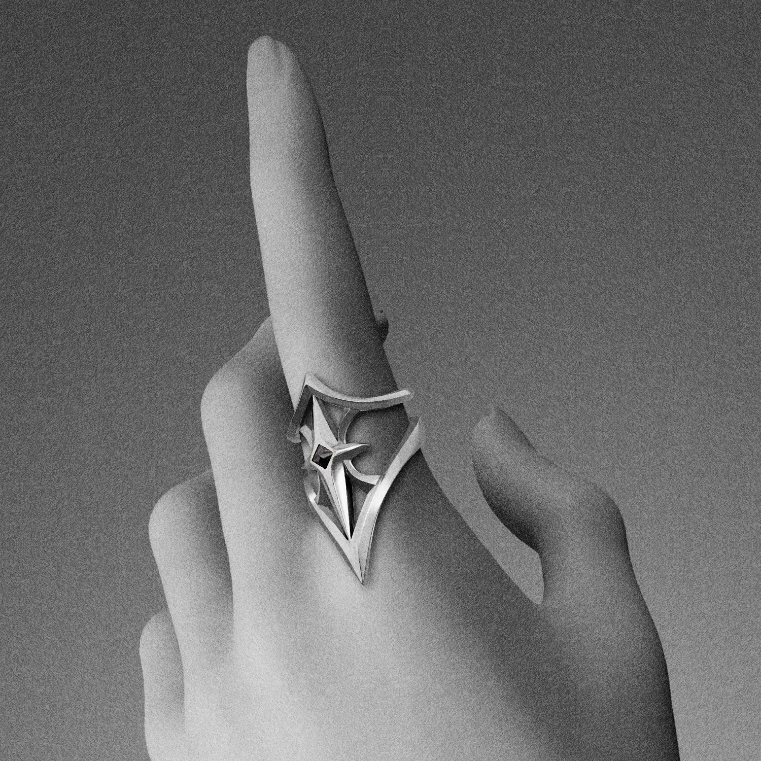 The Crest Shield Ring frames the finger in a pointed, openwork shield: ridge planes converge to a central square-cut black stone, with blade-like edges reading as spine and crest. Drawn from Spinal Bone’s logic of pressure and support, the geometry feels protective and exact.