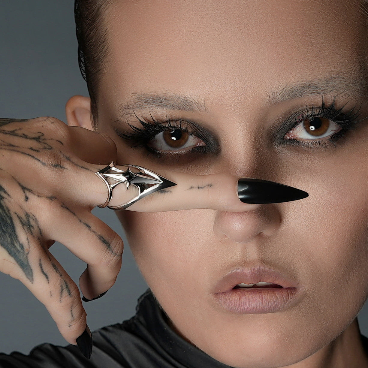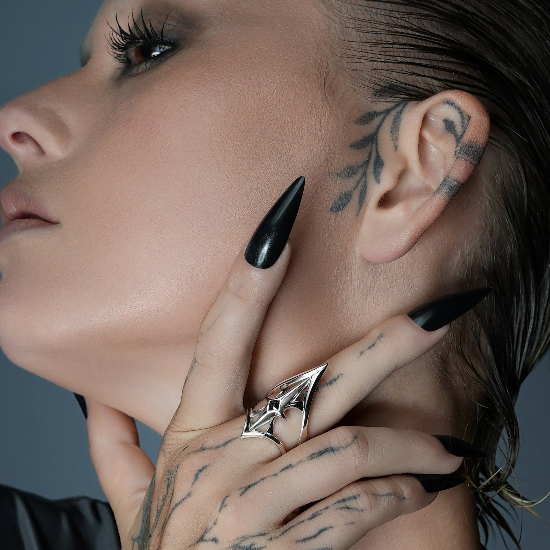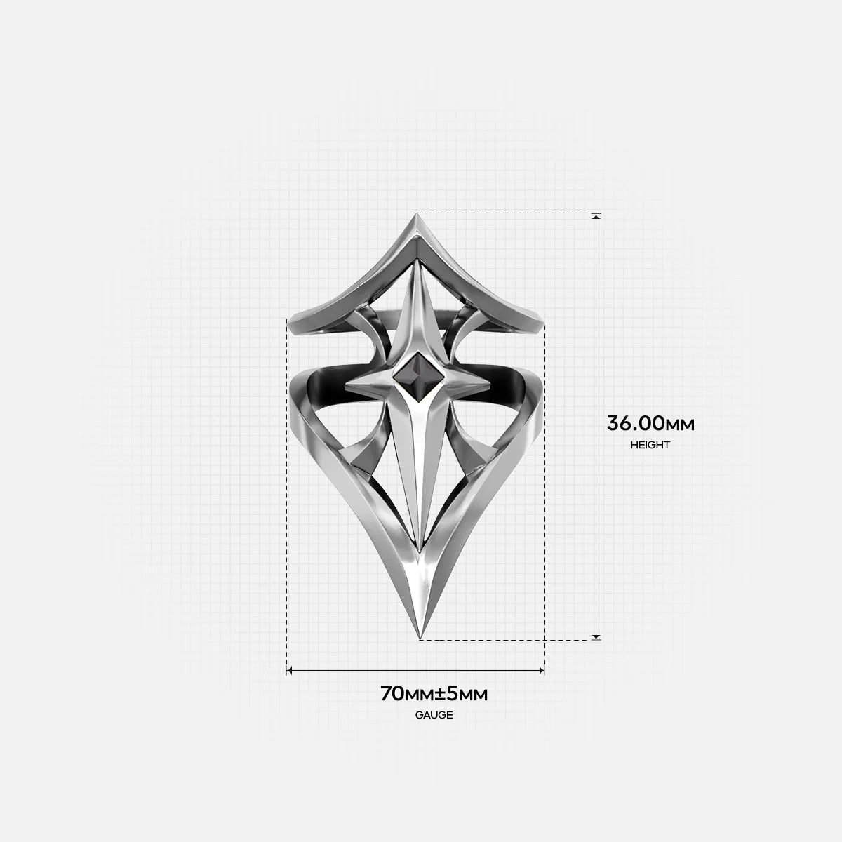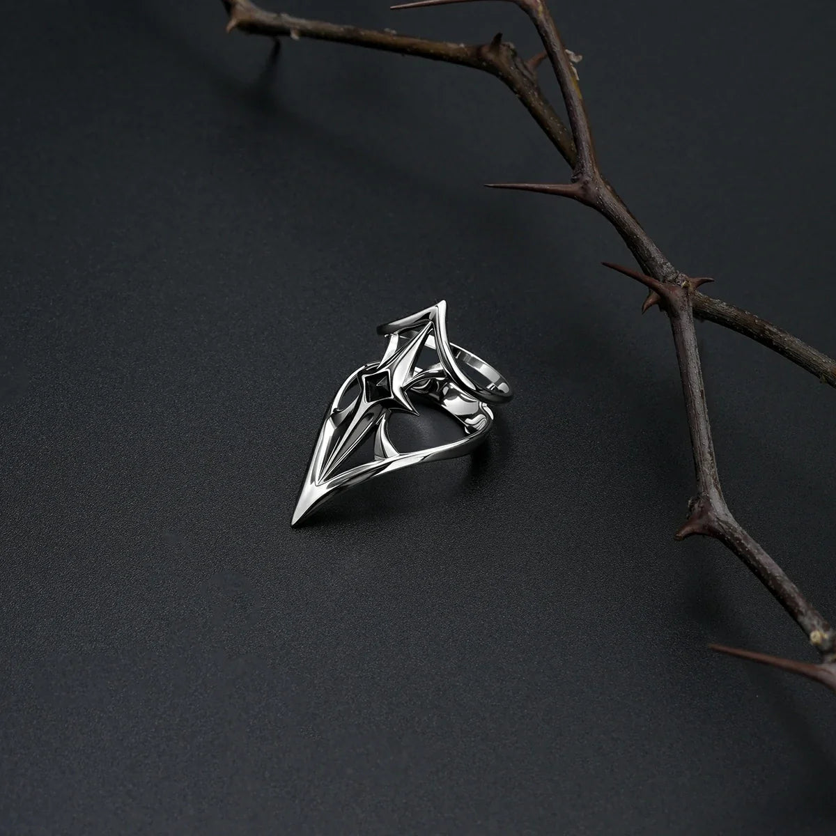 The Crest Shield Ring frames the finger in a pointed, openwork shield: ridge planes converge to a central square-cut black stone, with blade-like edges reading as spine and crest. Drawn from Spinal Bone’s logic of pressure and support, the geometry feels protective and exact.