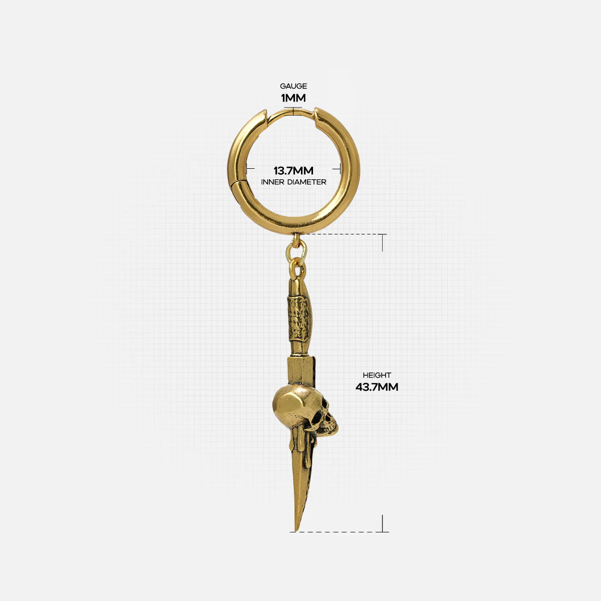 Death Blade Earrings Gothic drop design with a dagger shaped pendant, 3D skull detail, and textured grip for a fierce, high impact look. This item is sold as a pair.
