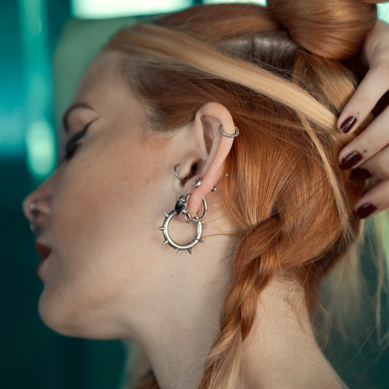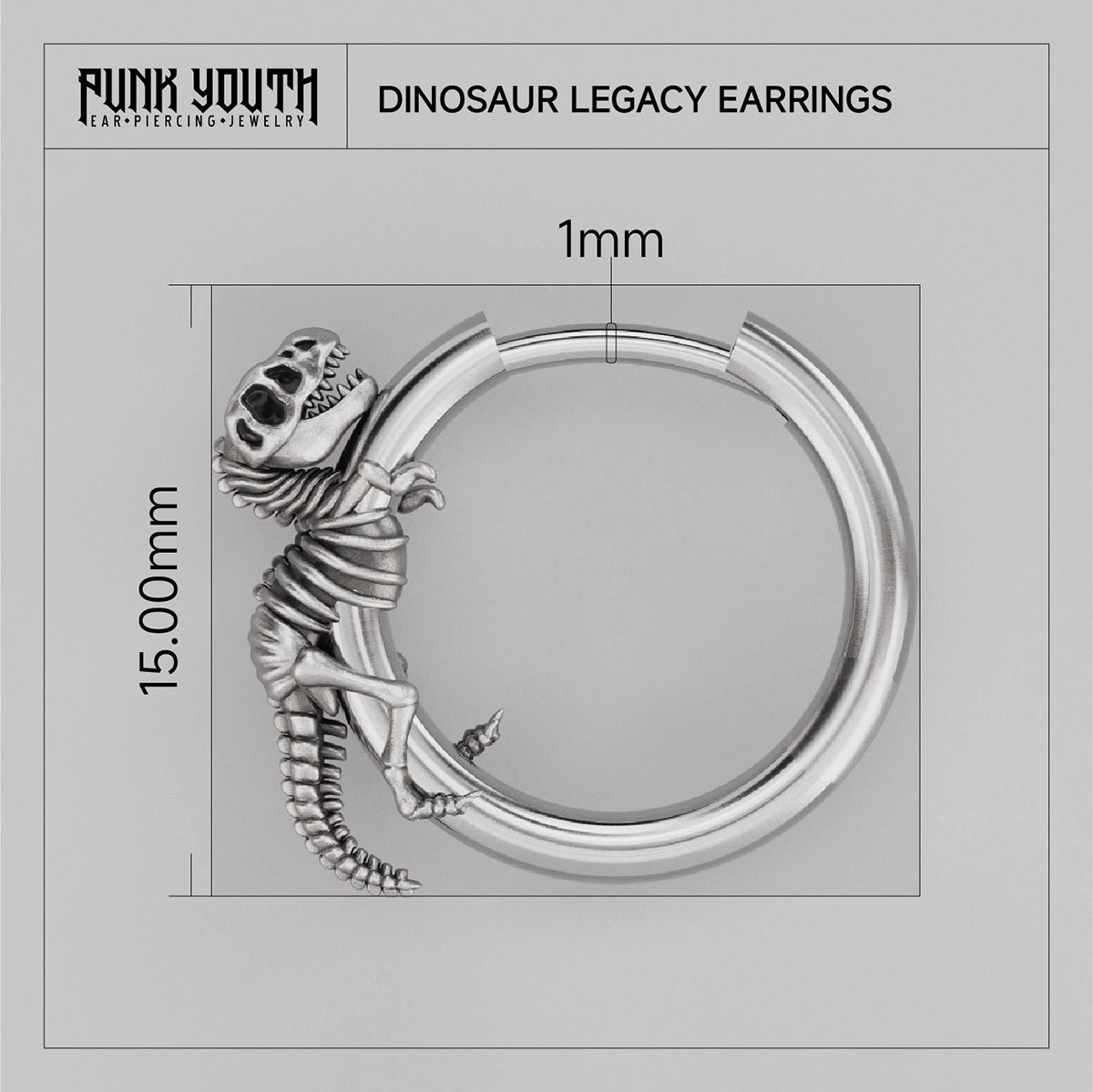 The earrings feature a detailed dinosaur skeleton wrapped around a circular hoop, creating a striking and unique look.This item is sold as a pair.
