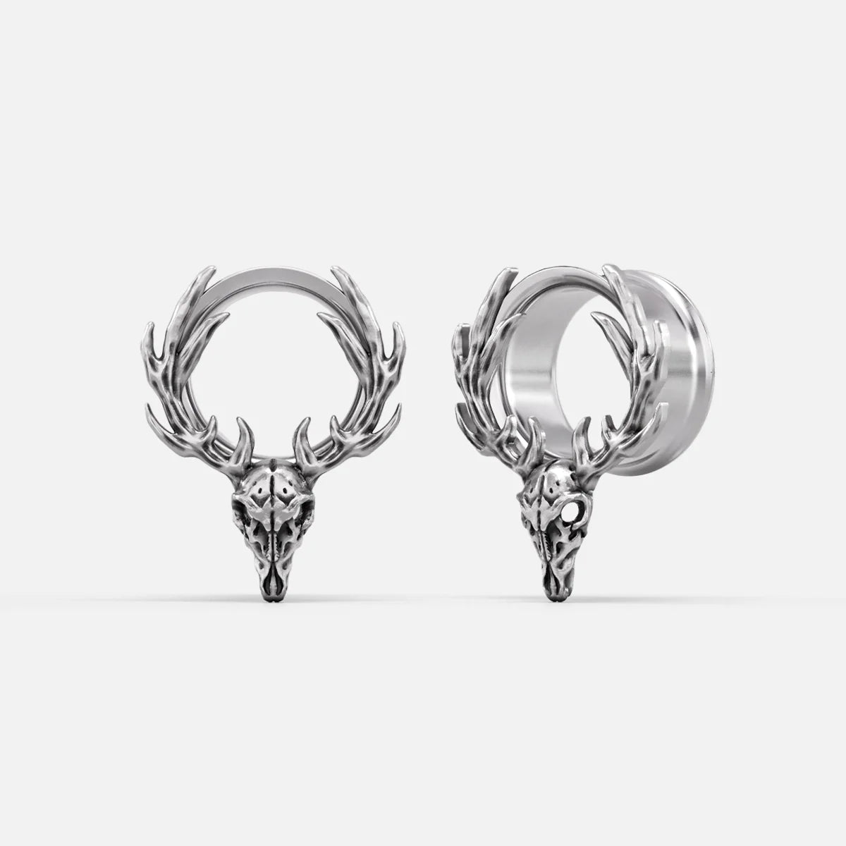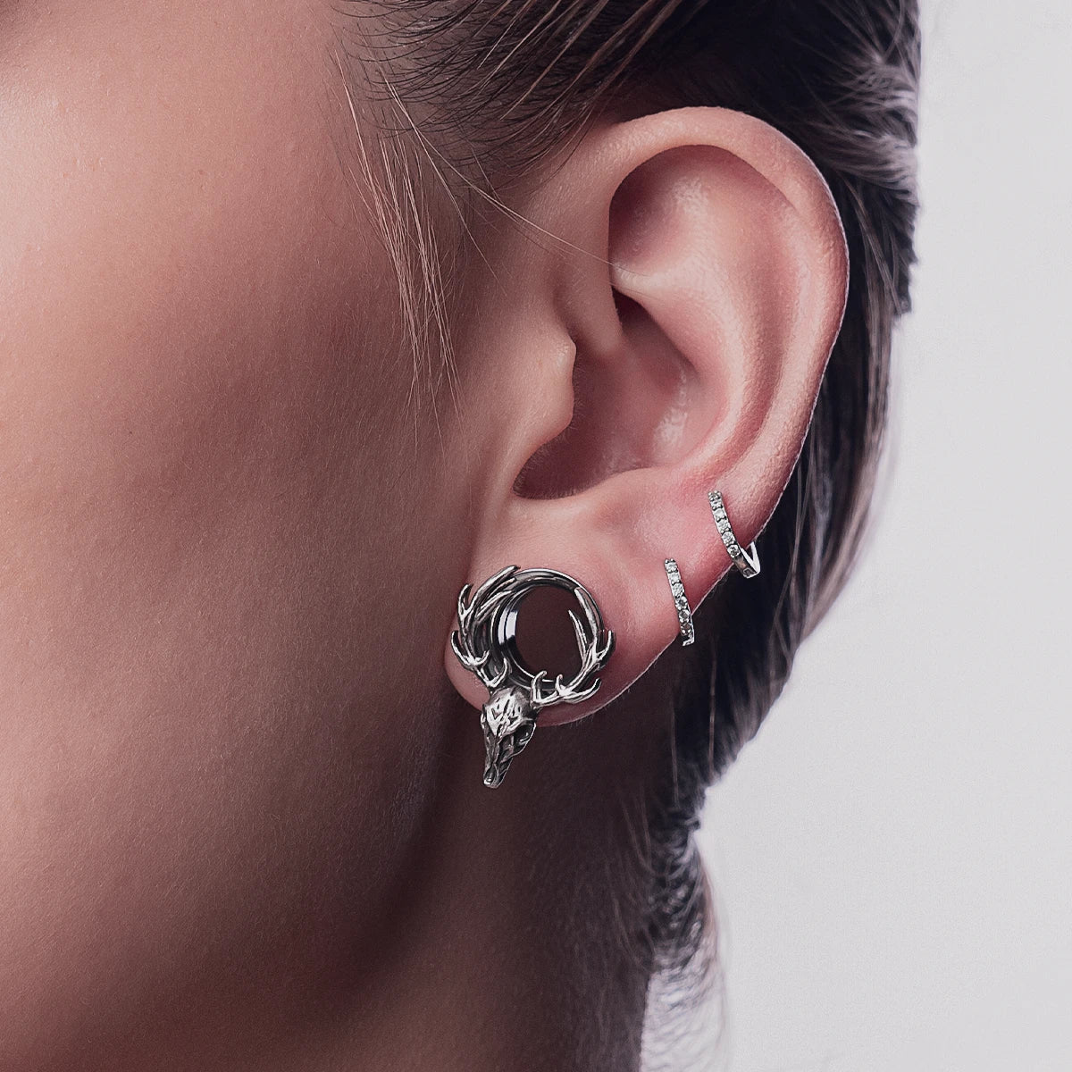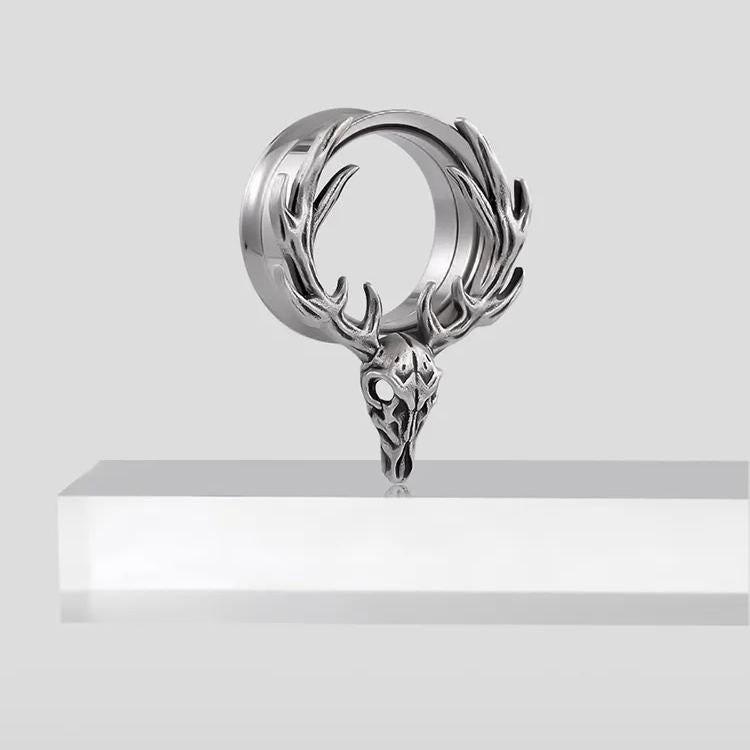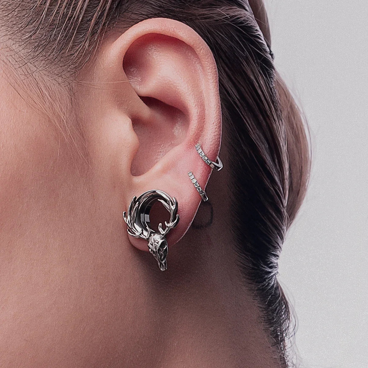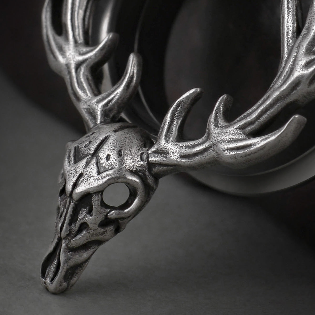 This piercing jewelry features a striking deer skull with intricately detailed antlers, creating a captivating and bold visual. This item is sold as a pair.