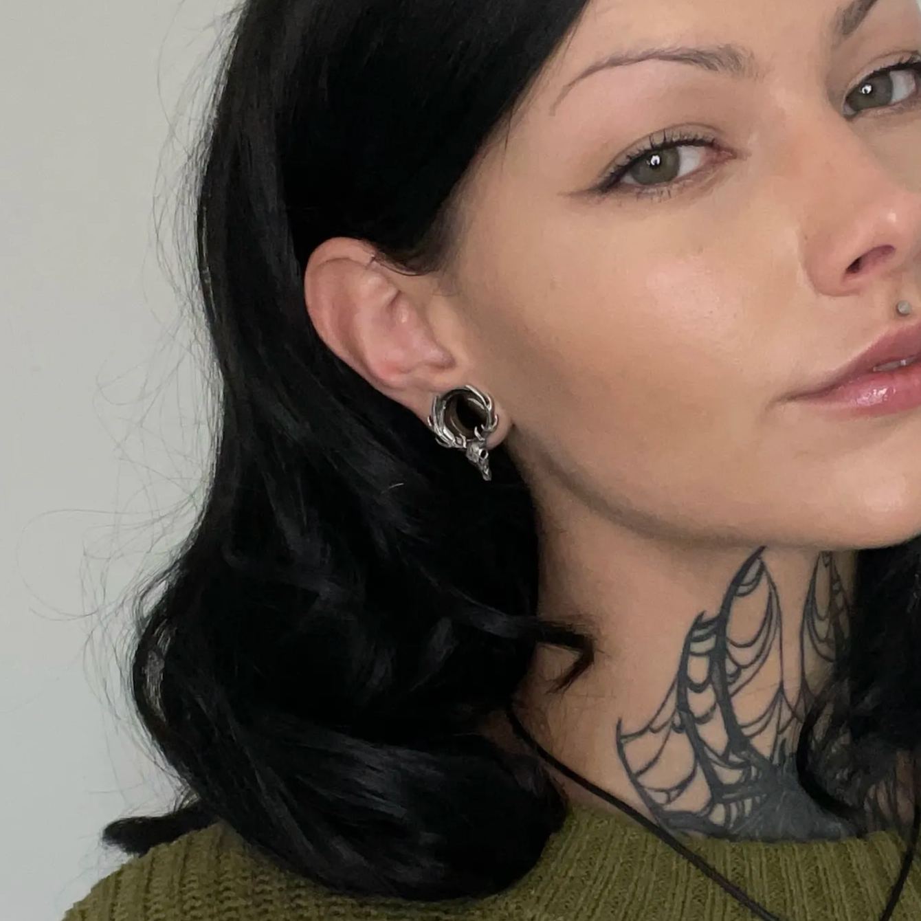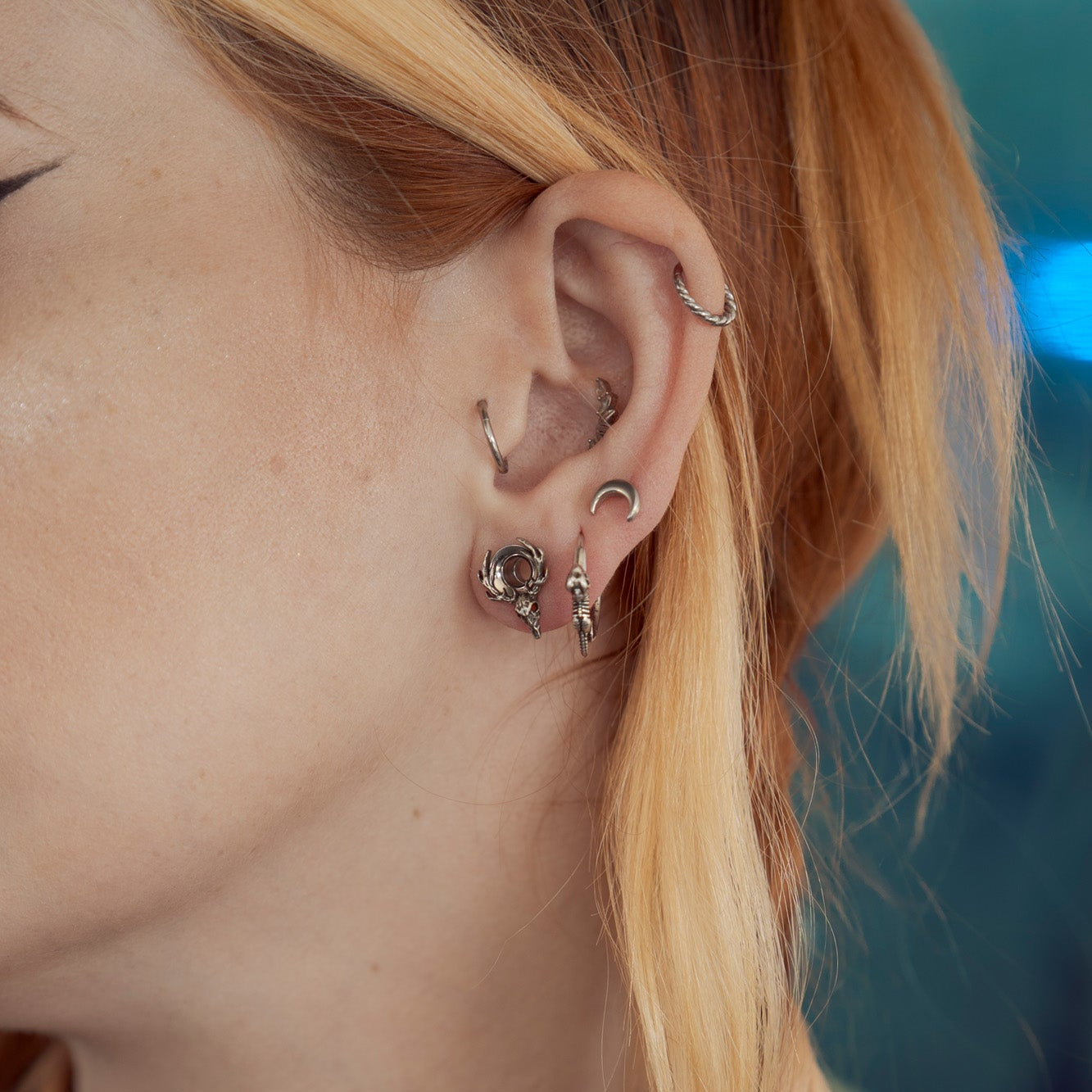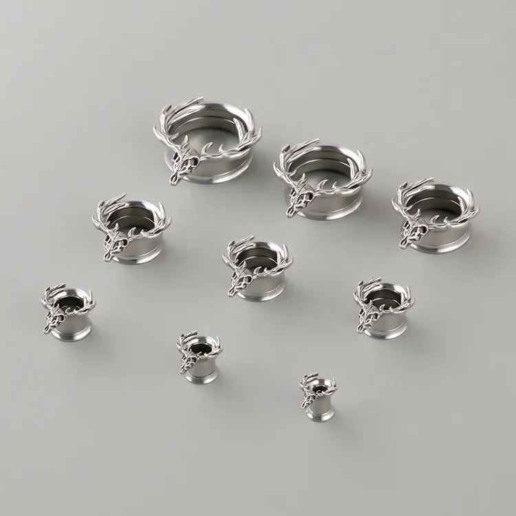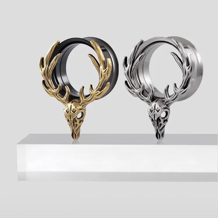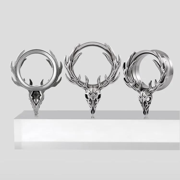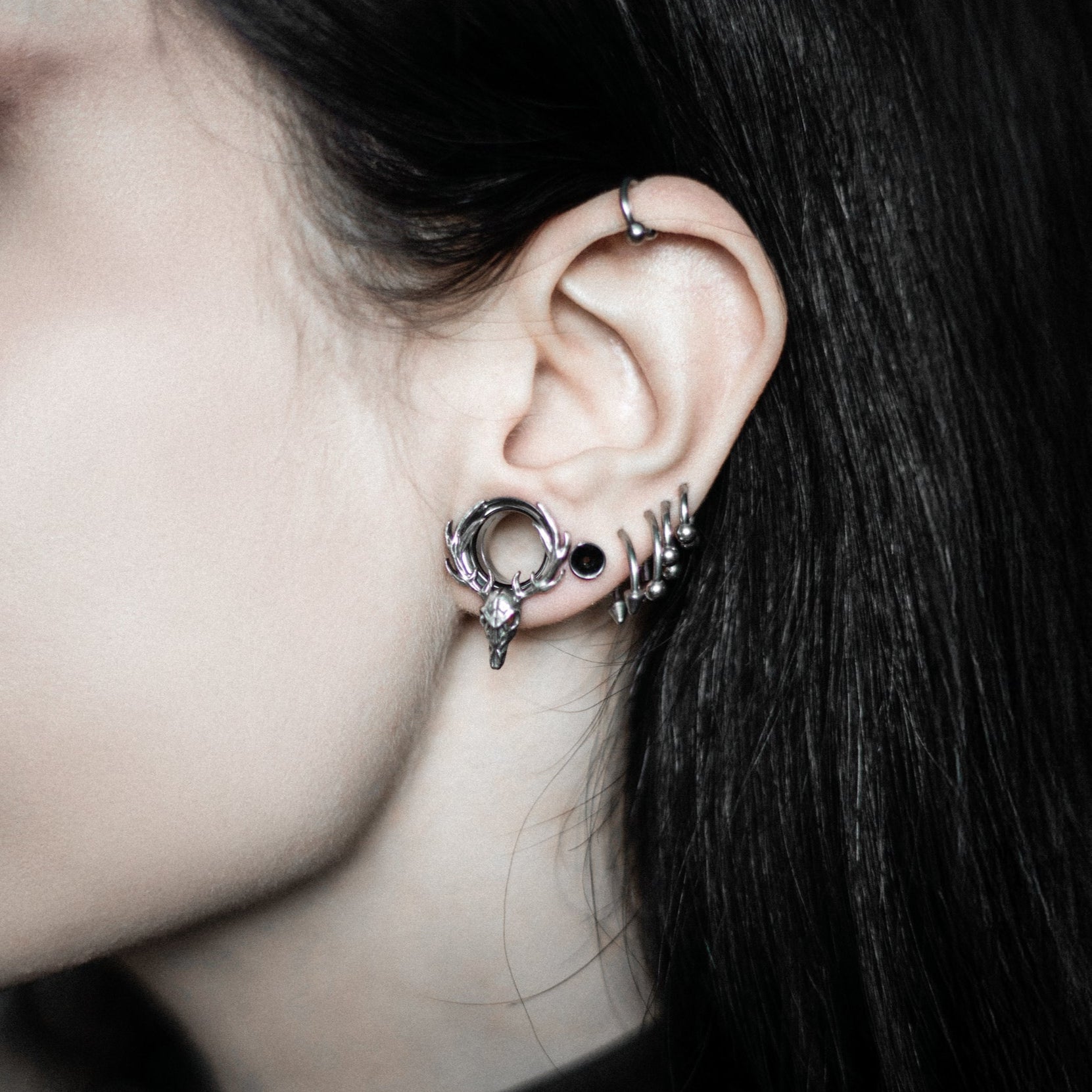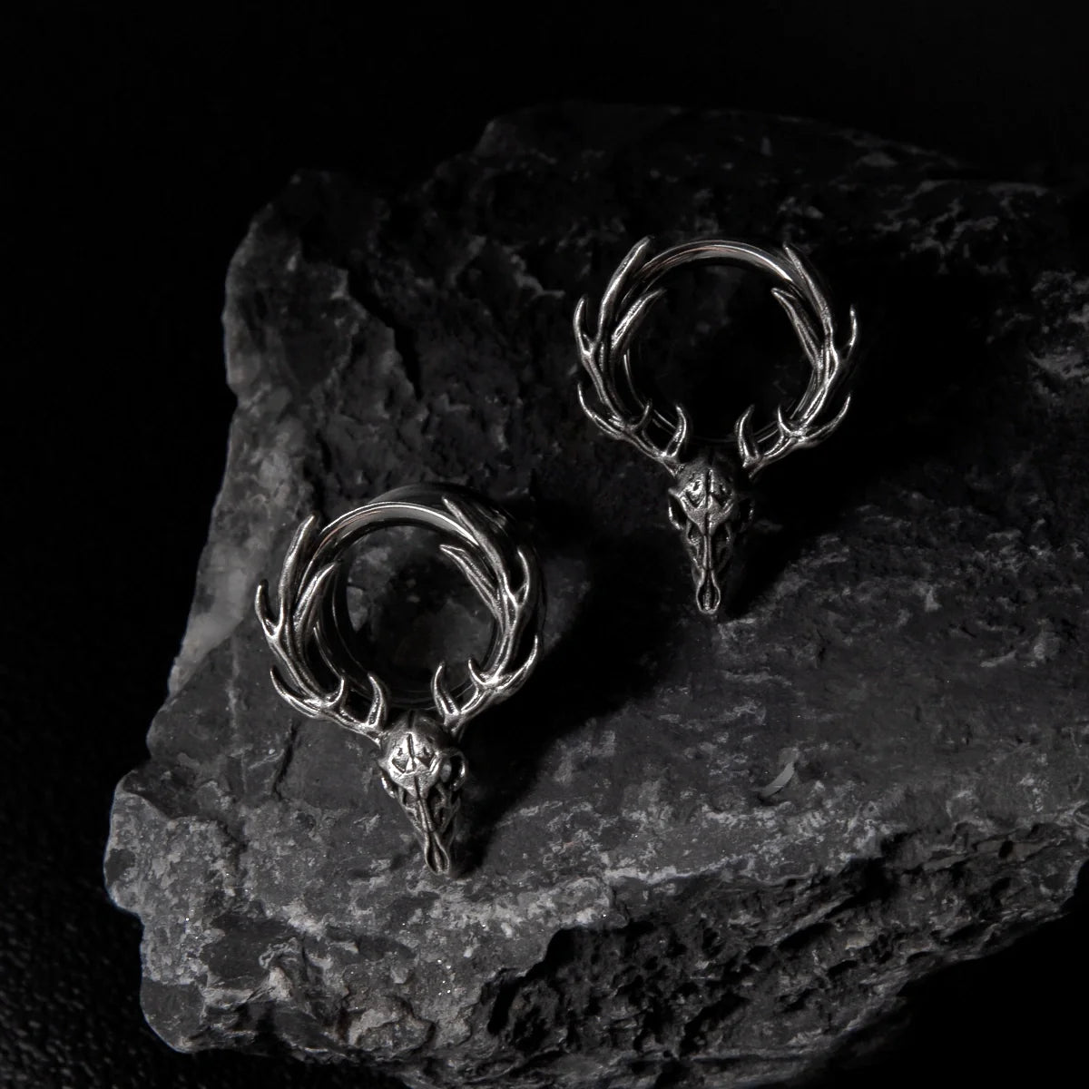 This piercing jewelry features a striking deer skull with intricately detailed antlers, creating a captivating and bold visual. This item is sold as a pair.