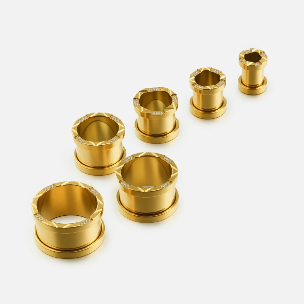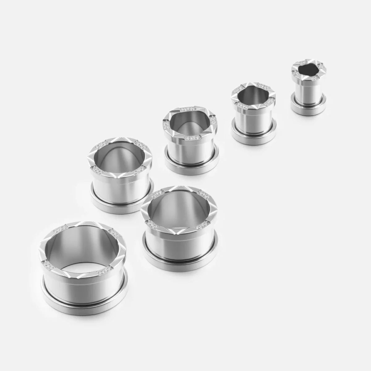 Gleaming Edge Tunnels showcase a sleek faceted metallic body adorned with sparkling cubic zirconia, capturing light with every movement. This item is sold as a pair.