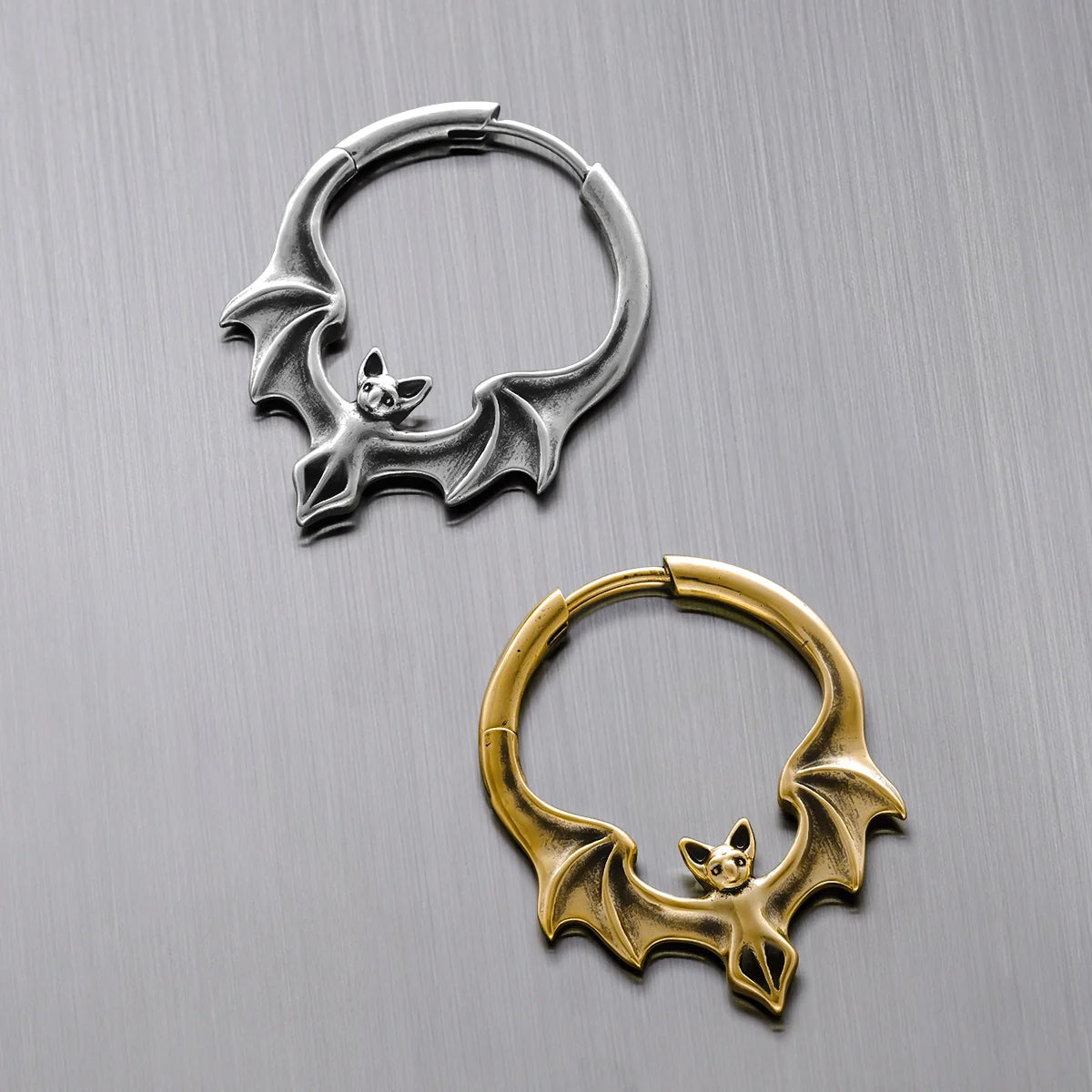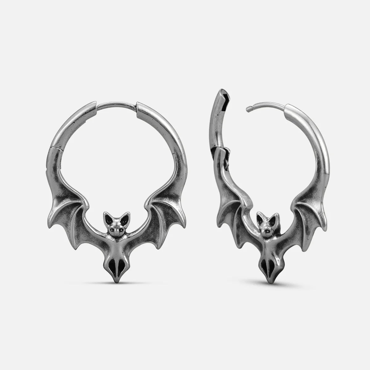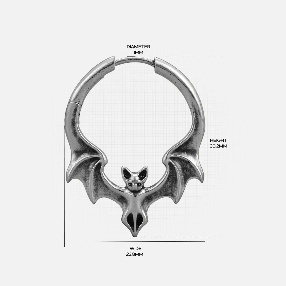 Gothic Bat Earring features a sculpted bat in mid-flight, framed by a hoop and finished in antique silver for a bold gothic look. This item is sold as a pair.