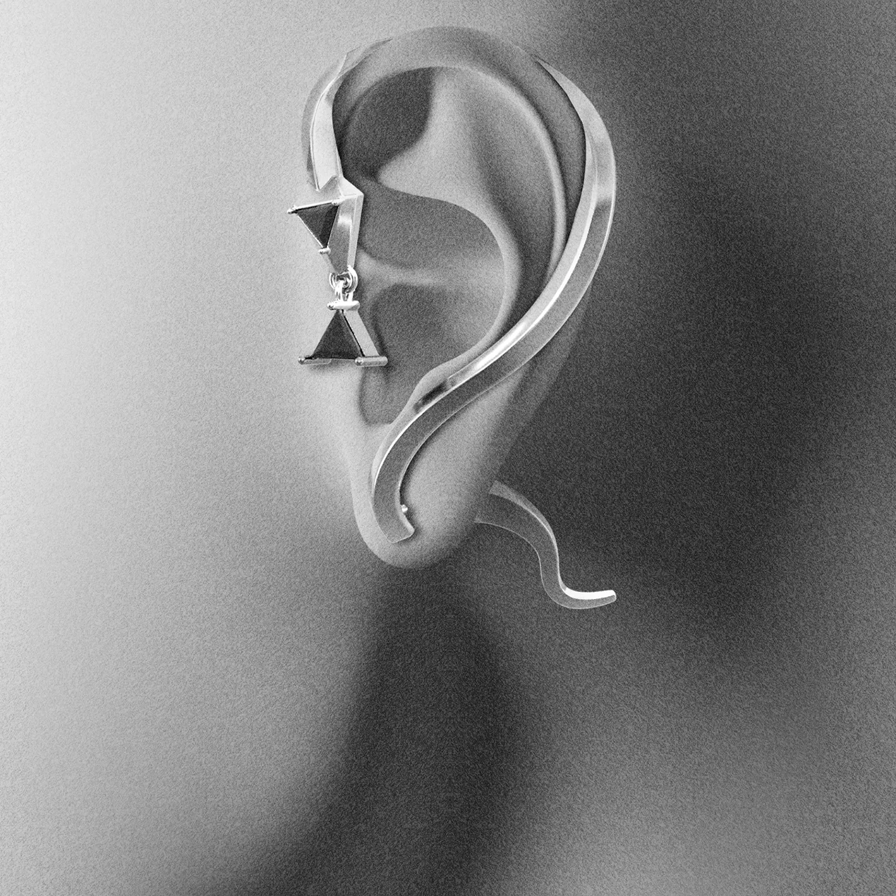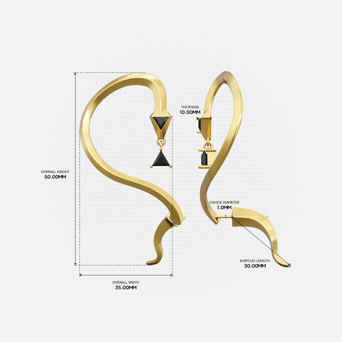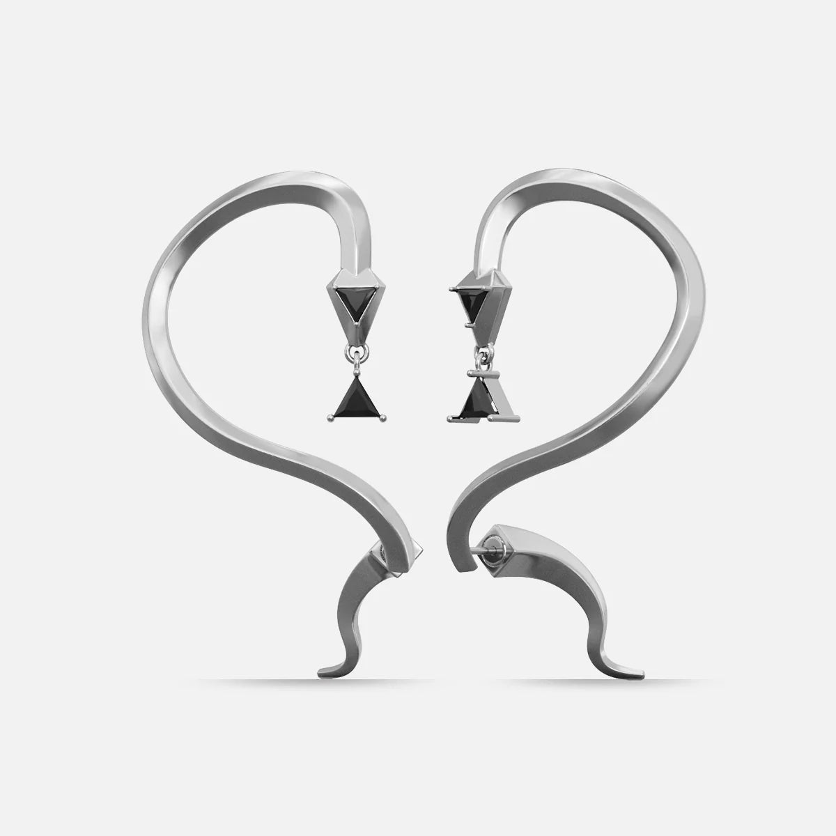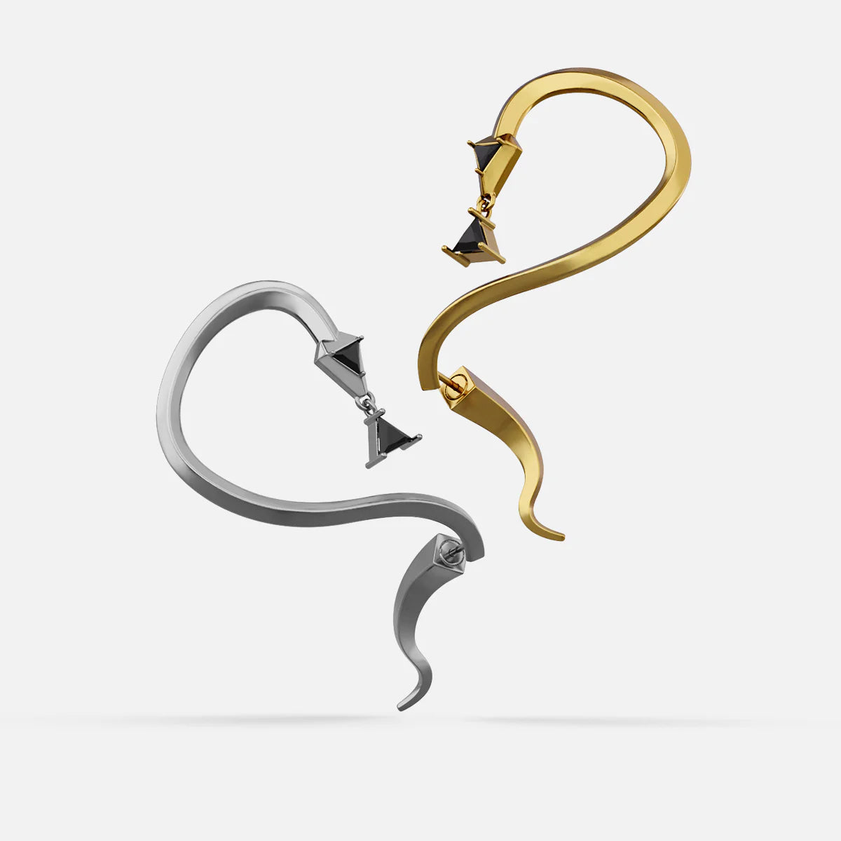 Curved hangers echo a serpent's arc and suspend an hourglass of two black pyramids. A close, steady hang with a subtle swing—refined shape, focused presence.