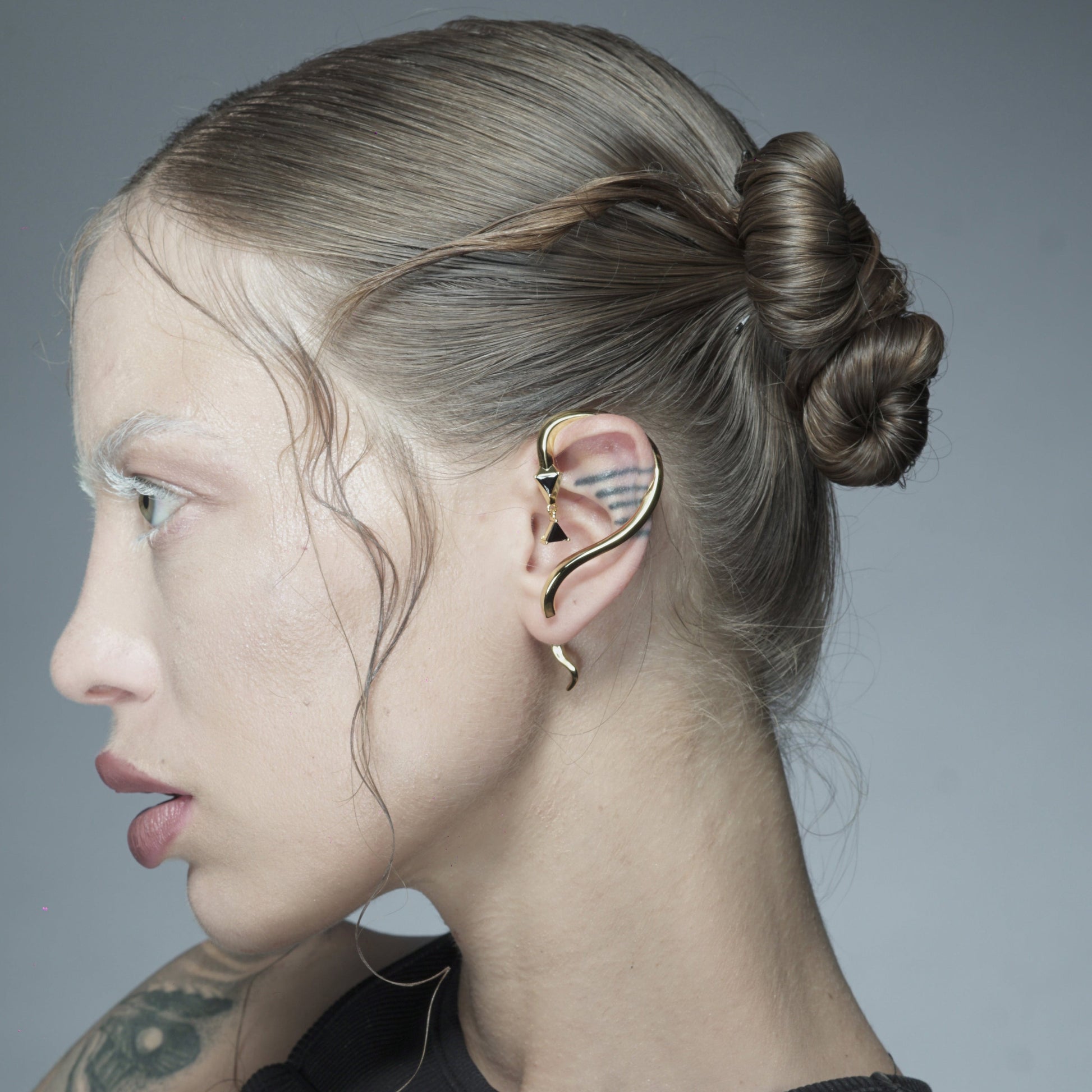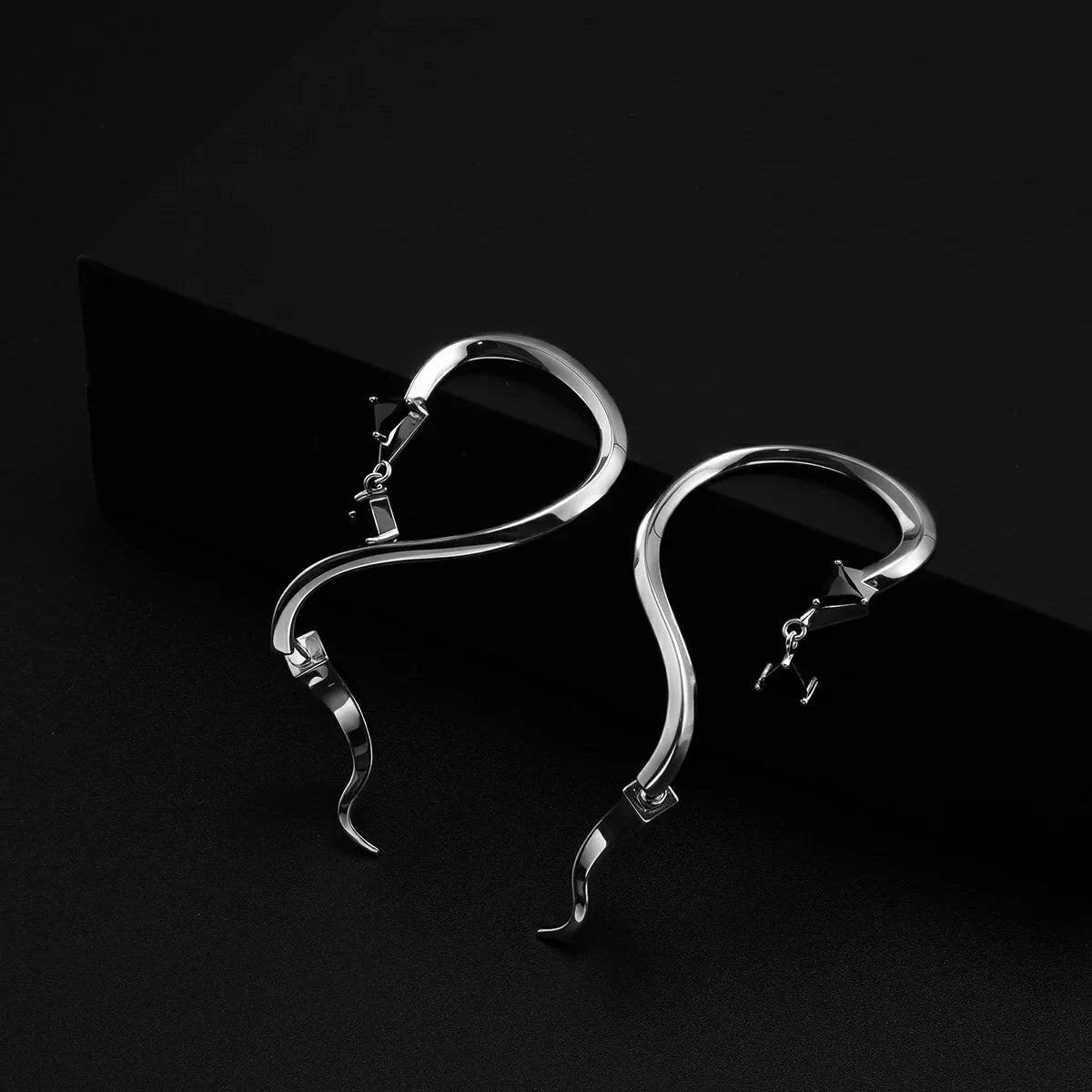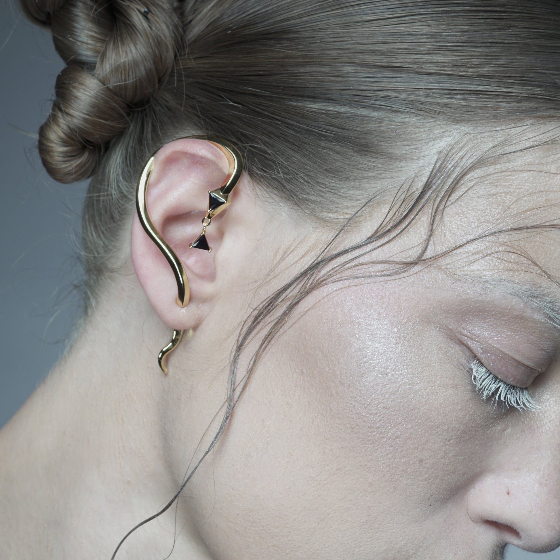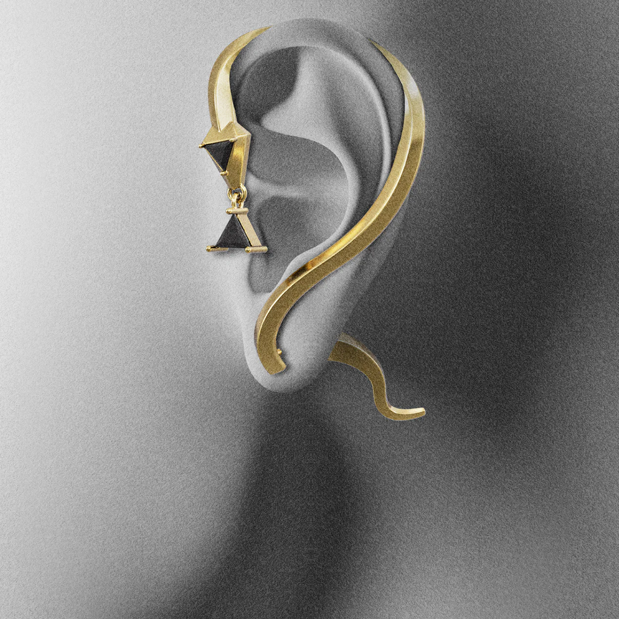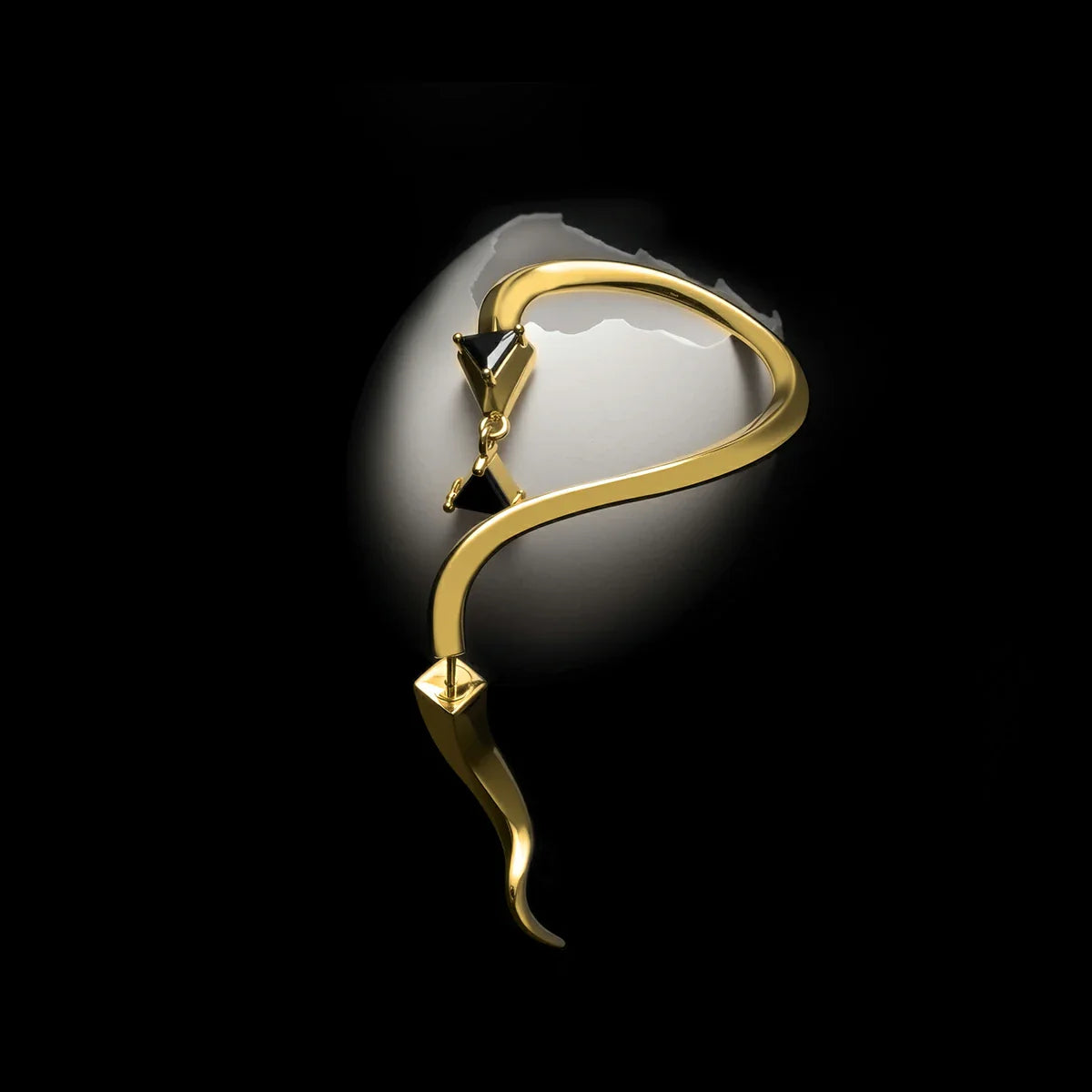Curved hangers echo a serpent's arc and suspend an hourglass of two black pyramids. A close, steady hang with a subtle swing—refined shape, focused presence.