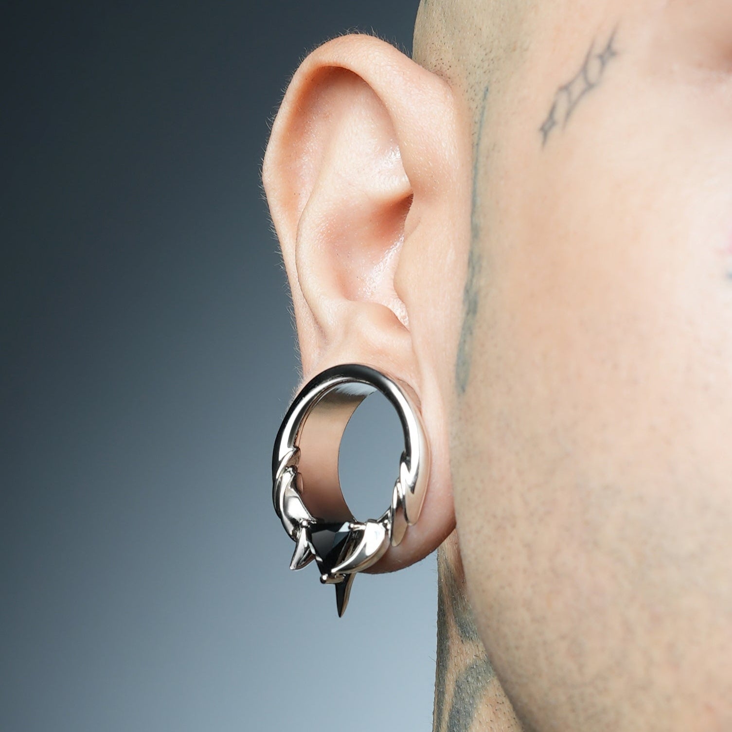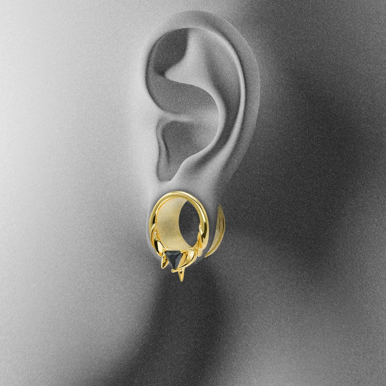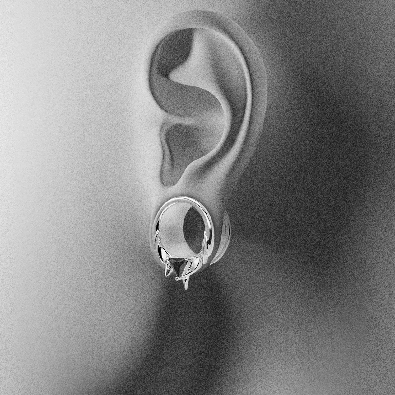 The Interlock Spine Tunnels circle the ear with clean weight, a double-flare profiles with ridge lines that read like bone under load. The geometry interlocks; edges register; the fit feels inevitable.