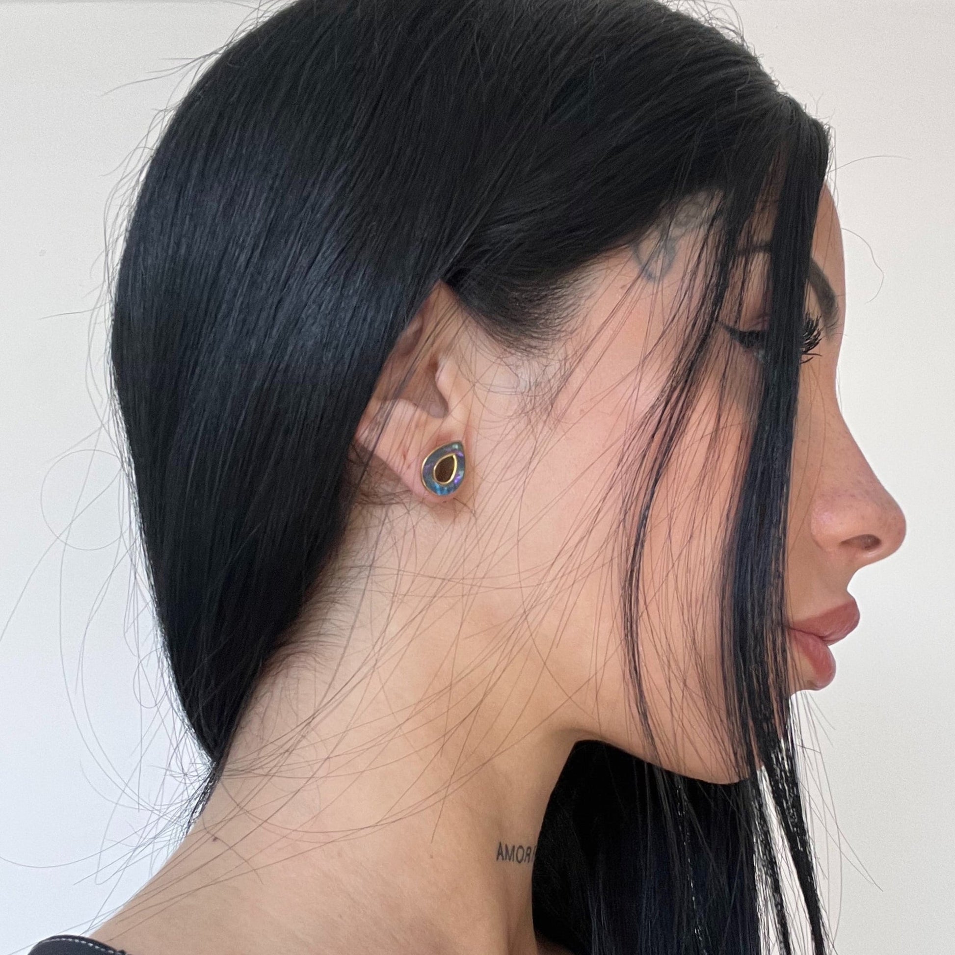 The design features a sleek teardrop shape with an iridescent finish that changes color at different angles, creating a mesmerizing visual effect. This item is sold as a pair.