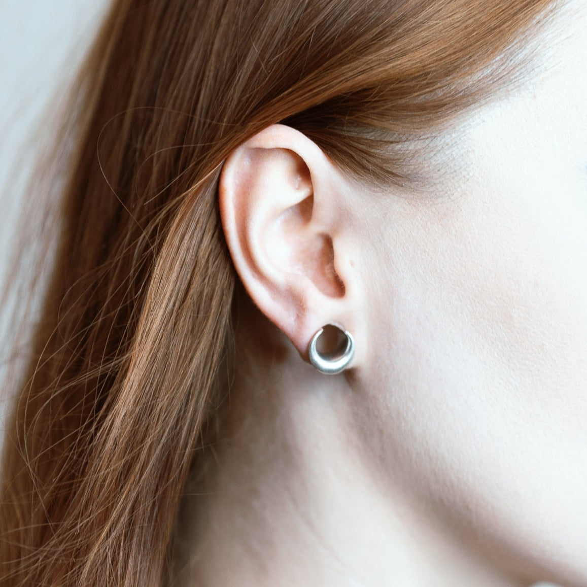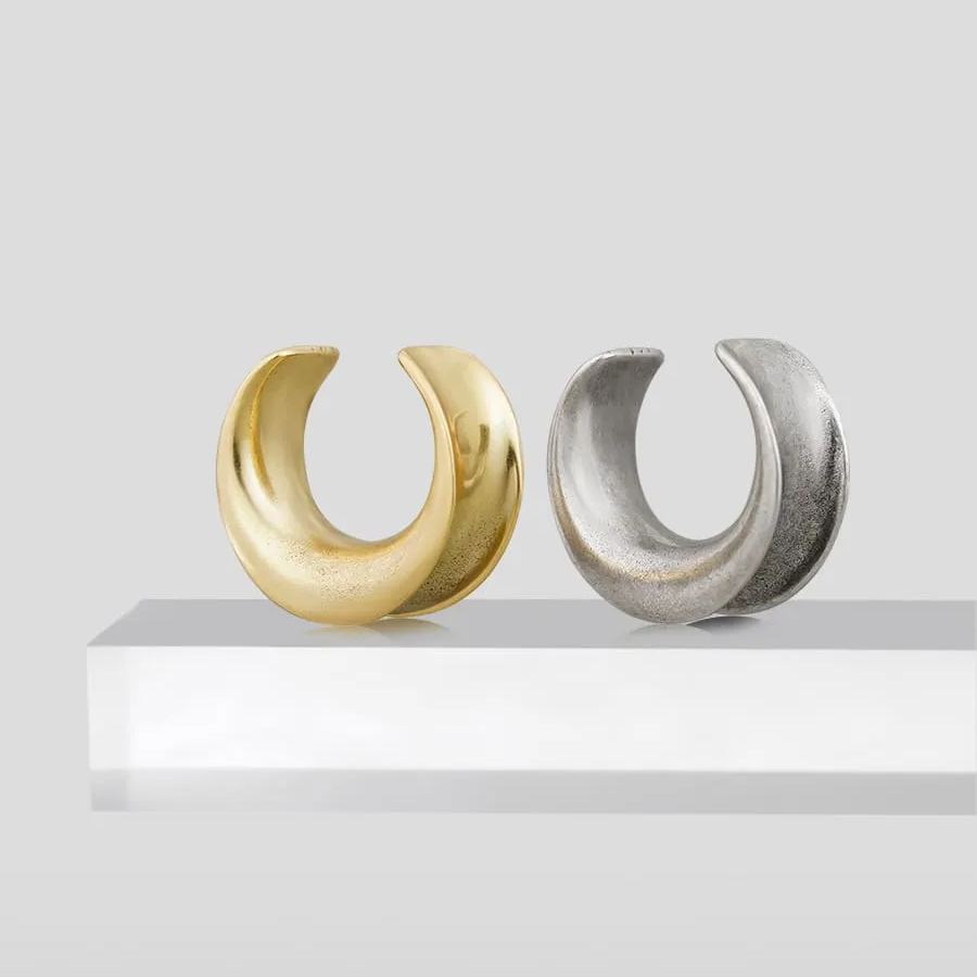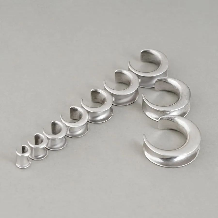Lunar Eclipse Tunnels feature a sleek, crescent moon design with a metallic silver finish, offering a modern yet mystical look.This item is sold as a pair.