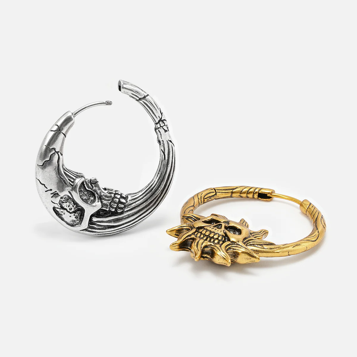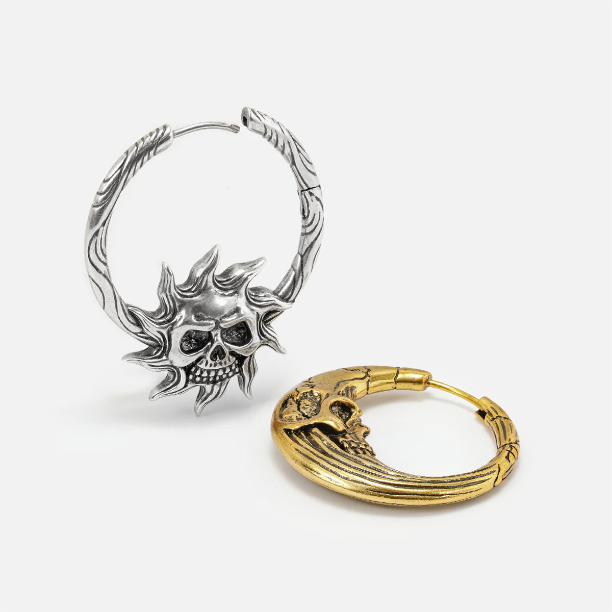 Lunar Solar Skulls Earrings feature an intricate skull design that combines moon and sun elements, offering a unique artistic flair for any occasion. This item is sold as a pair.