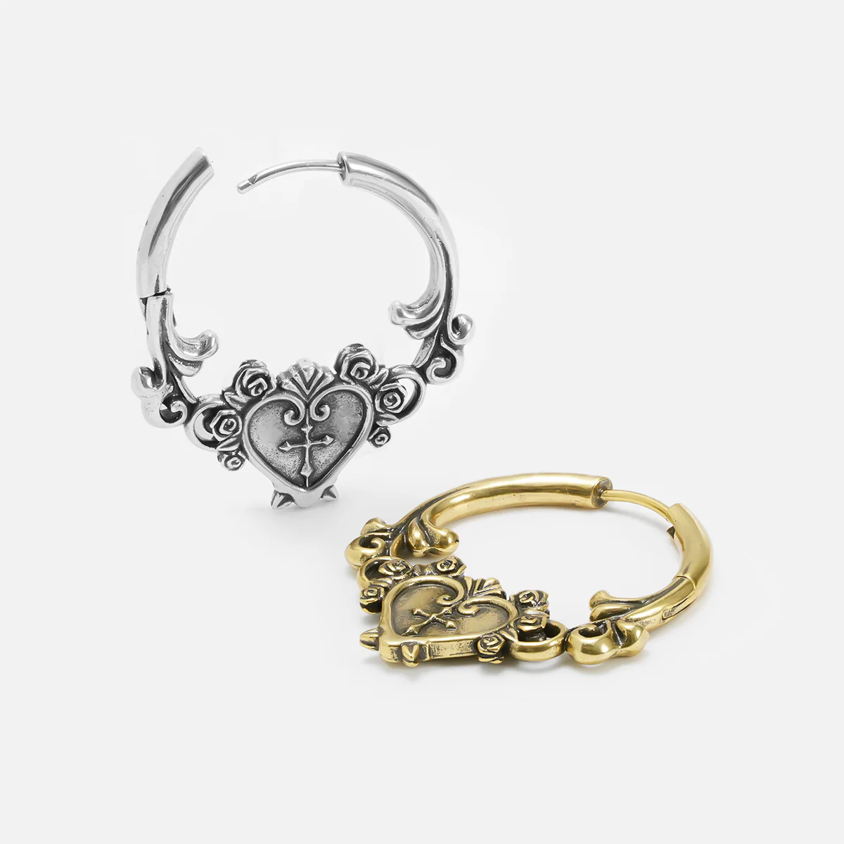 Ornate Affection Earrings feature a heart and cross motif framed by intricate baroque scrollwork in antique silver—ideal for lobe piercings. This item is sold as a pair.