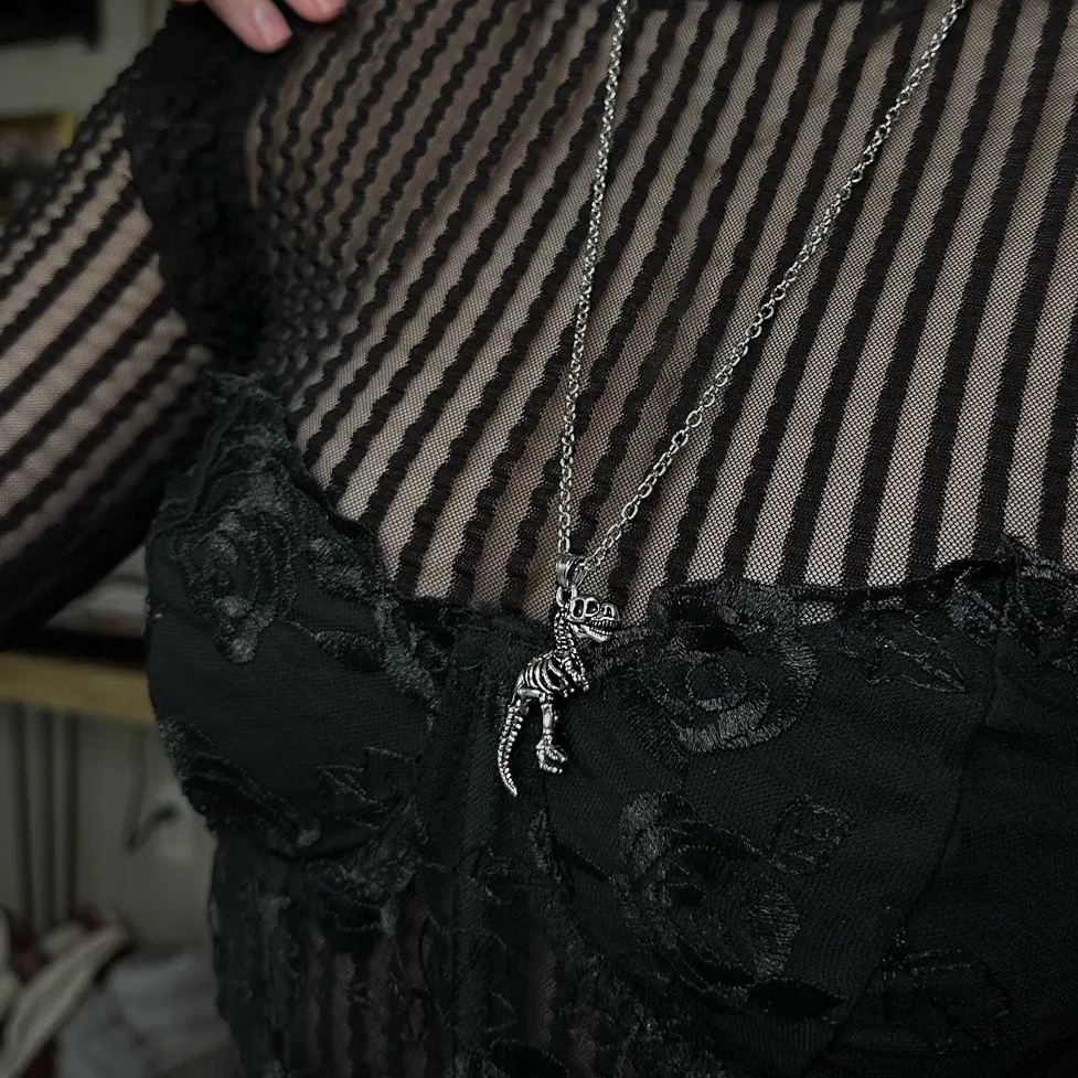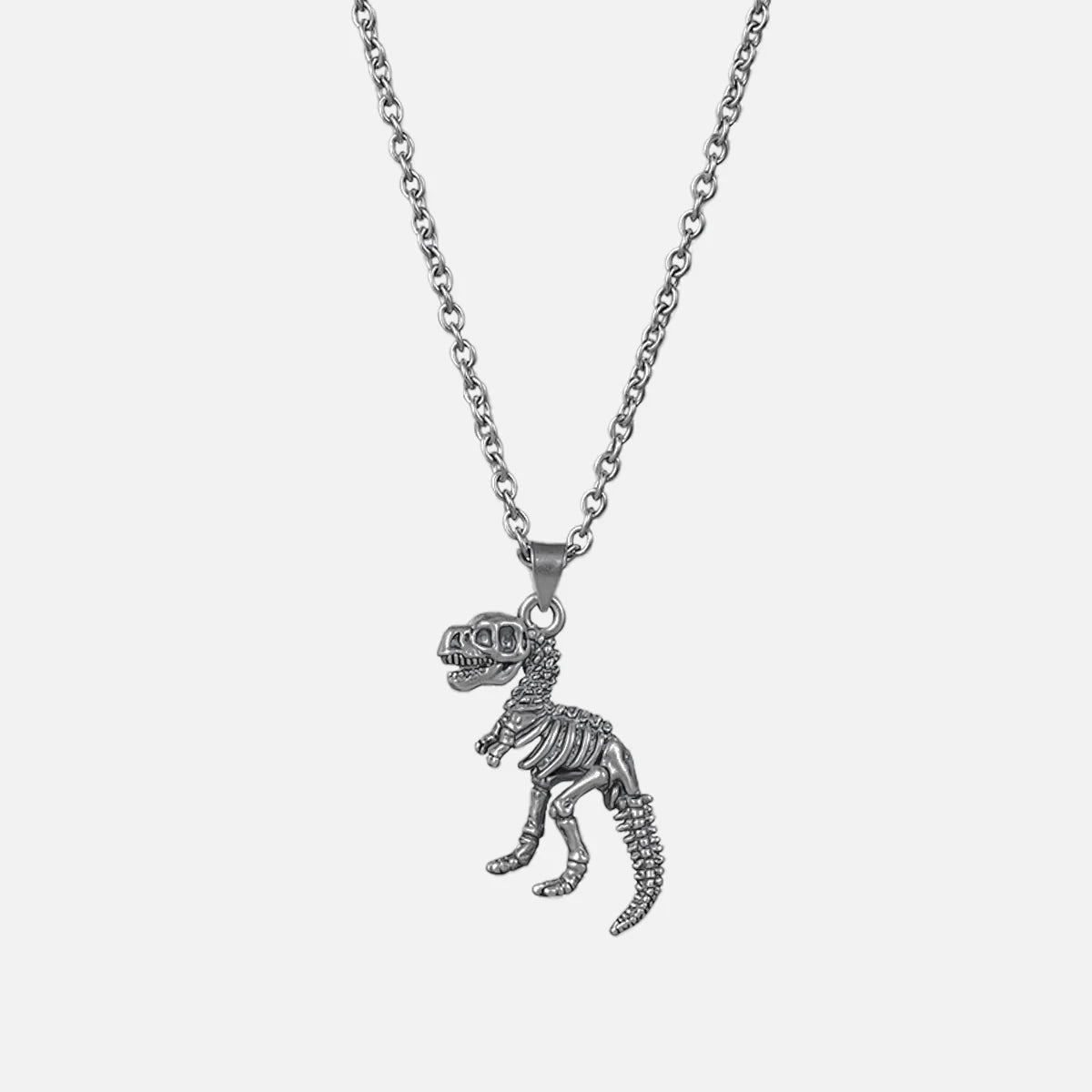 This necklace features a detailed T-Rex skeleton, symbolizing immense strength and resilience. This item is sold individually.