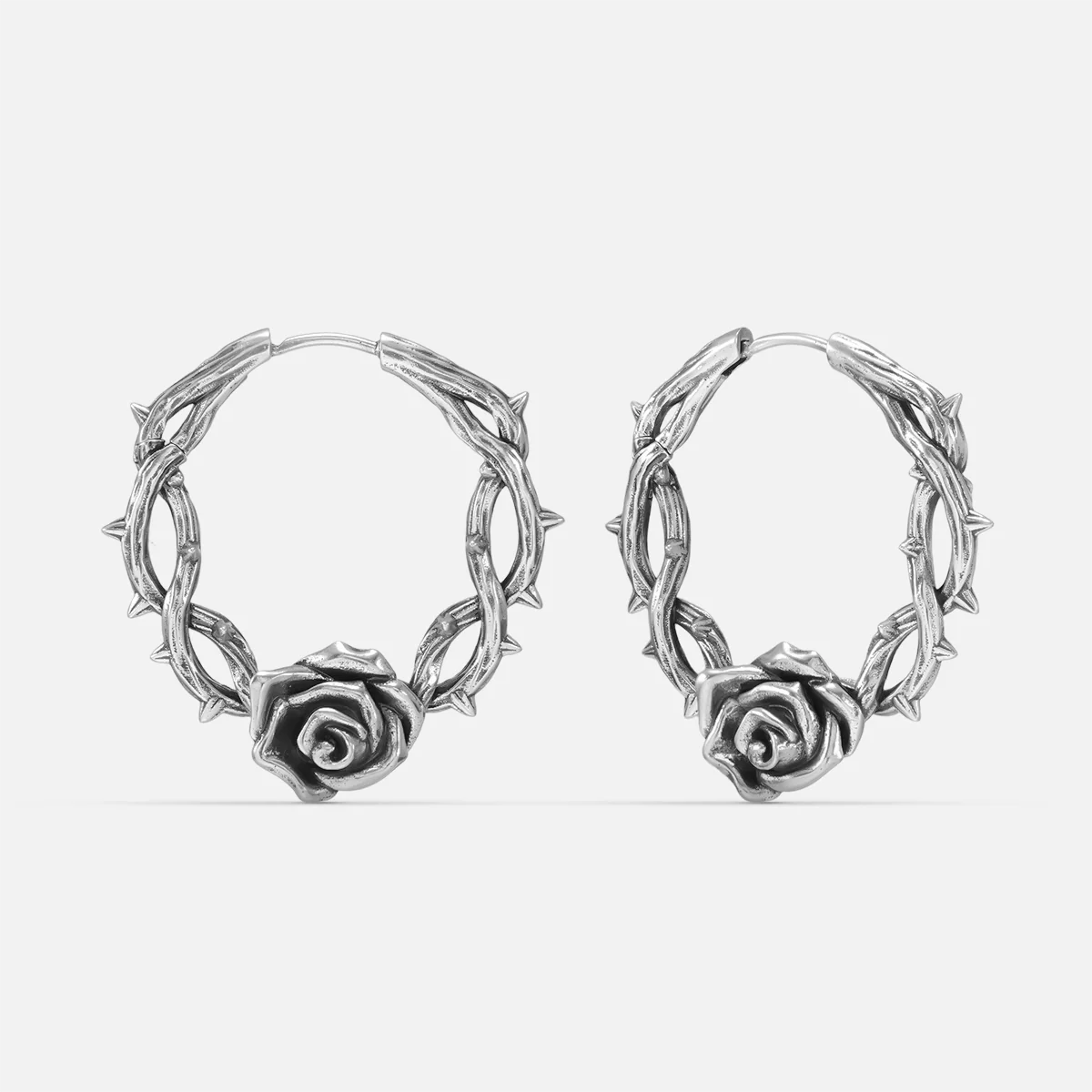 Rose Embrace Earrings feature a twisted hoop of thorny vines holding a sculpted rose in antique silver, ideal for lobe piercings. This item is sold as a pair.
