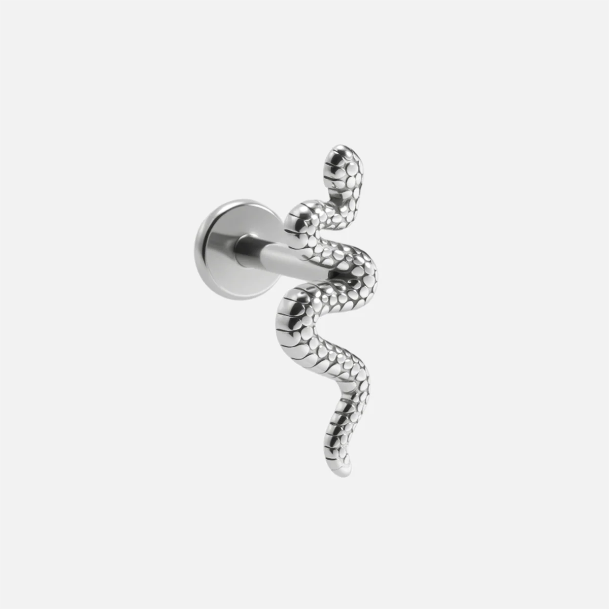 The Serpent-Inspired Flat Back Stud features a sleek, minimalist design with a captivating serpentine form, adding elegance to any piercing. This item is sold separately.