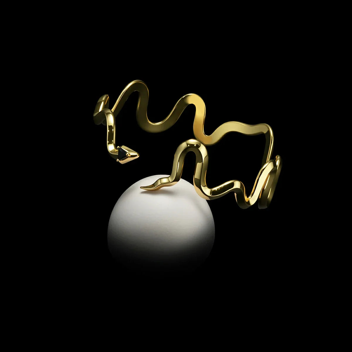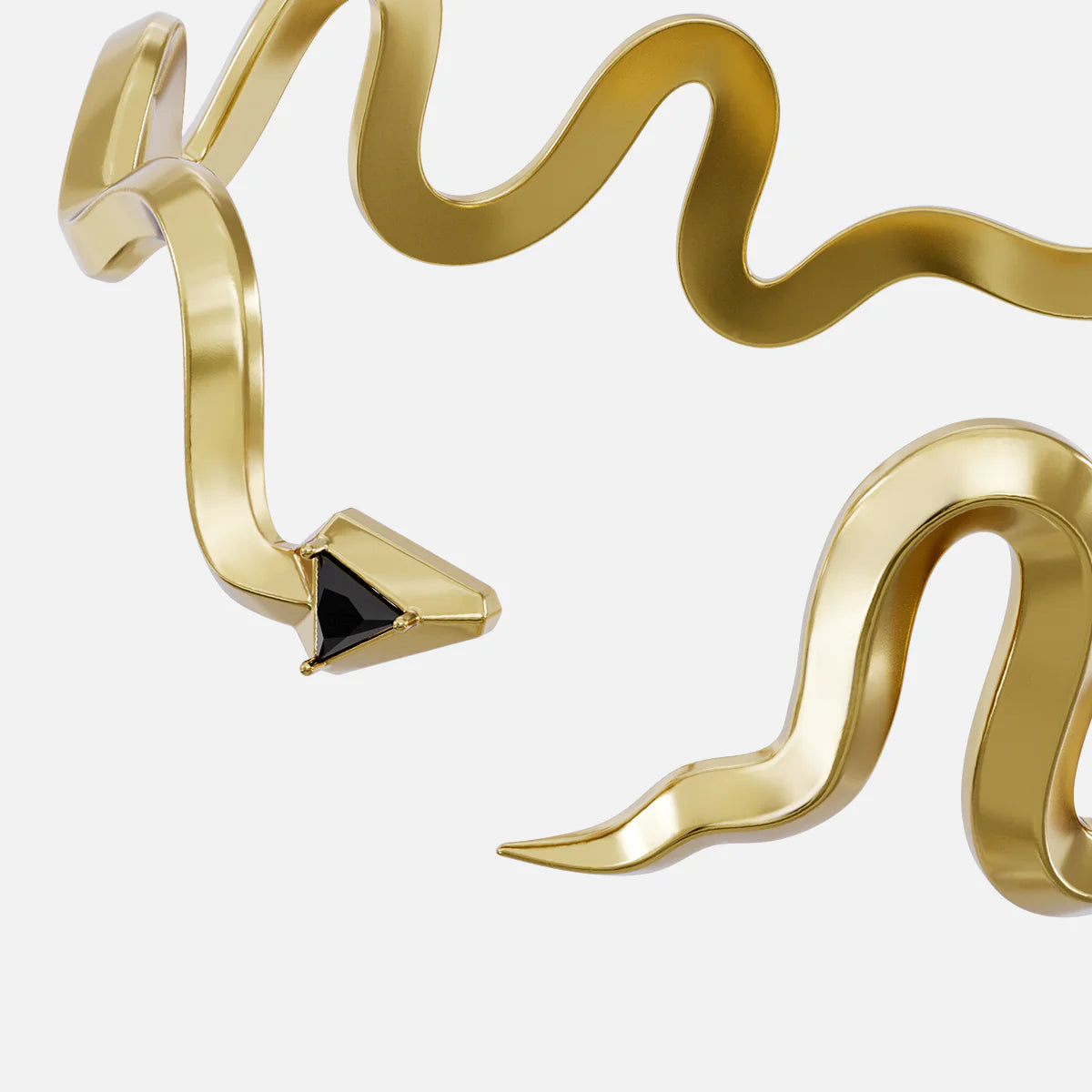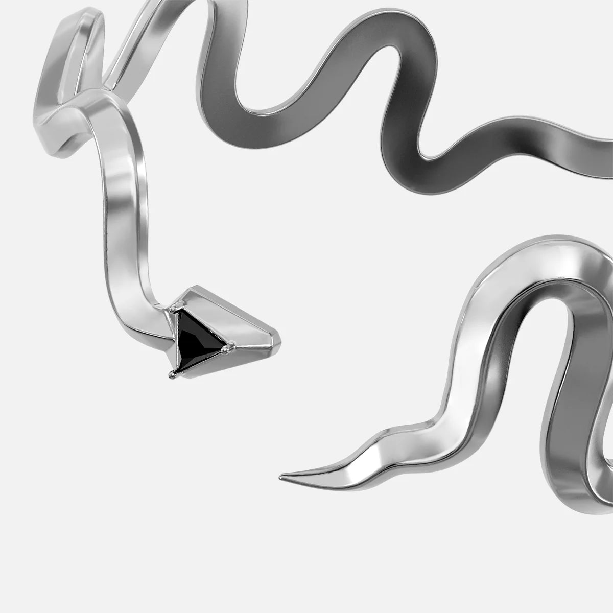 An open arm cuff that follows a continuous snake line, ending in a faceted black pyramid head. The profile is slim and reflective—movement kept to a clear boundary along the forearm.