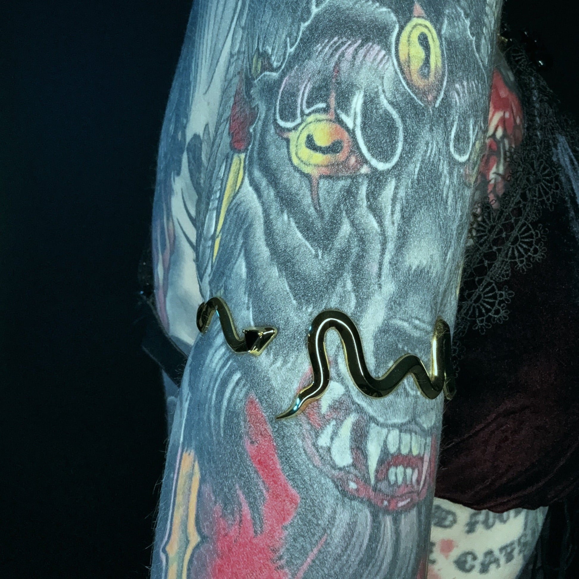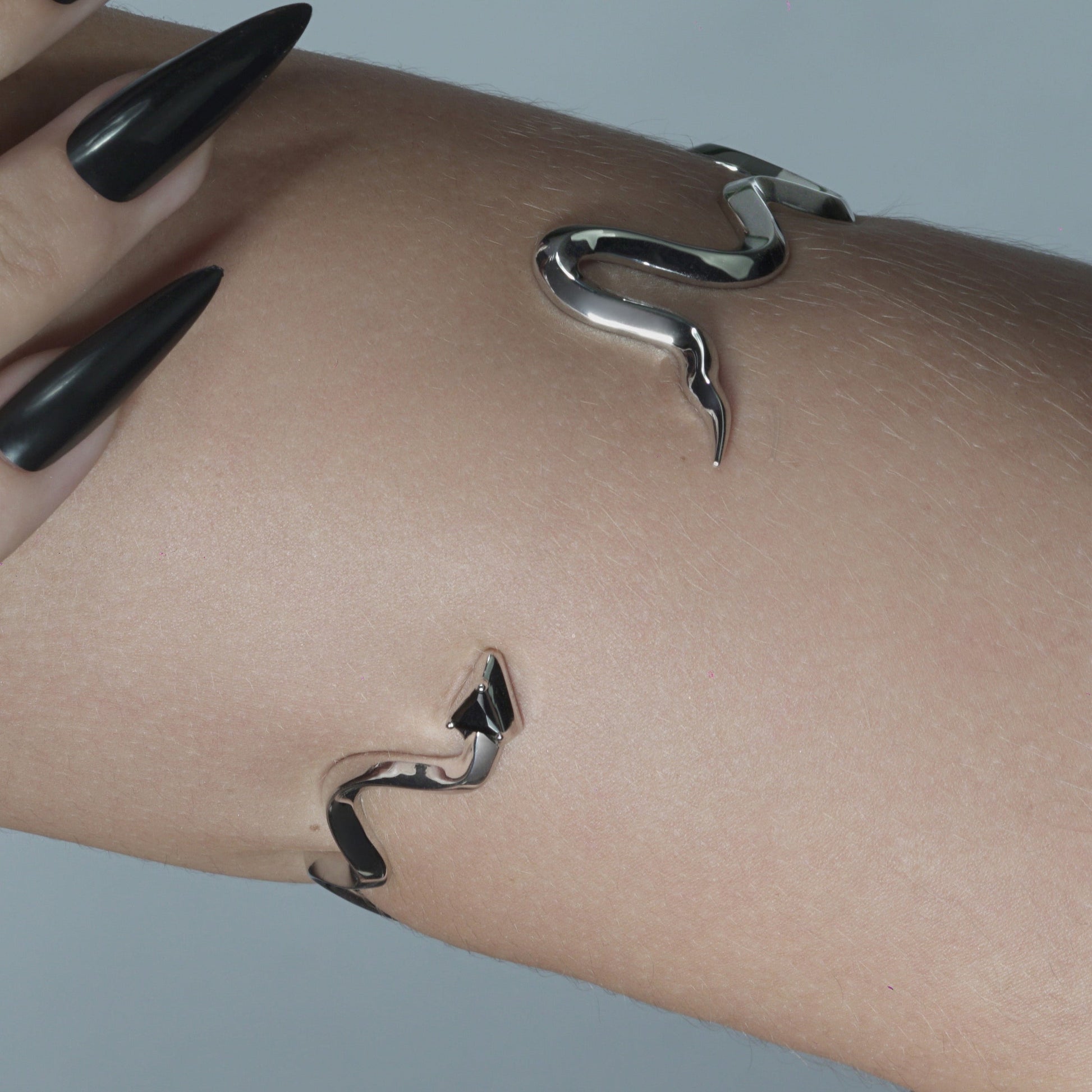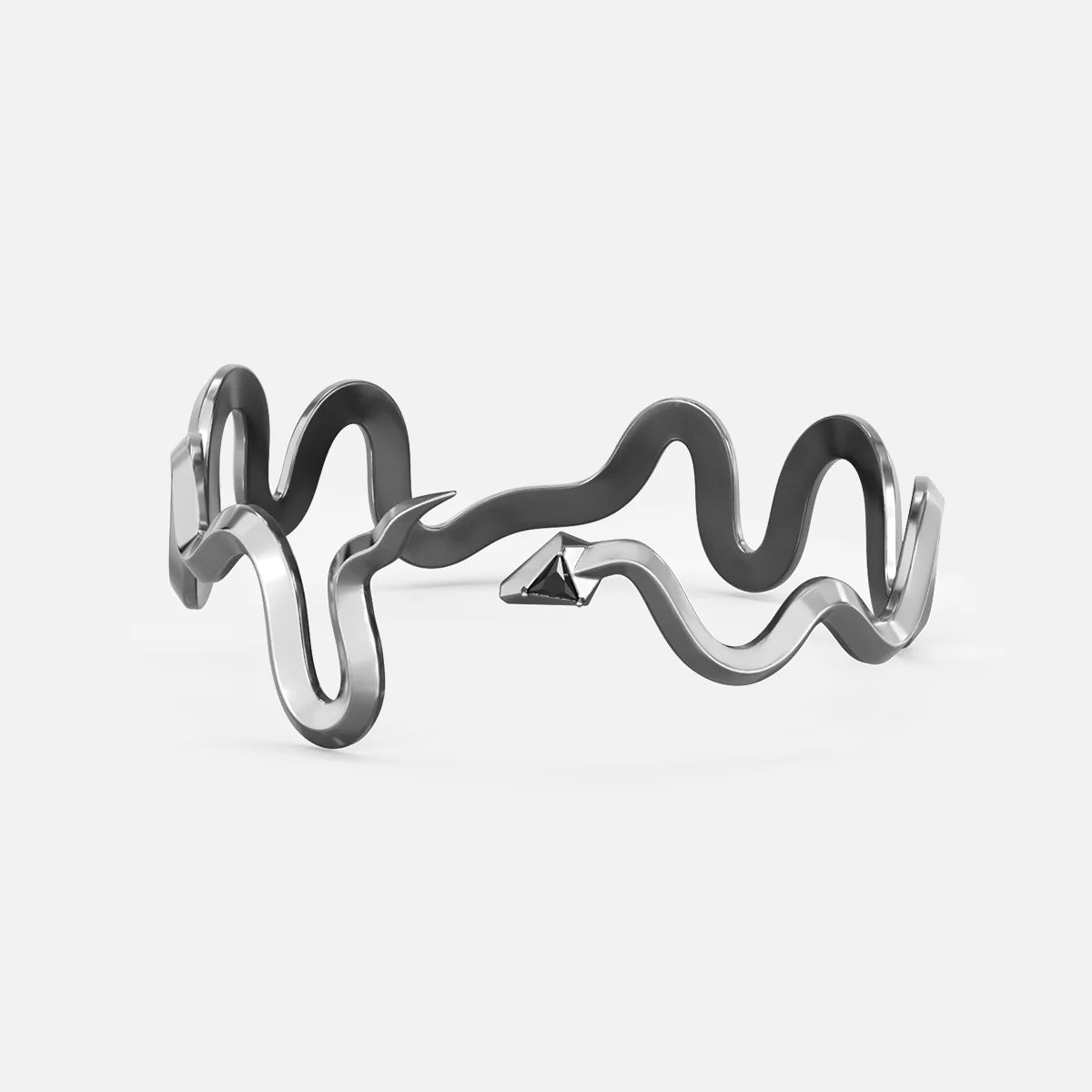 An open arm cuff that follows a continuous snake line, ending in a faceted black pyramid head. The profile is slim and reflective—movement kept to a clear boundary along the forearm.