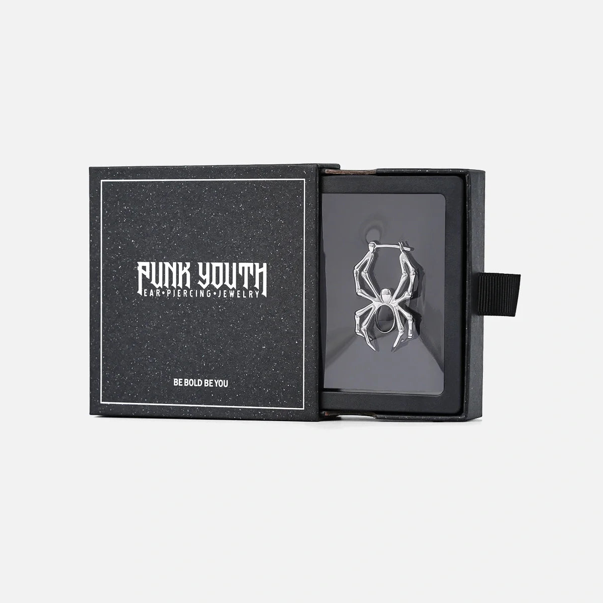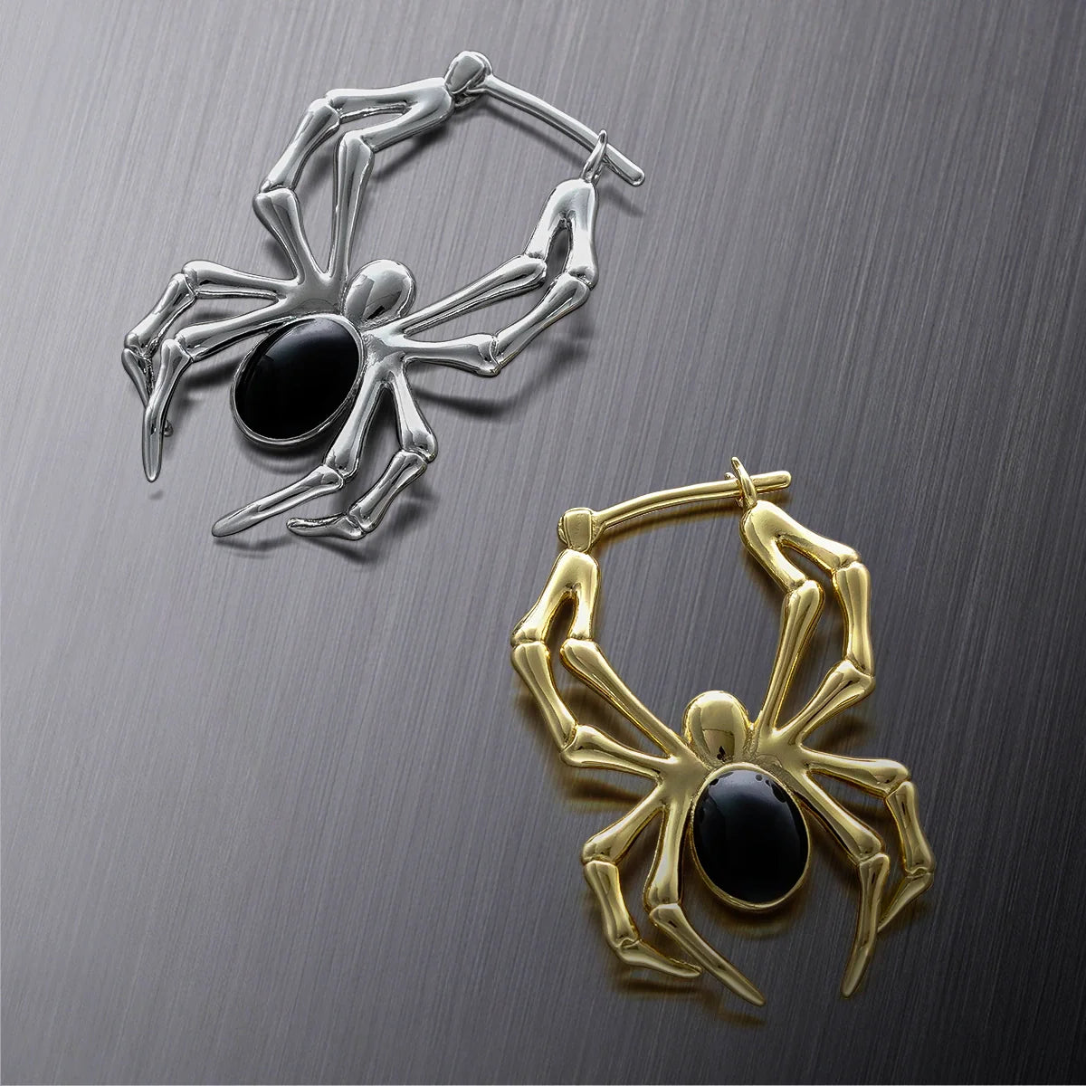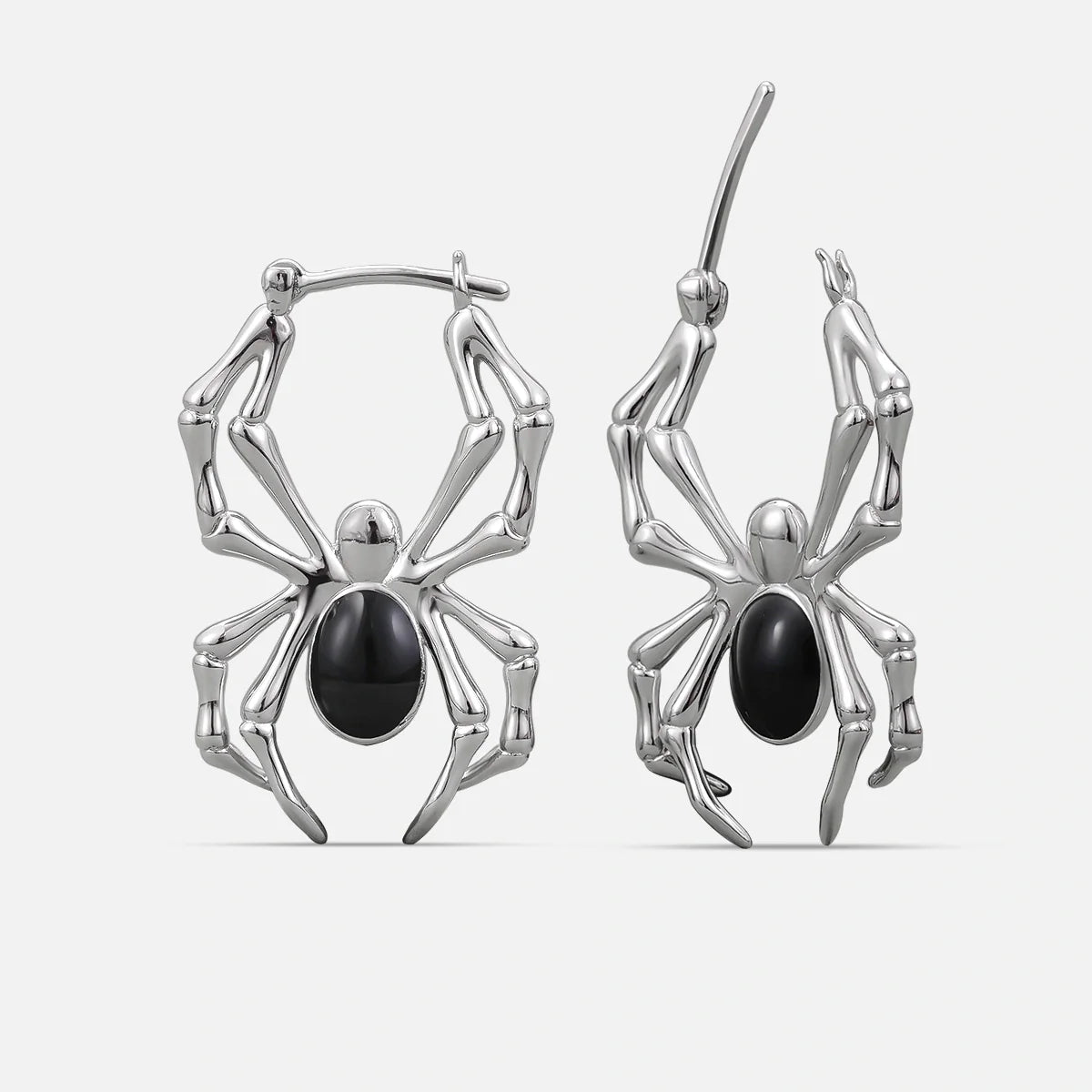 Shadow Spider Earrings feature a sculpted spider silhouette with jointed legs and a glossy black cabochon body, crafted in polished silver—ideal for bold lobe piercings. This item is sold as a pair.