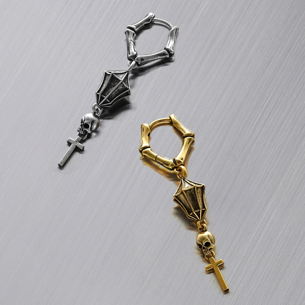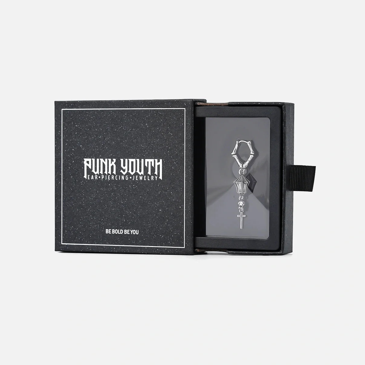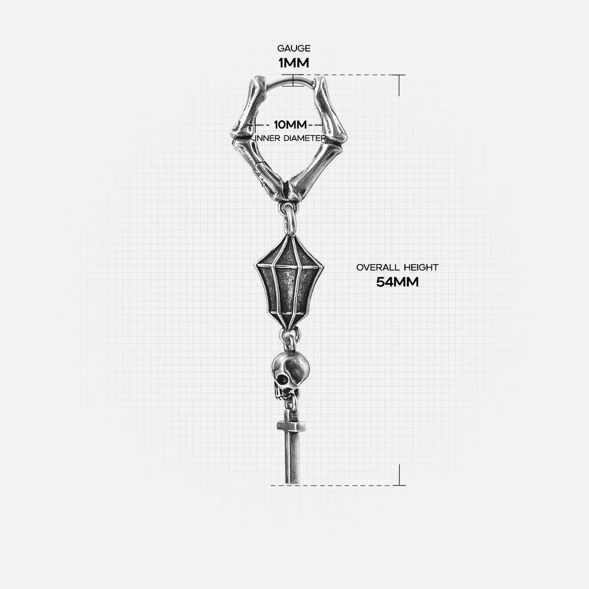 Skull Lantern Earrings feature a skeletal hoop with a detailed lantern charm, complete with a sculpted skull and cross in antique silver. This item is sold as a pair.