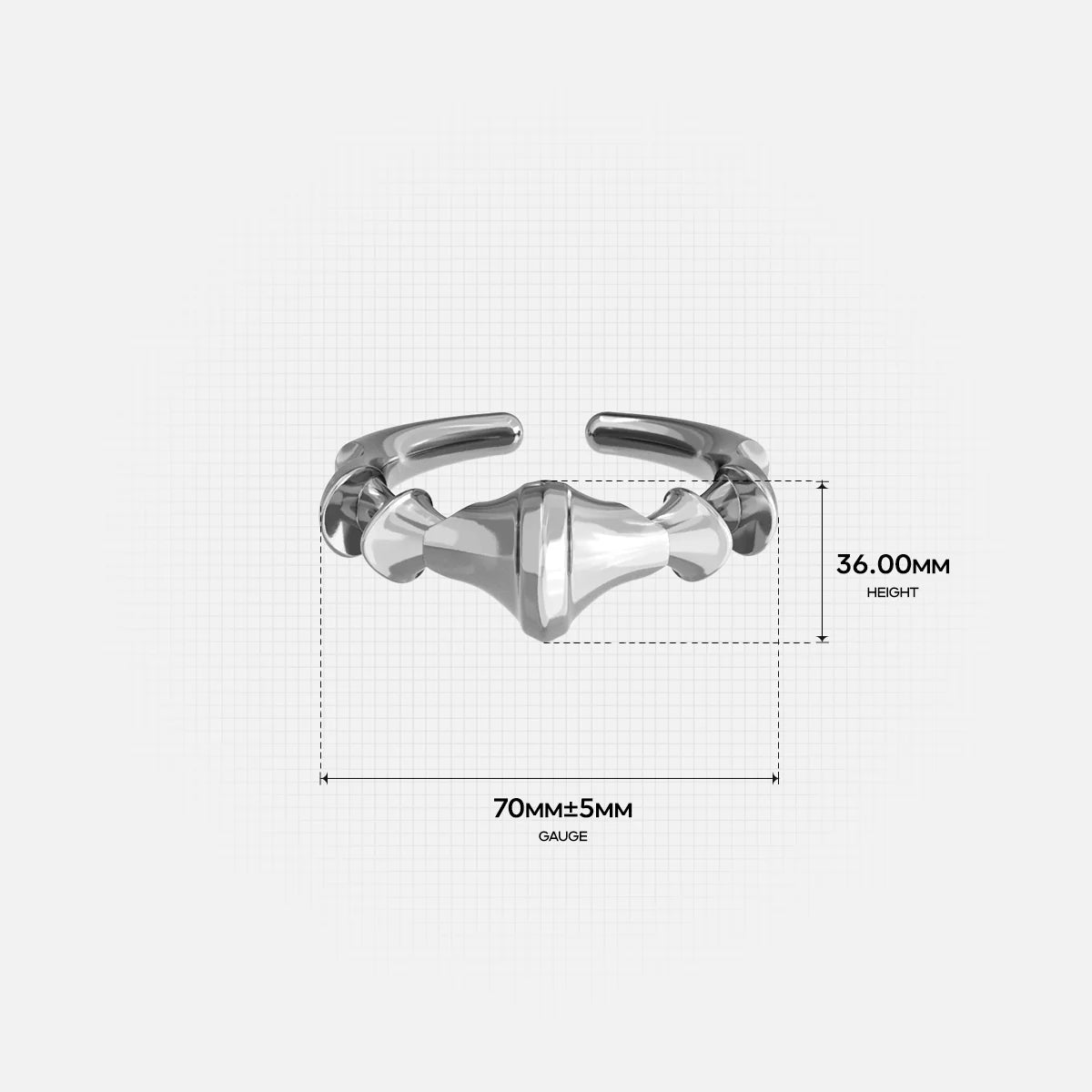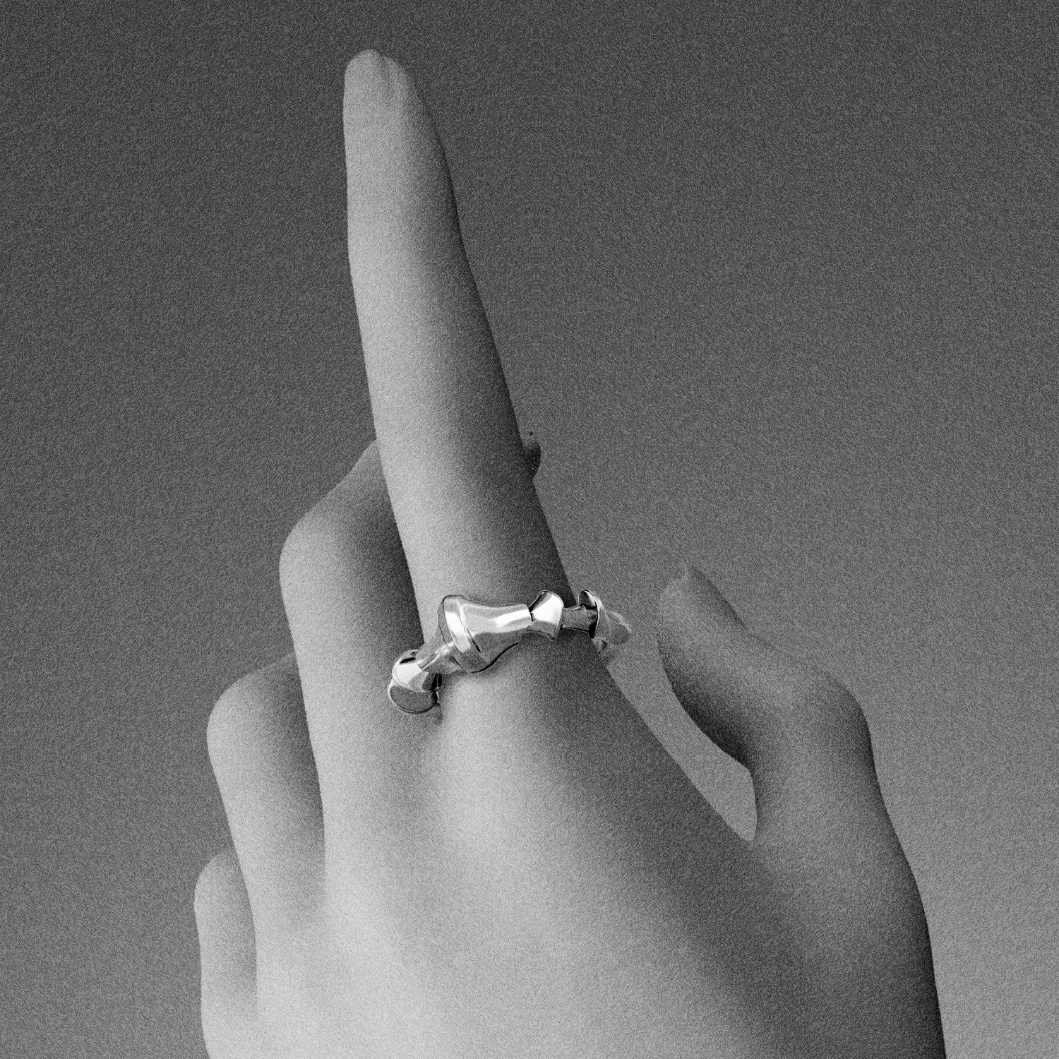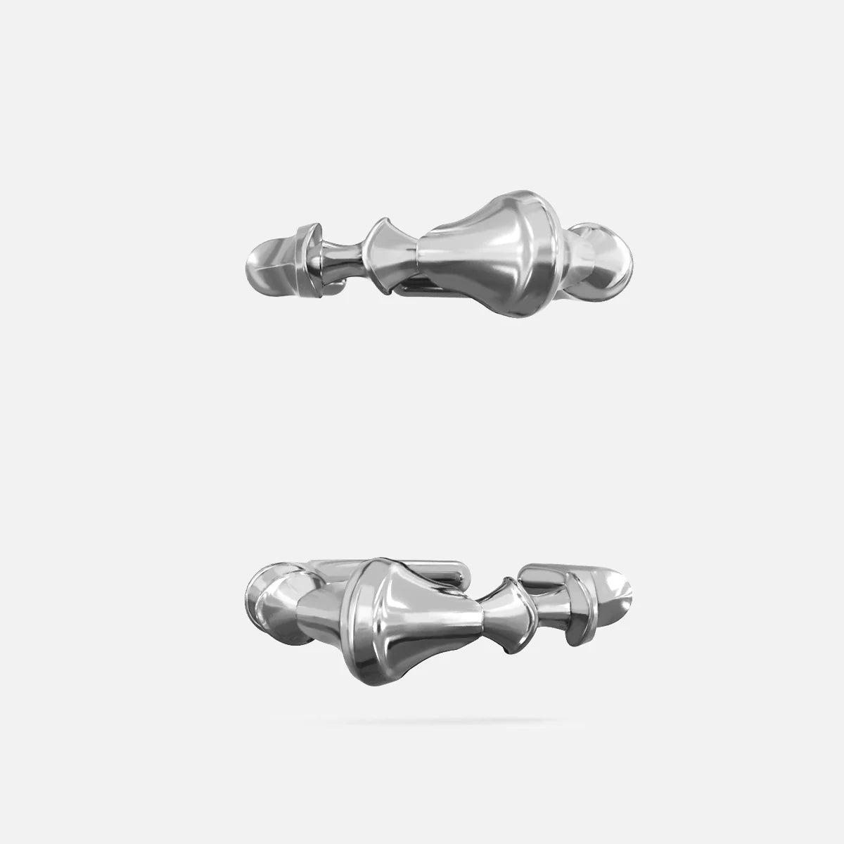 The Spinal Joint Open Ring sets a central vertebra-like form between two compact end segments. Mass sits where pressure gathers; edges taper where movement needs room. Bone logic translated into metal.