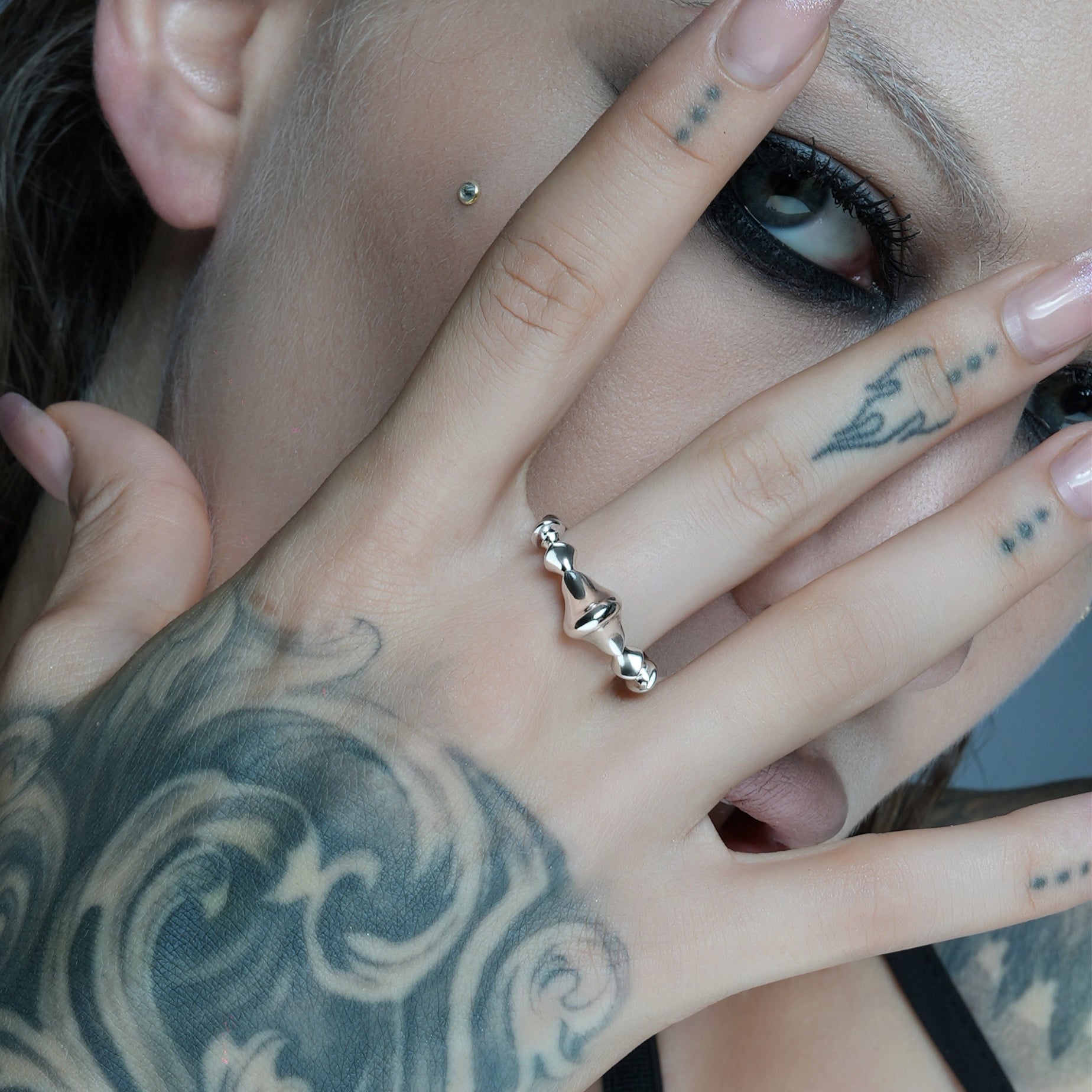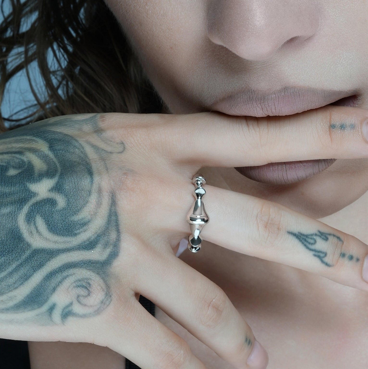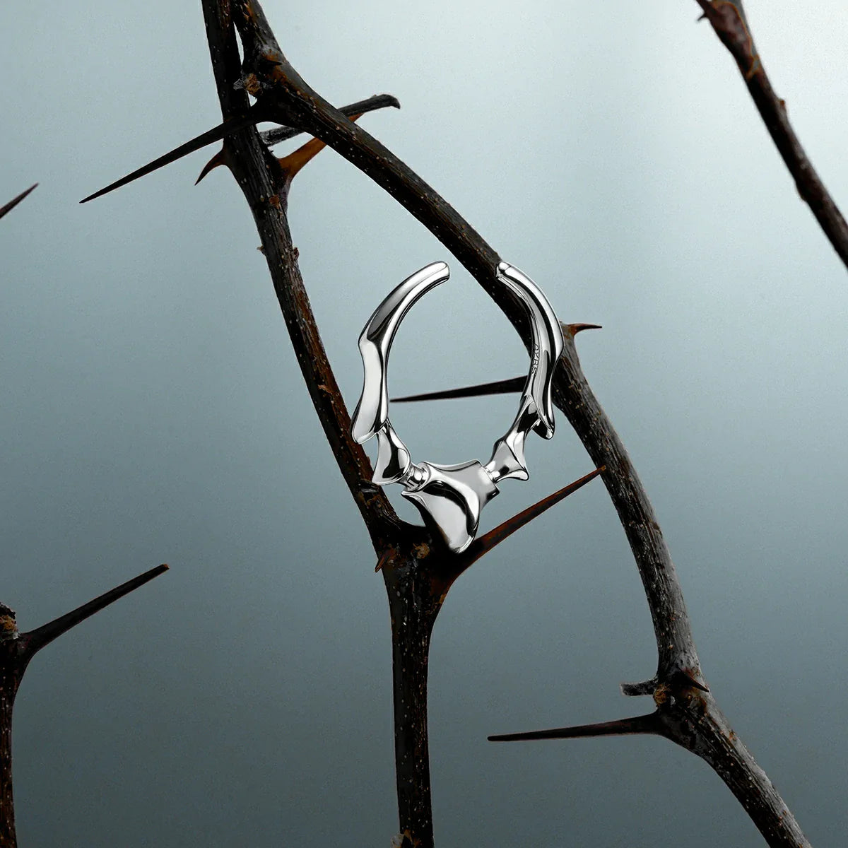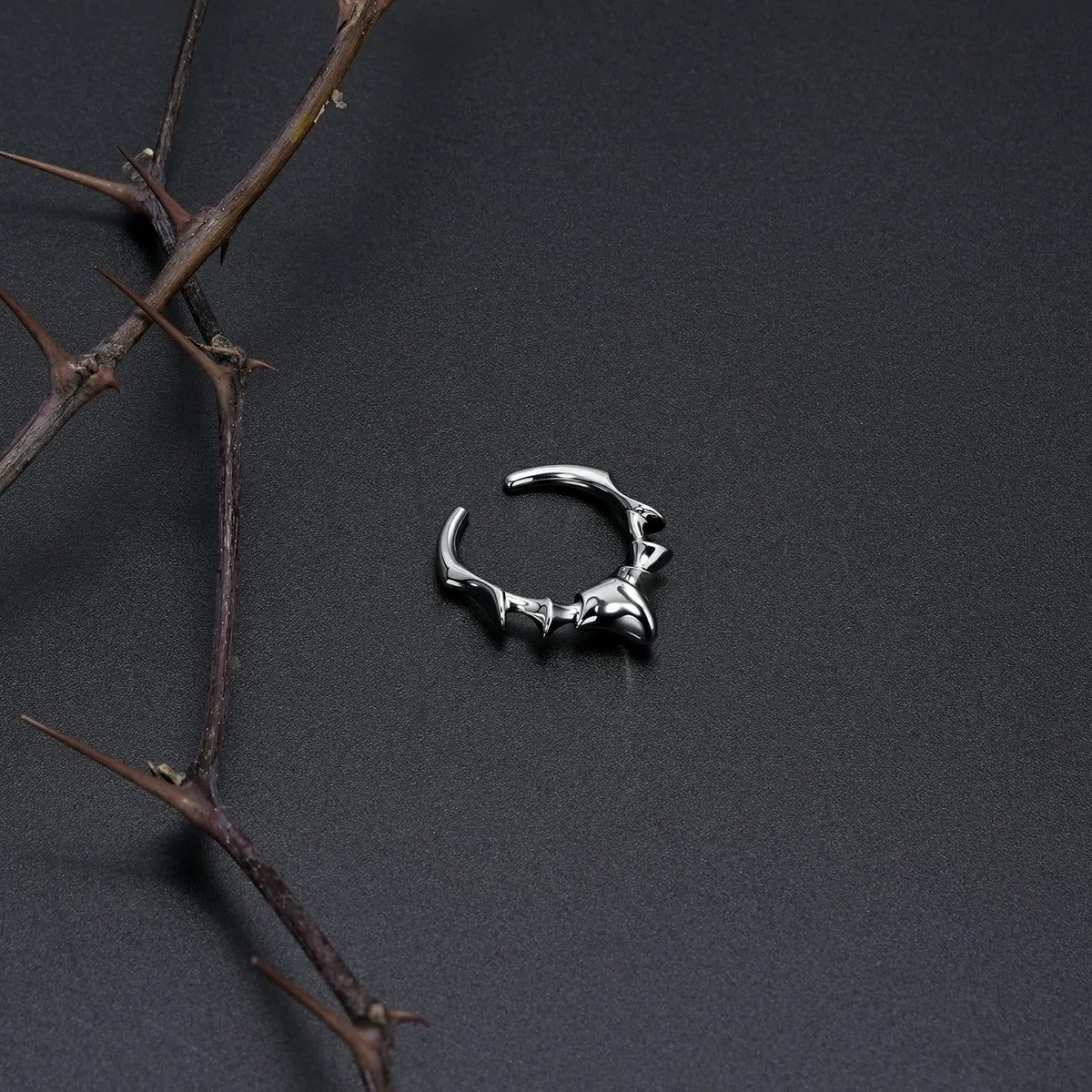 The Spinal Joint Open Ring sets a central vertebra-like form between two compact end segments. Mass sits where pressure gathers; edges taper where movement needs room. Bone logic translated into metal.