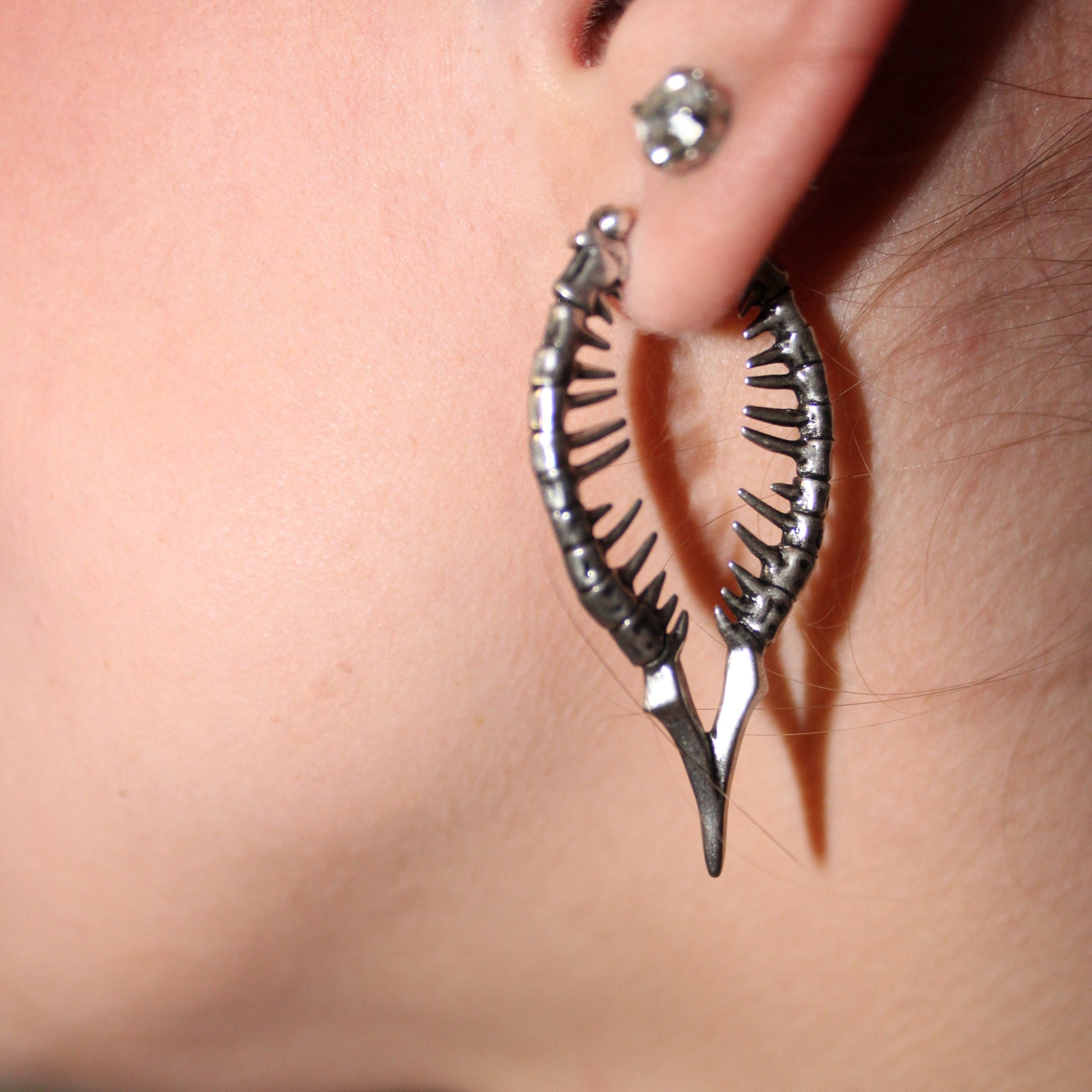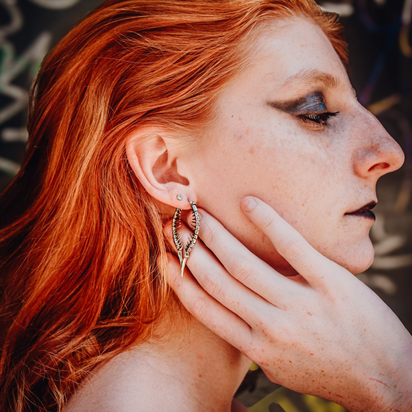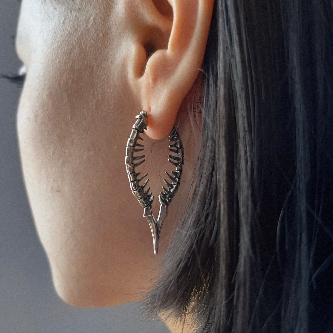 Spinal Reverie Earrings feature an eye-catching design inspired by the elegant curves of the spinal column, blending organic shapes with bold lines for a unique look. This item is sold as a pair.