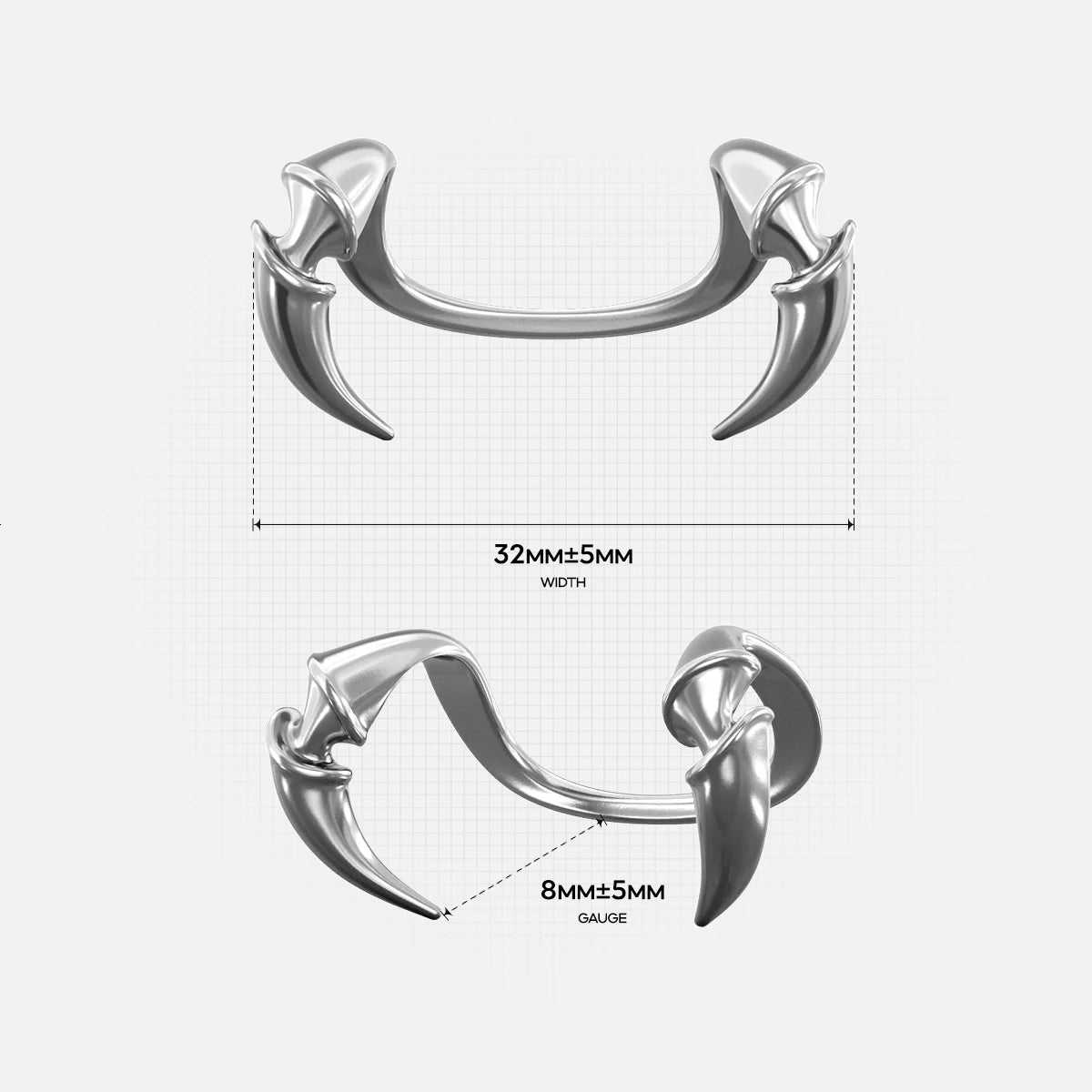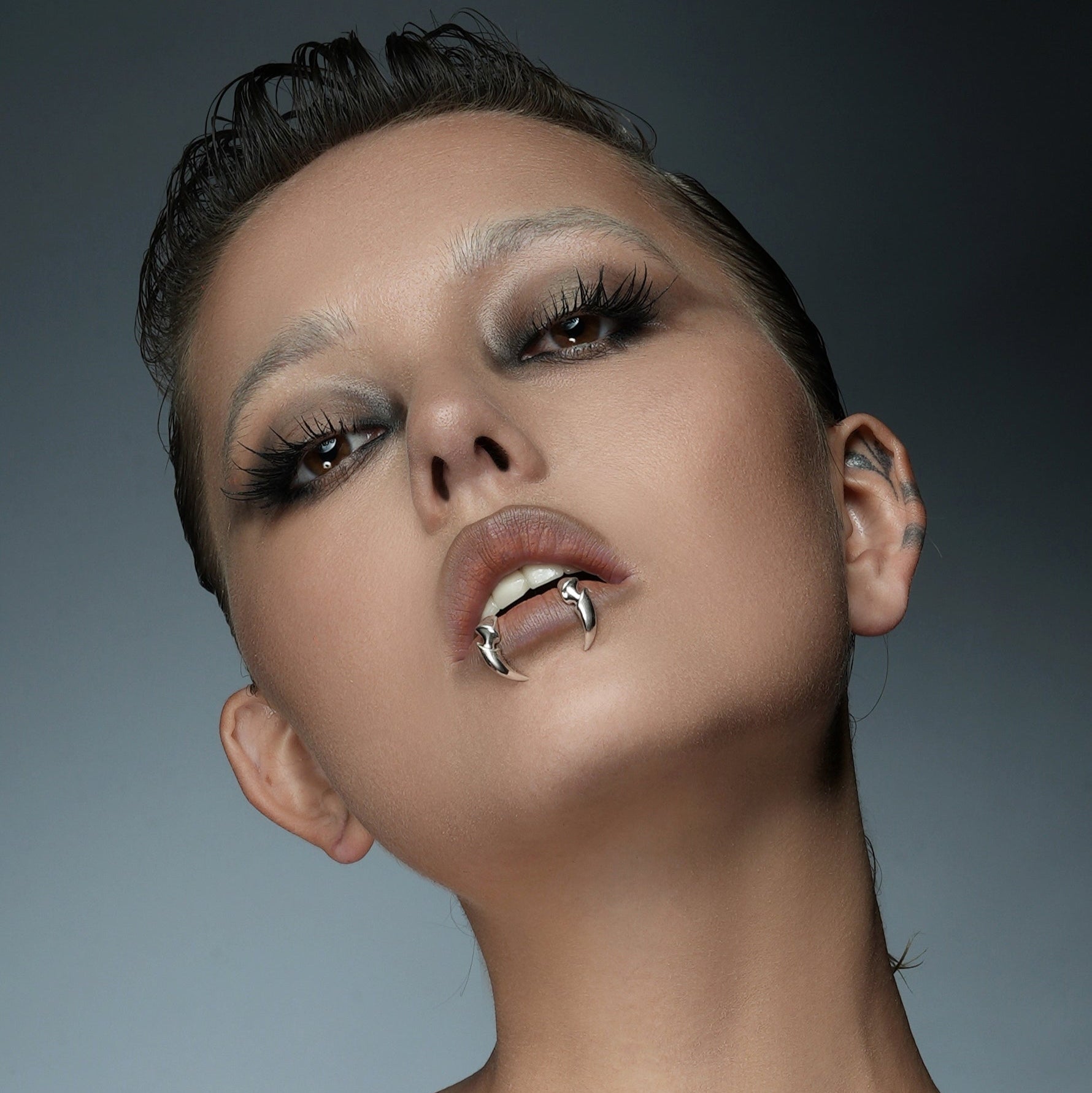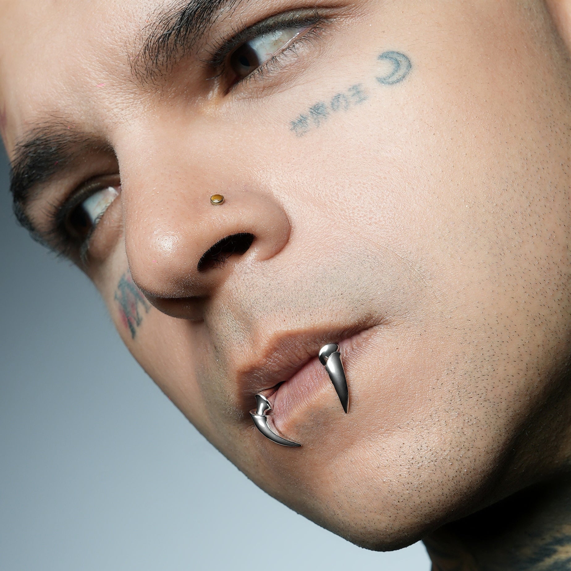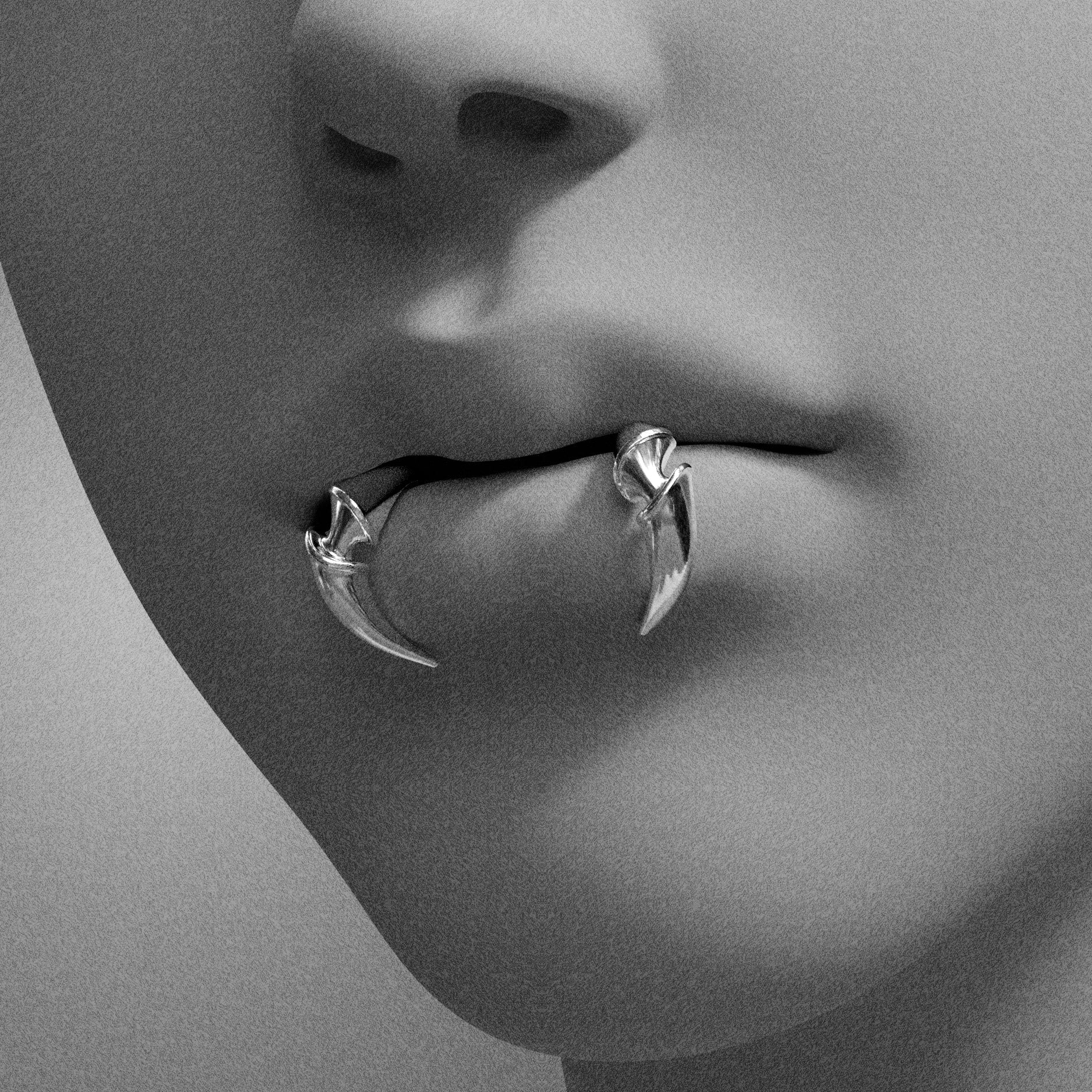 The Spine Edge Lip Cuff sets two tapered ridge tips at either end of a curved bar—balanced bite with a smooth inner seat. Mass concentrates at the edges; the center stays pared down so it wears light and stable on the lip.