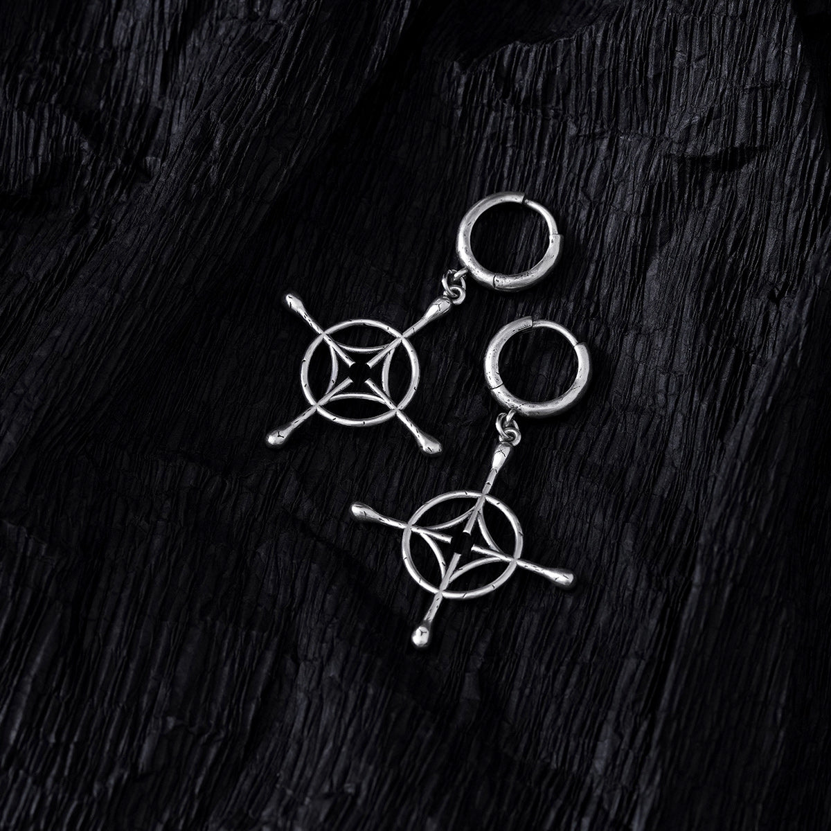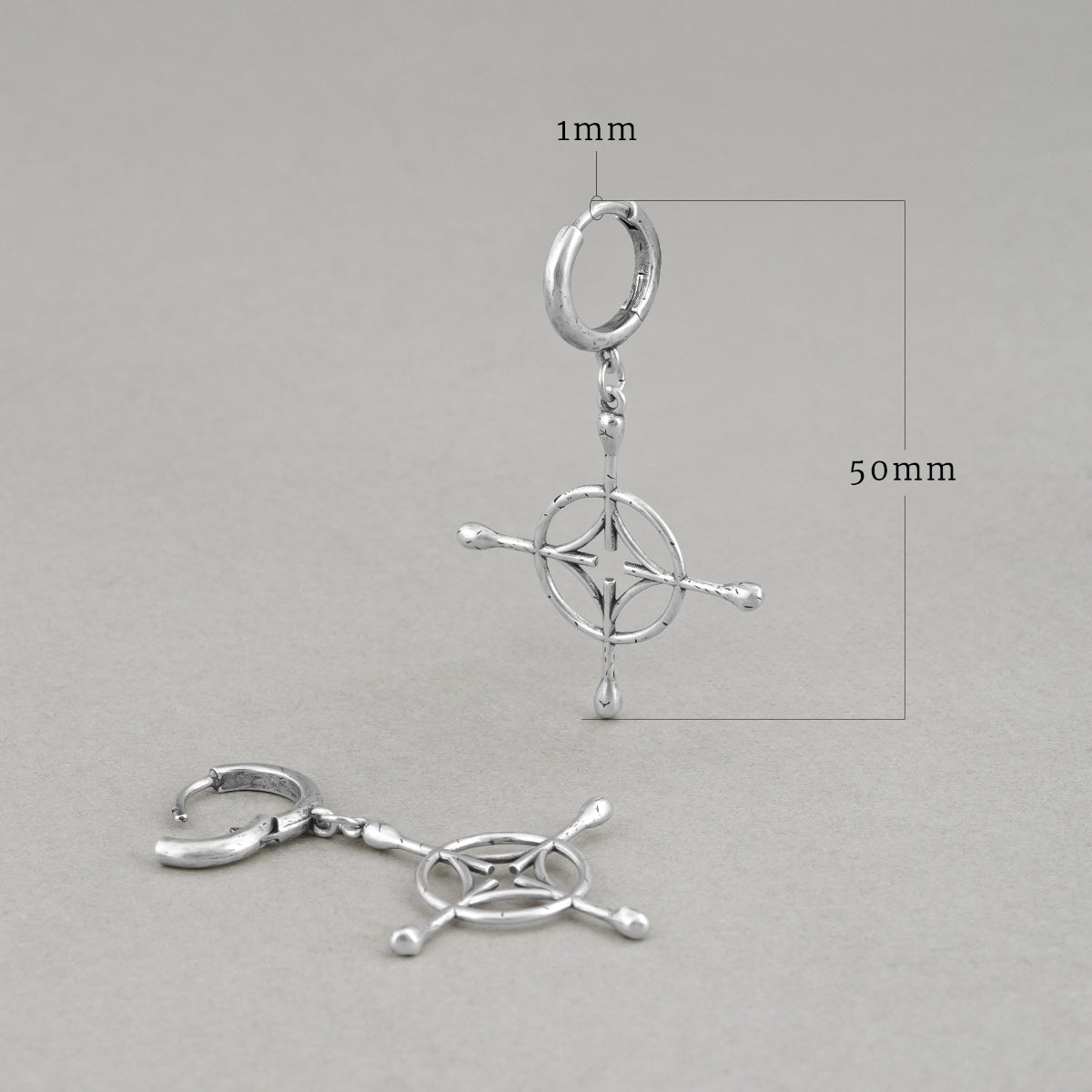 These earrings feature a sleek, modern design with intricate geometric patterns, inspired by ancient astronomical instruments. This item is sold as a pair.
