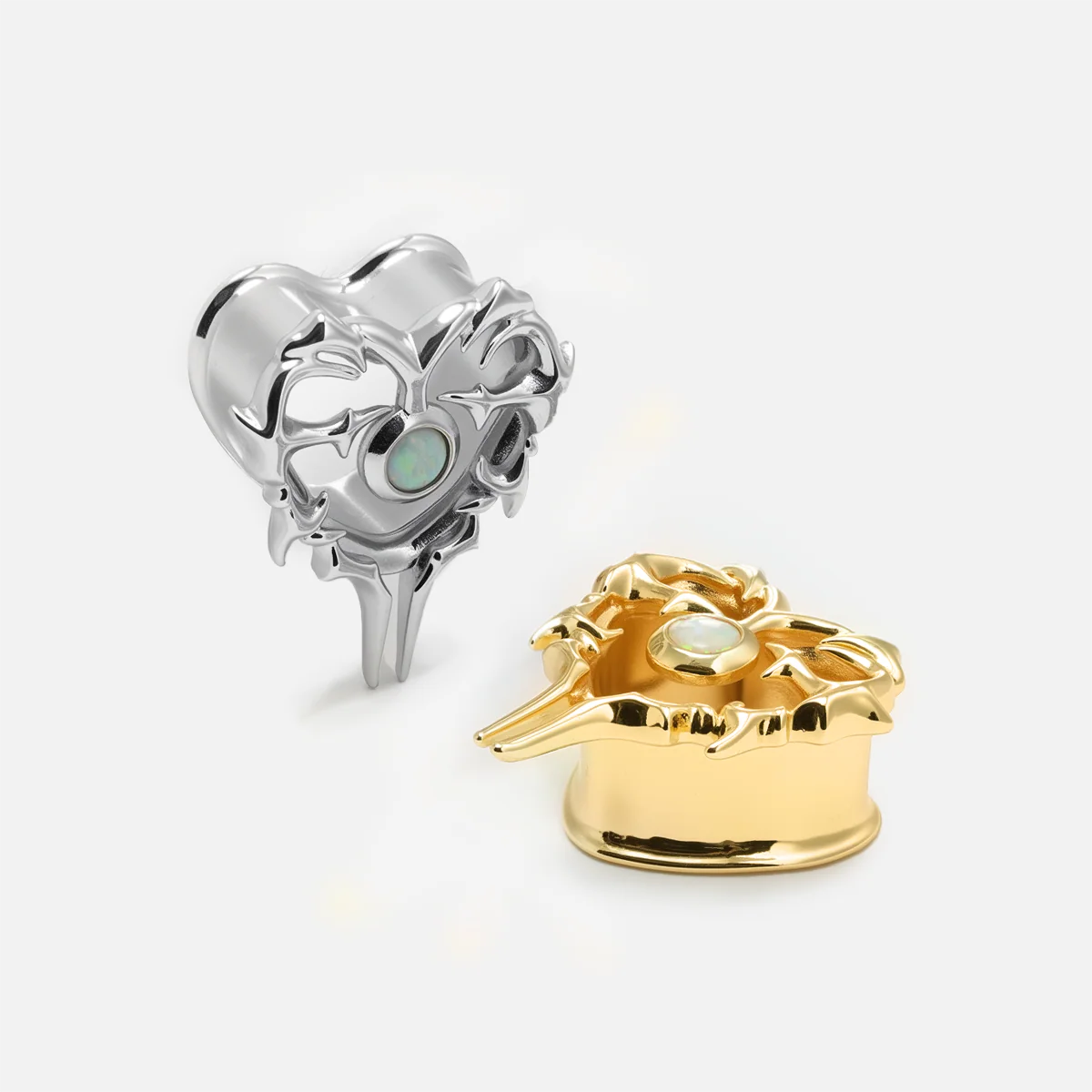 Polished silver-tone tunnels shaped like hearts, wrapped in thorn-like edges with a glowing opal at the center. This item is sold as a pair.