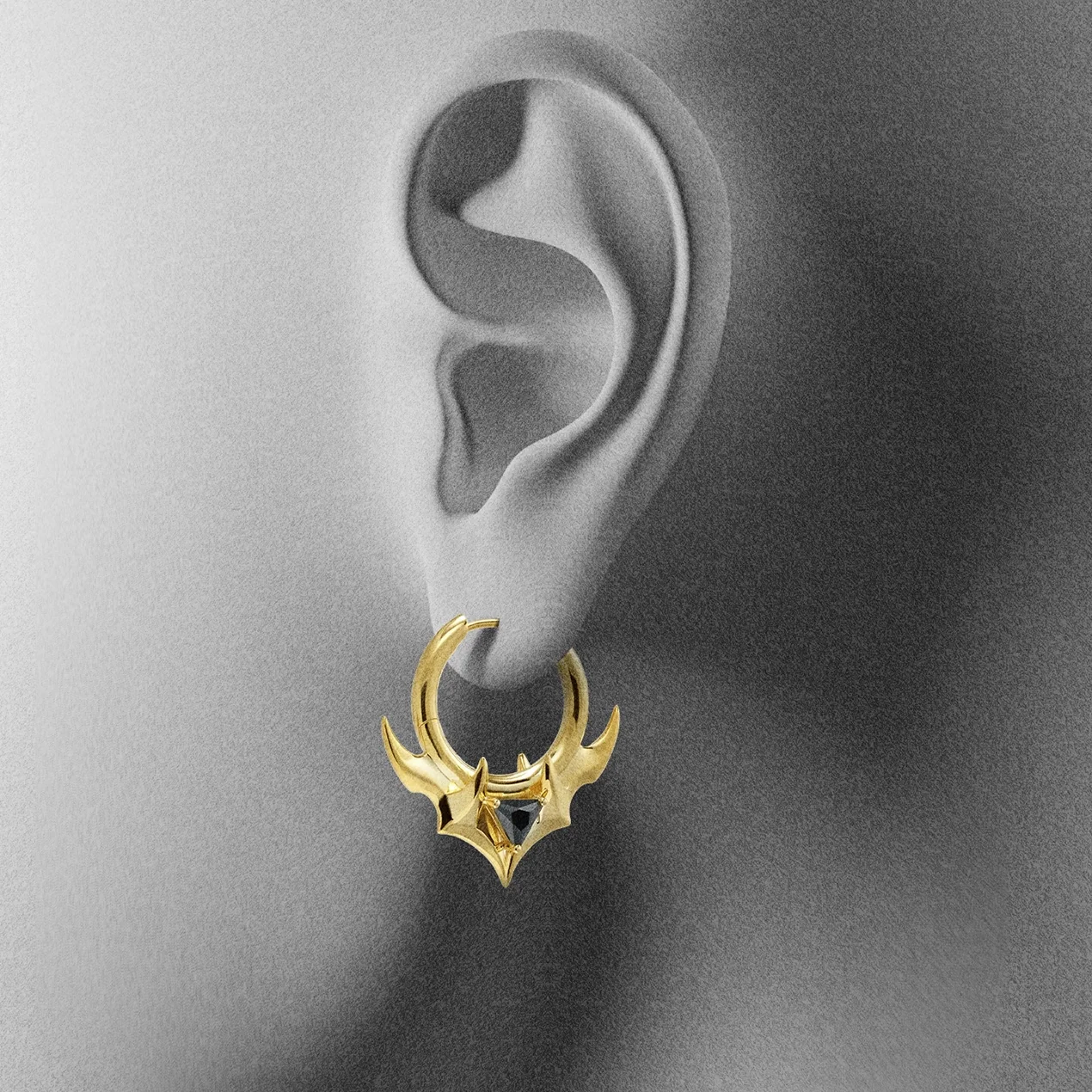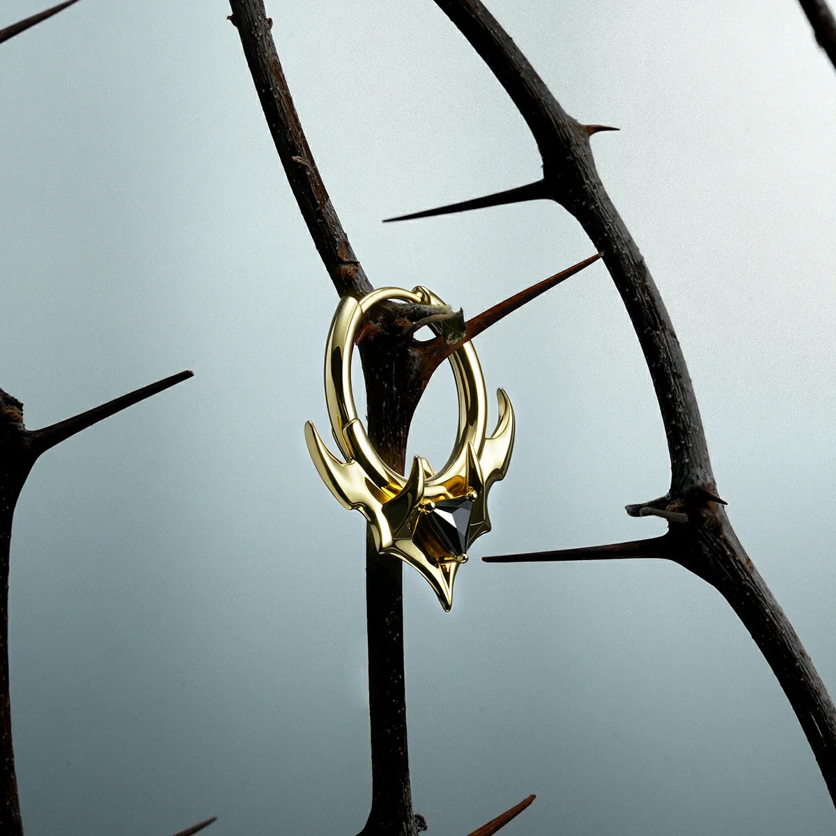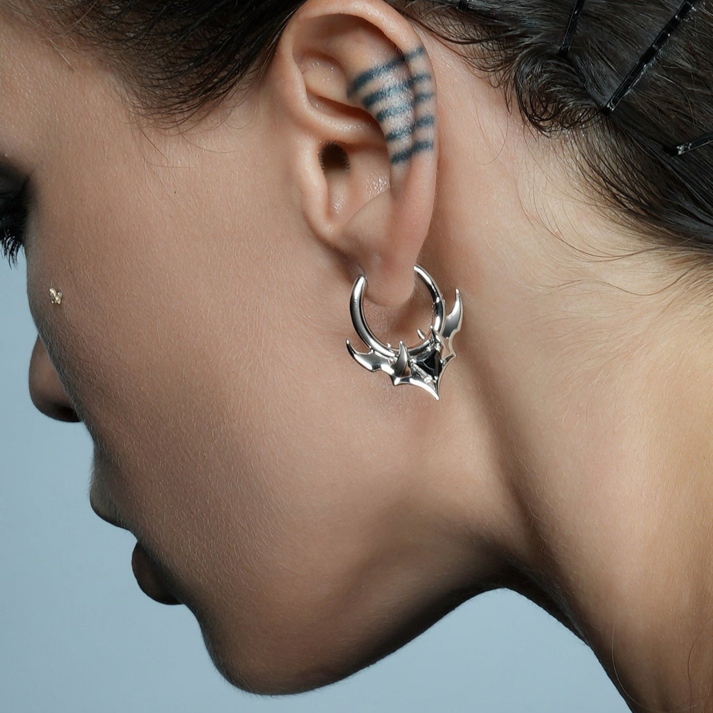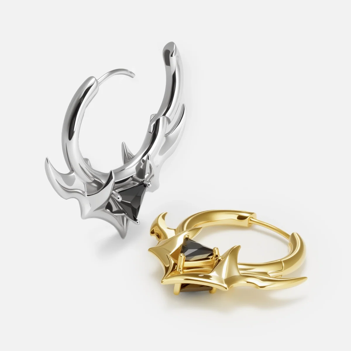 The Trident Crest Stone Hoops flare three lifted spines around a central black stone, forming a braced “crown” at the base. Openwork keeps weight down while the ridge planes stay sharp—structural, not decorative.