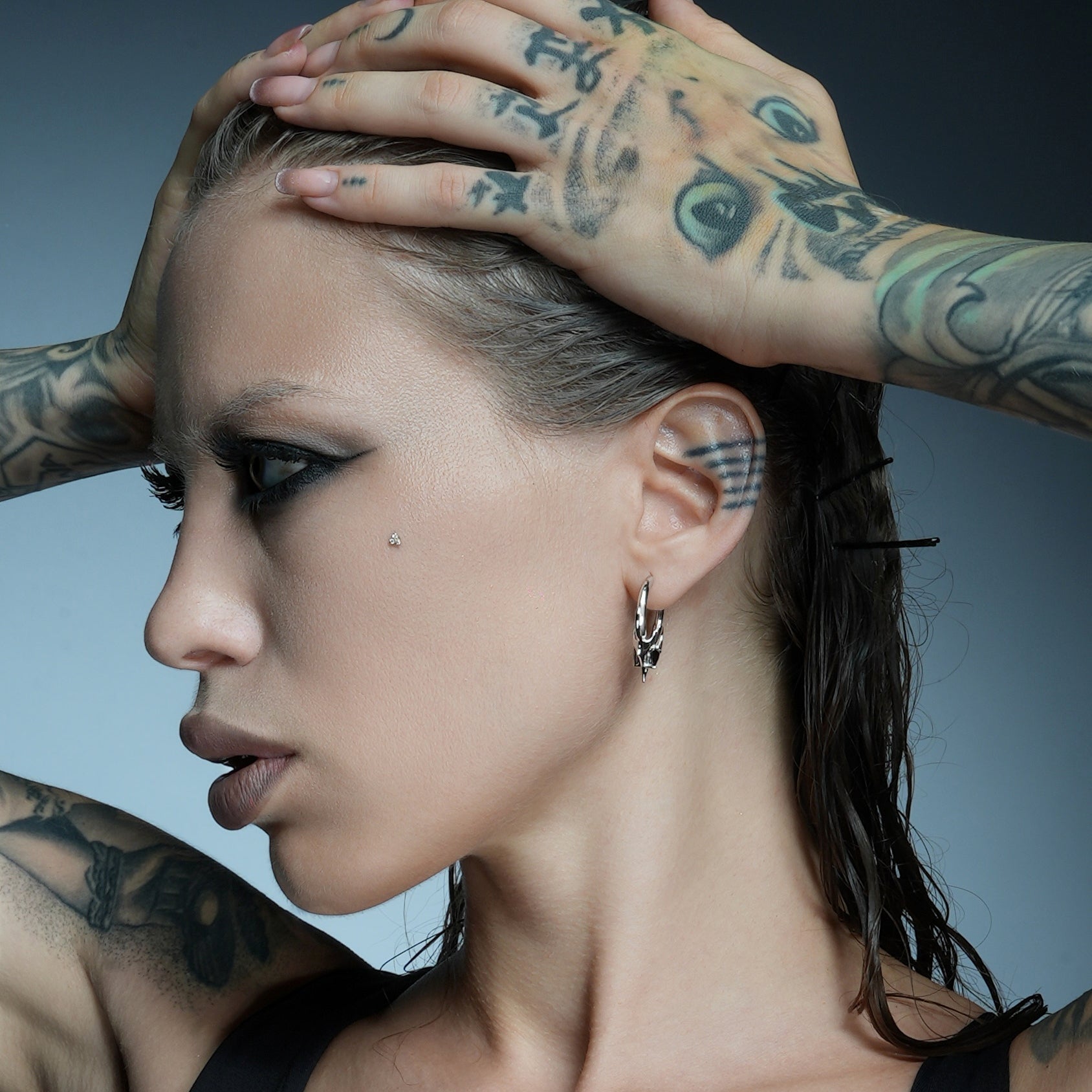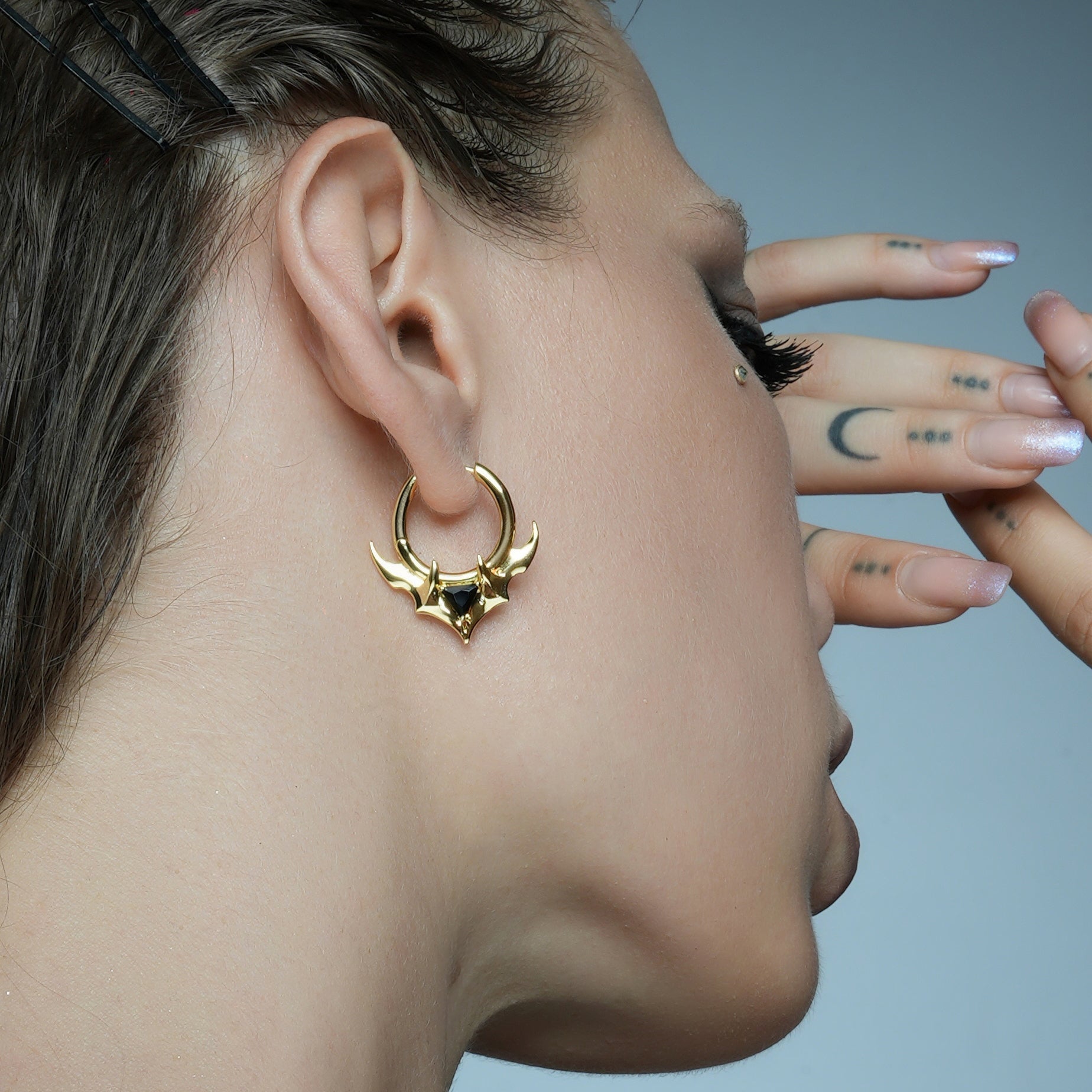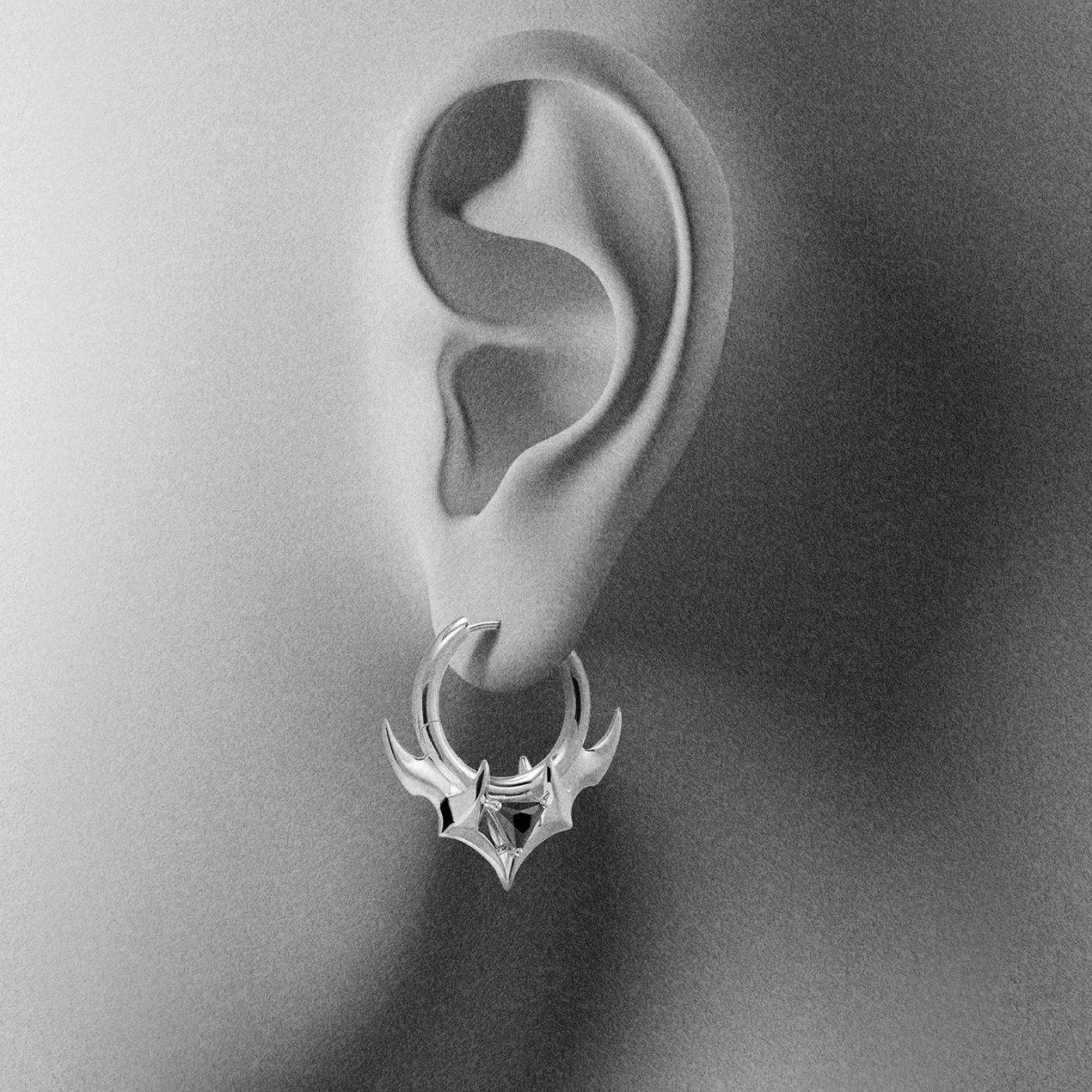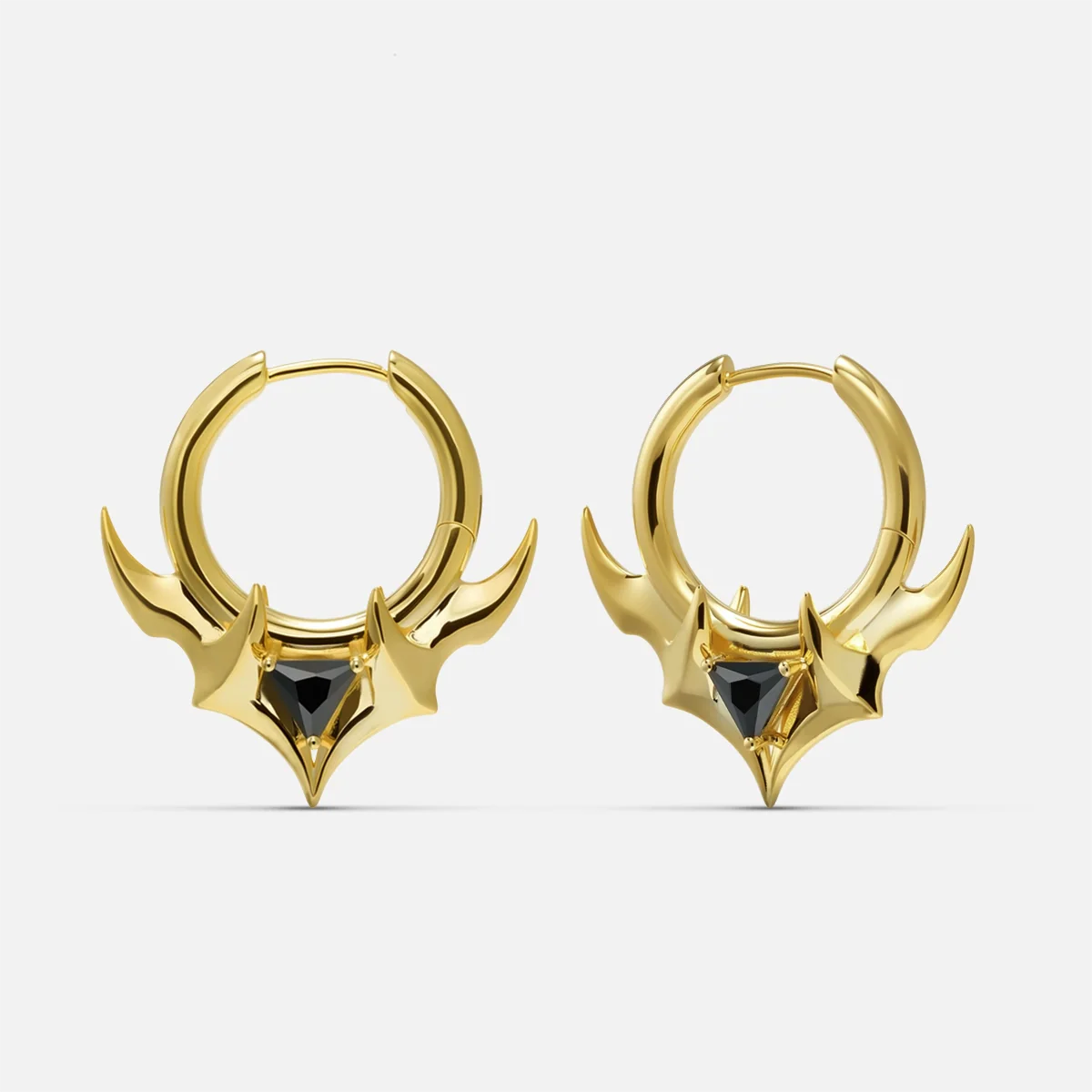 The Trident Crest Stone Hoops flare three lifted spines around a central black stone, forming a braced “crown” at the base. Openwork keeps weight down while the ridge planes stay sharp—structural, not decorative.