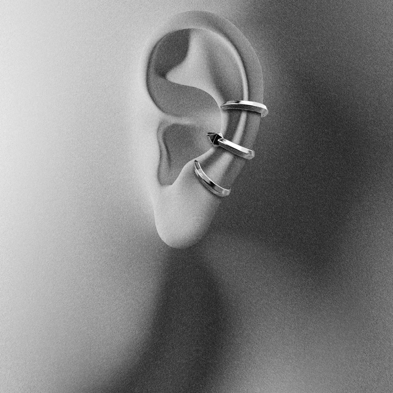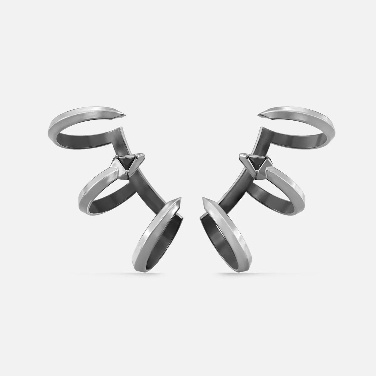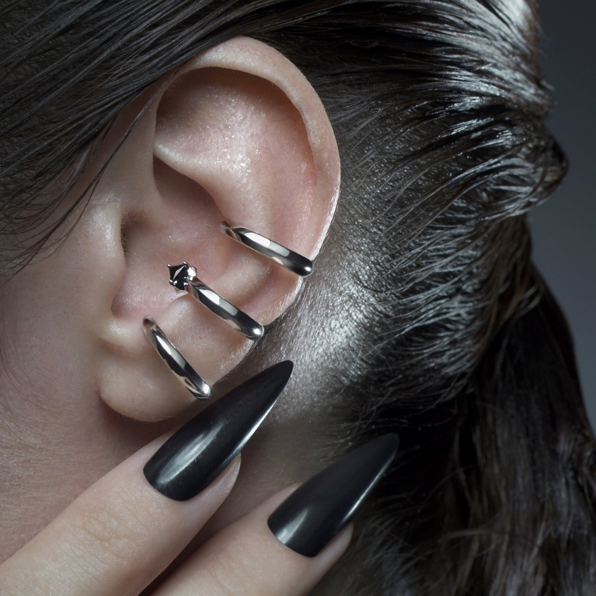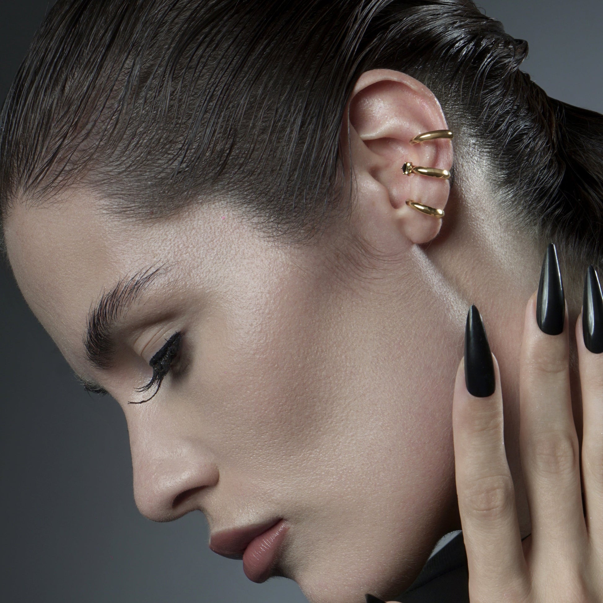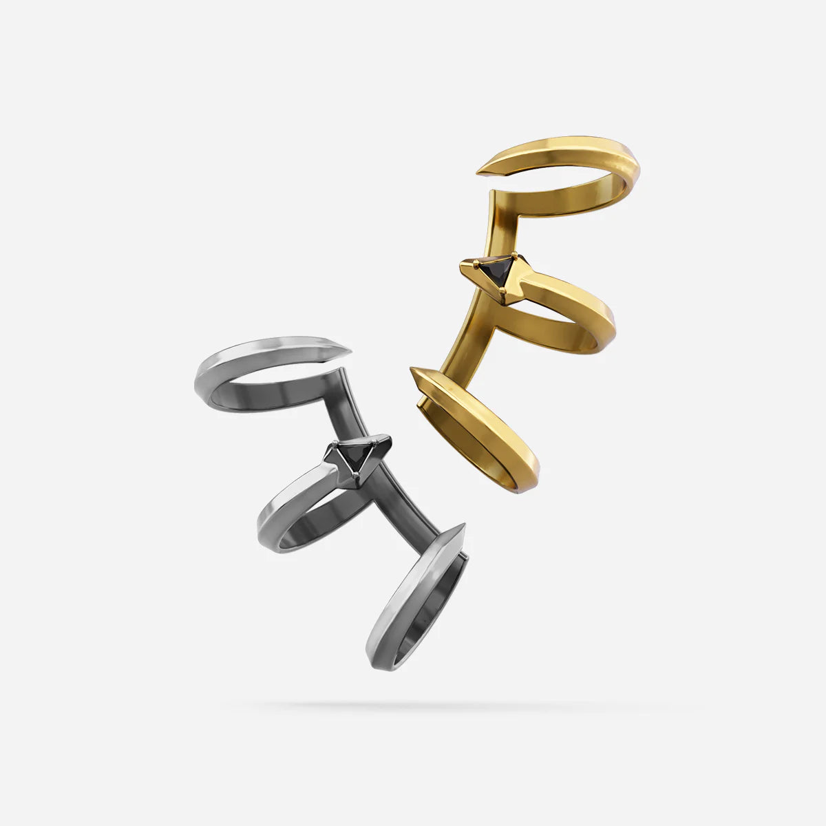 A sculptural ear cuff with an open front where two black pyramid studs face in deliberate balance. The firm arc hugs the outer ear and draws the gaze, part contour and part signal.