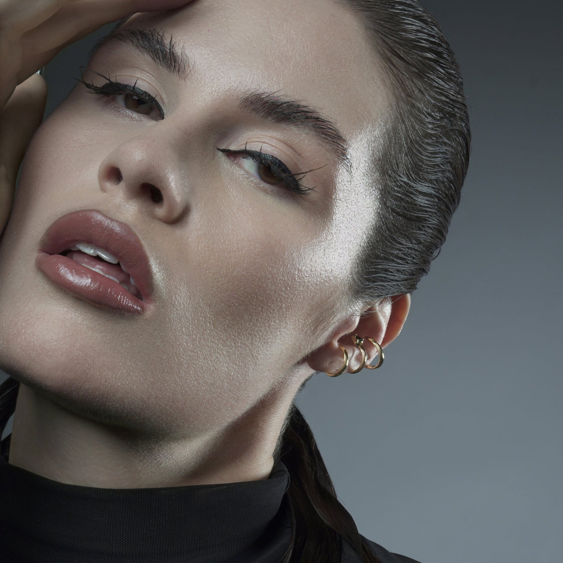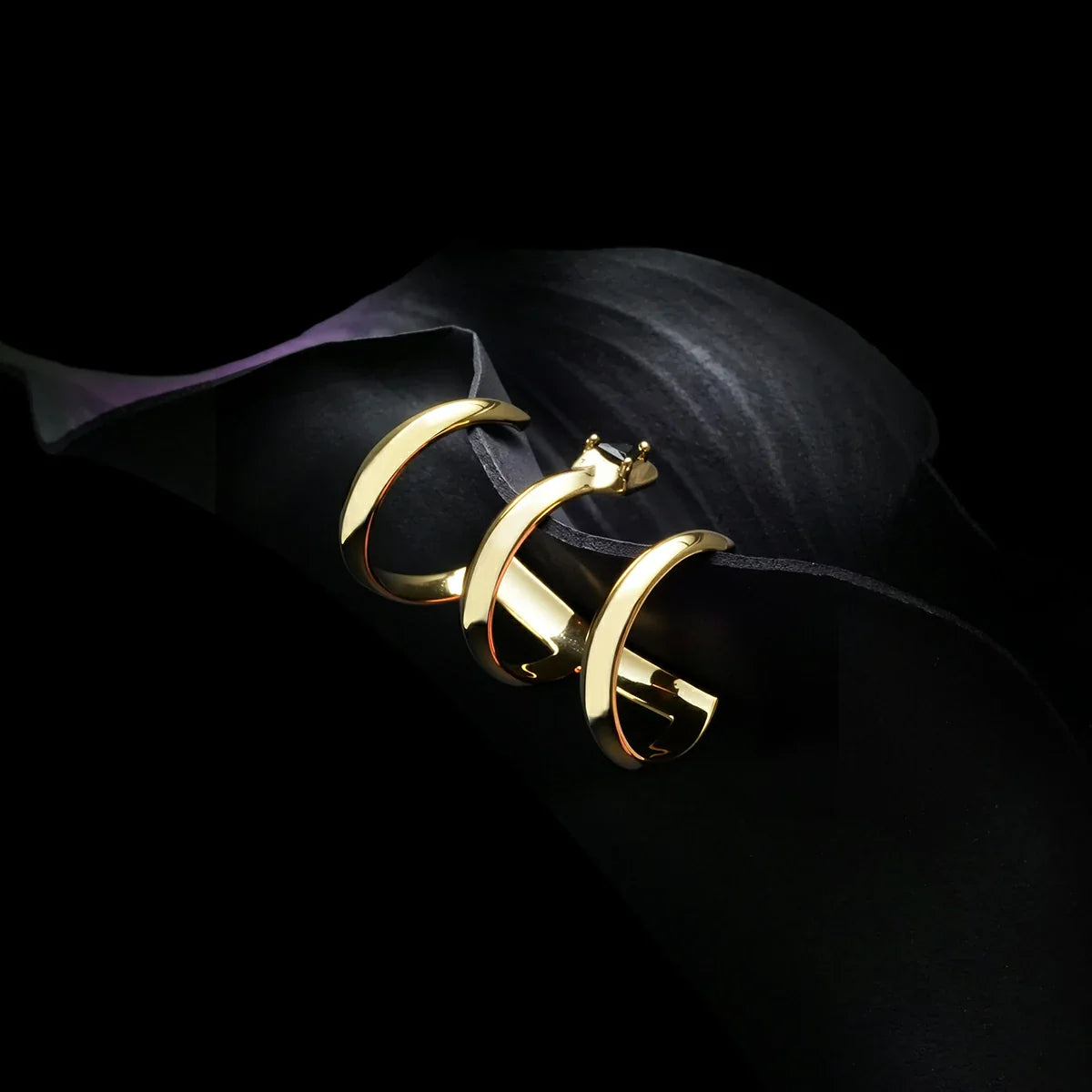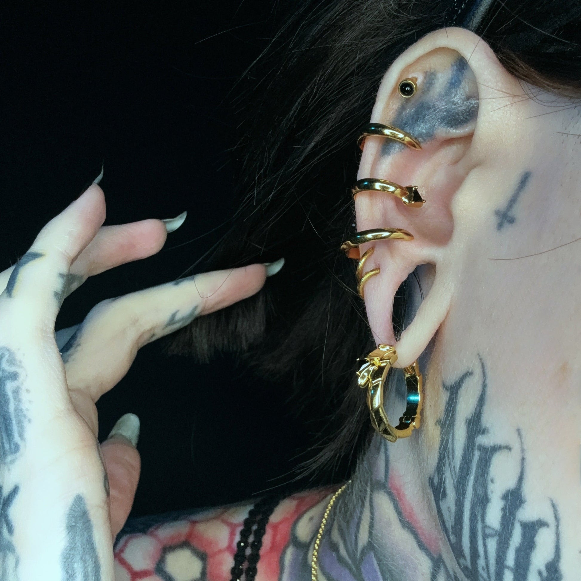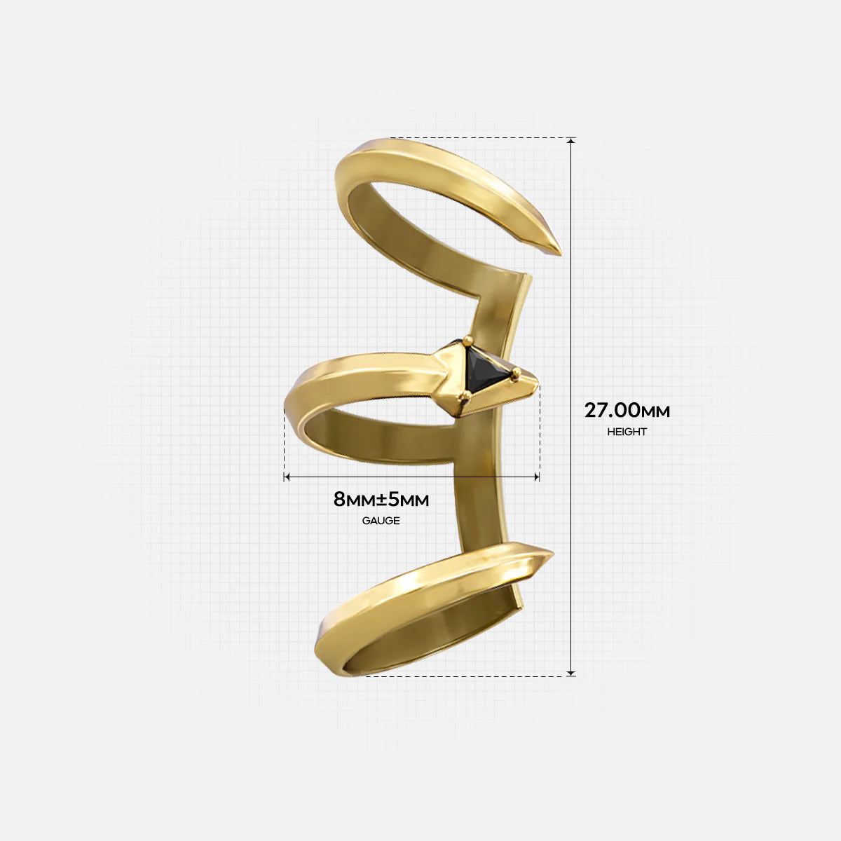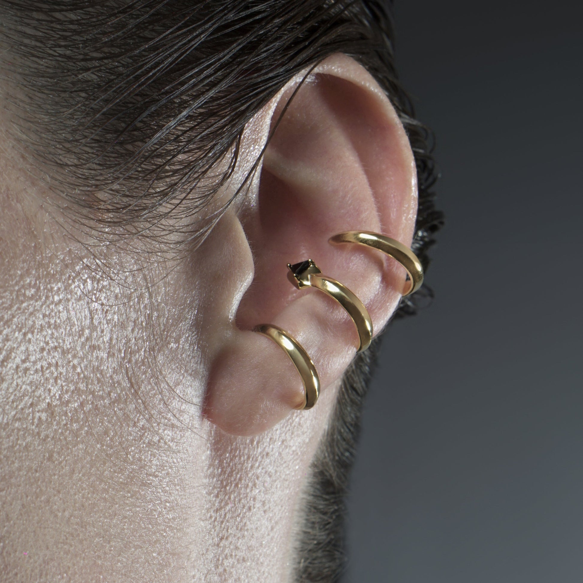 A sculptural ear cuff with an open front where two black pyramid studs face in deliberate balance. The firm arc hugs the outer ear and draws the gaze, part contour and part signal.
