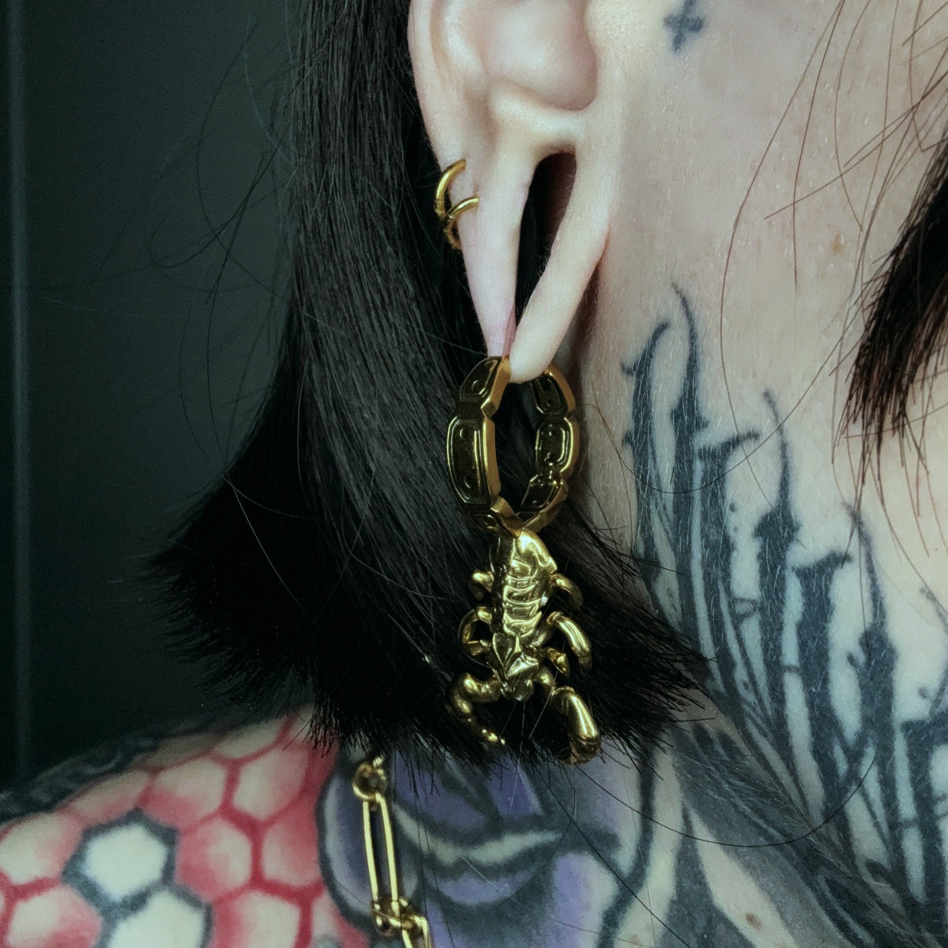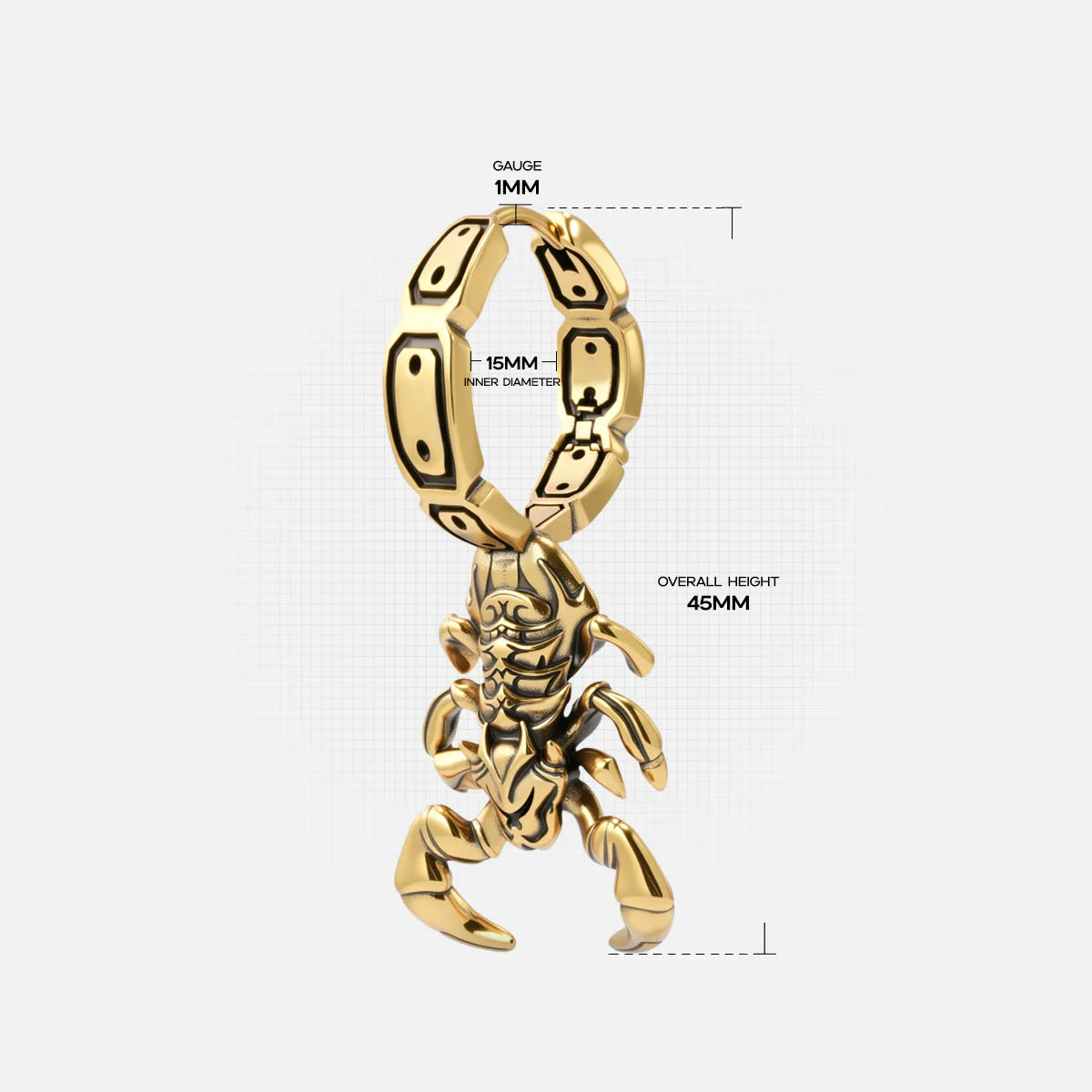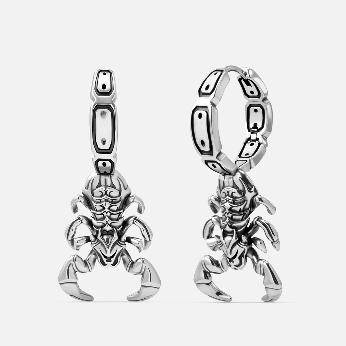 Venom Scorpion Earrings Detailed three dimensional scorpion design with segmented hoop and dark accents, creating a lifelike and fierce profile. This item is sold as a pair.