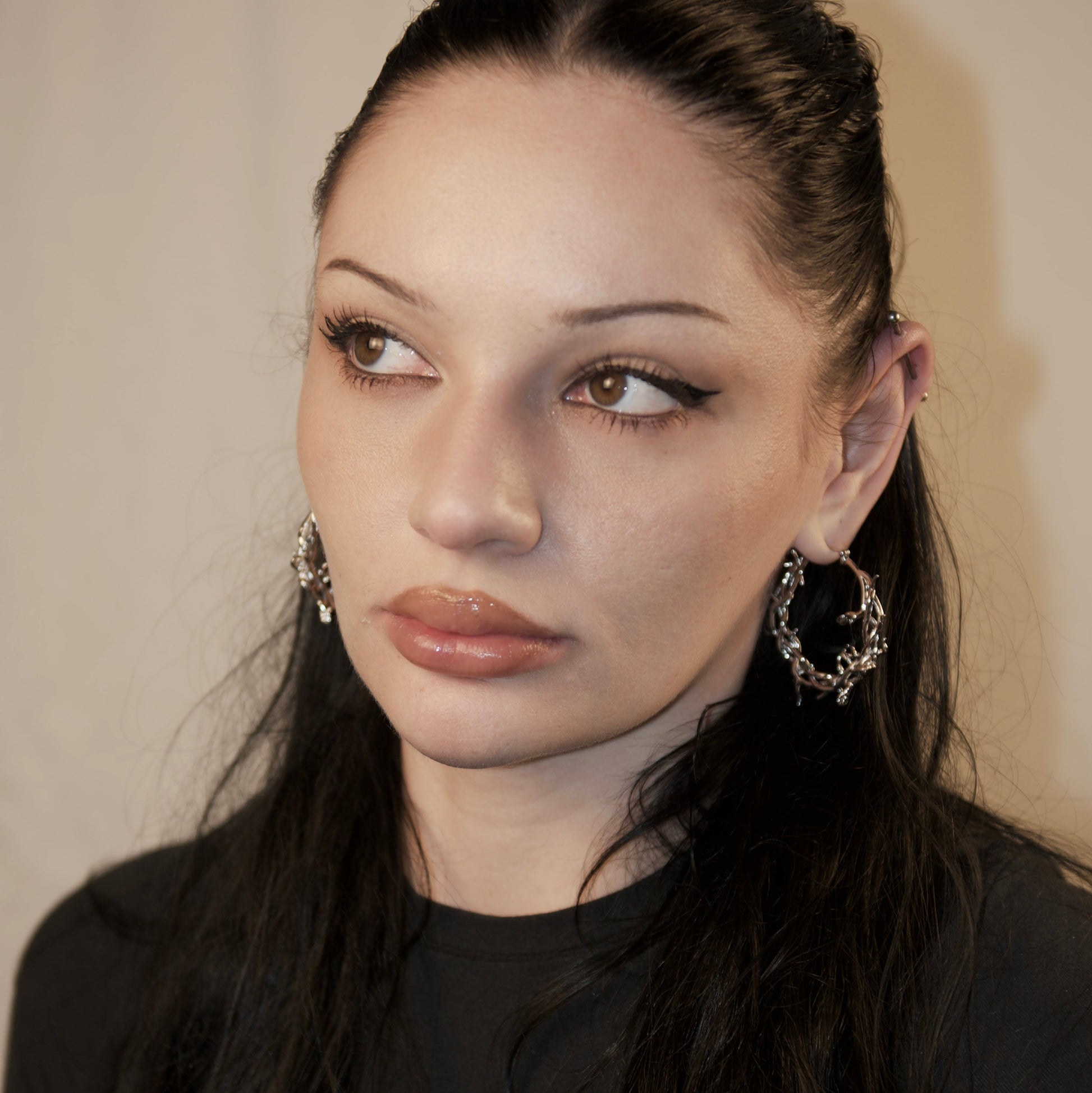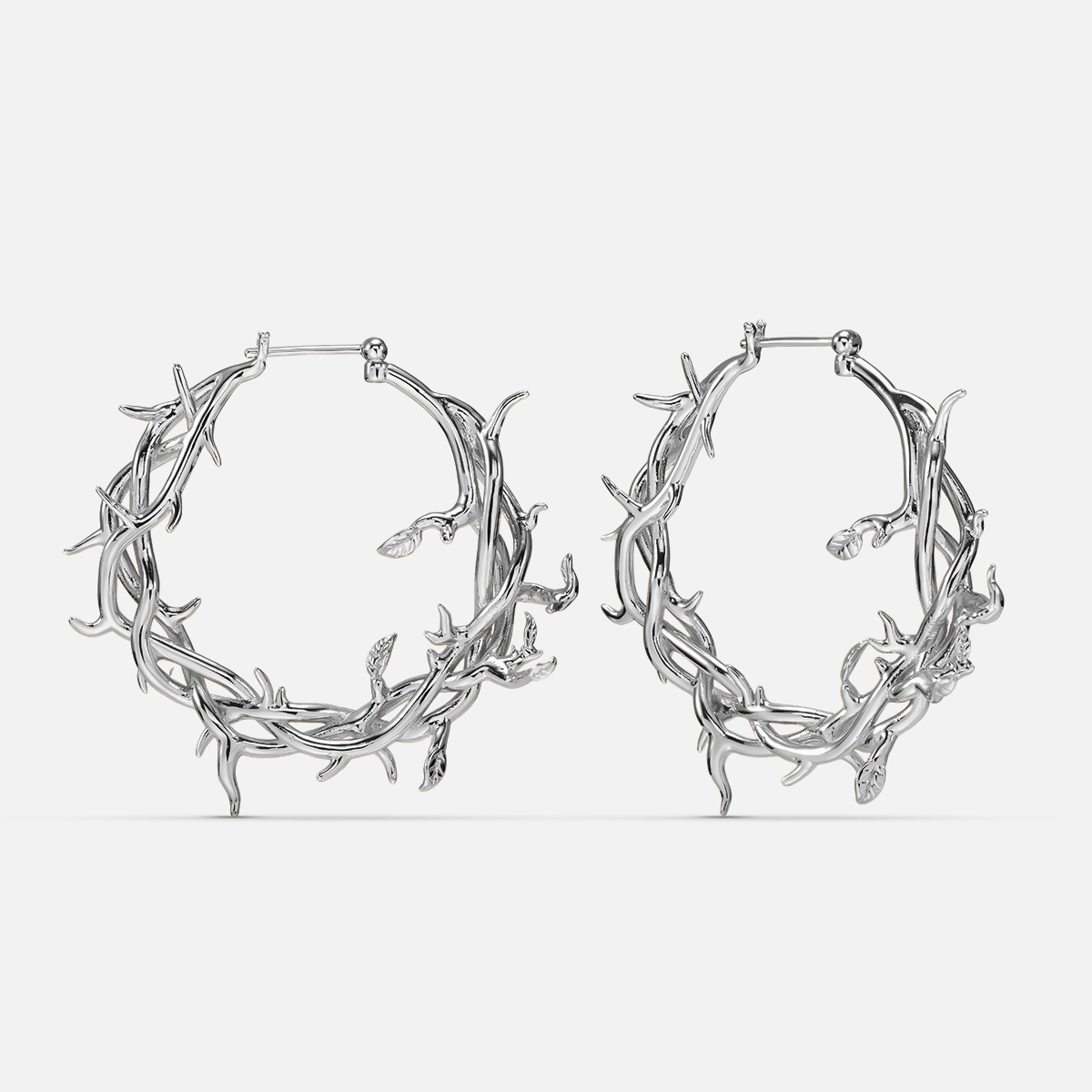 Crafted in high-polish silver, these thorny hoop earrings echo twisted vines and organic curves, forming a bold yet elegant silhouette. This item is sold as a pair.